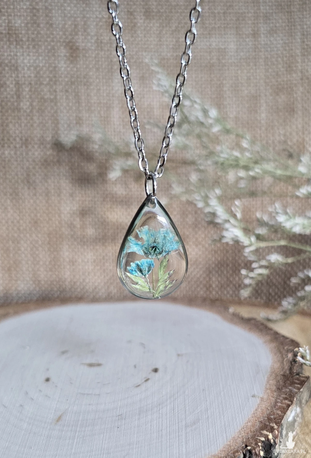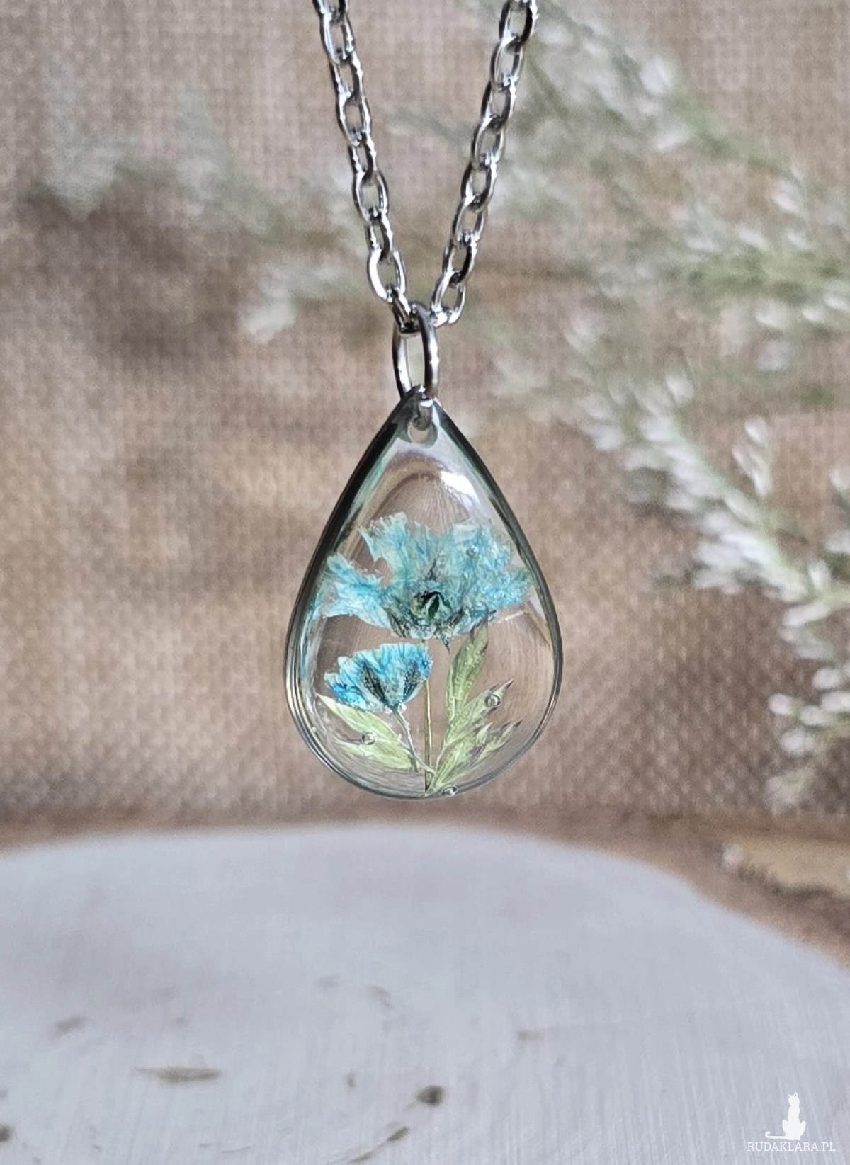 Oferuję Państwu unikalną biżuterię. Zawieszka jest wykonana z suszonych kwiatów i żywicy epoksydowej. Biżuteria jest wspaniałym i oryginalnym prezentem na lata.