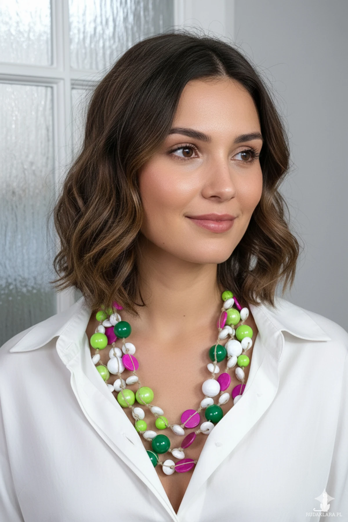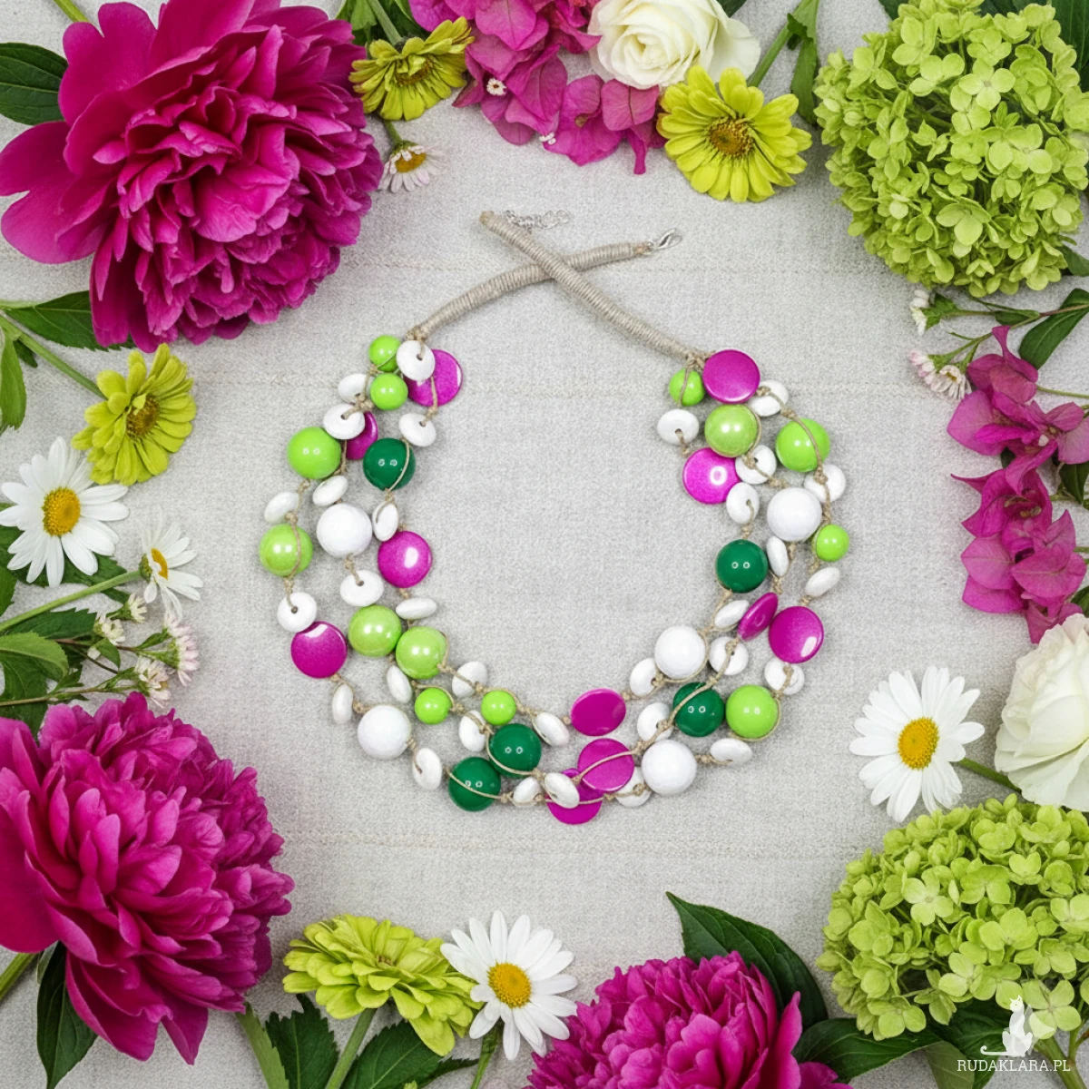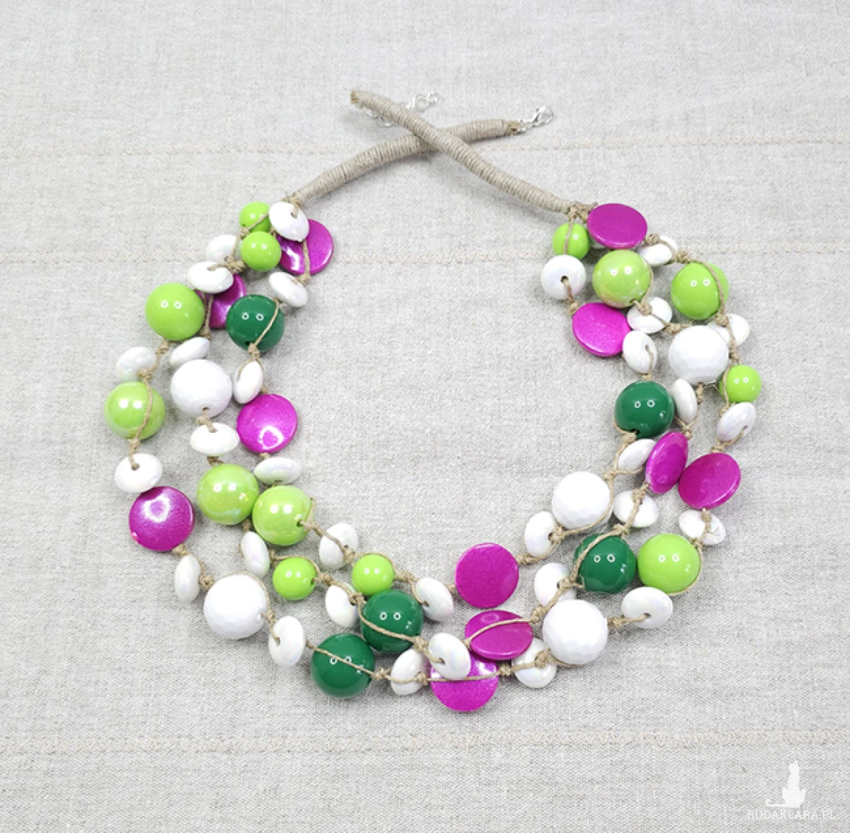 6446 Naszyjnik Maxi – Energetyczne Koraliki (Fuksja, Limonka, Zieleń) na Lnianych Sznurach