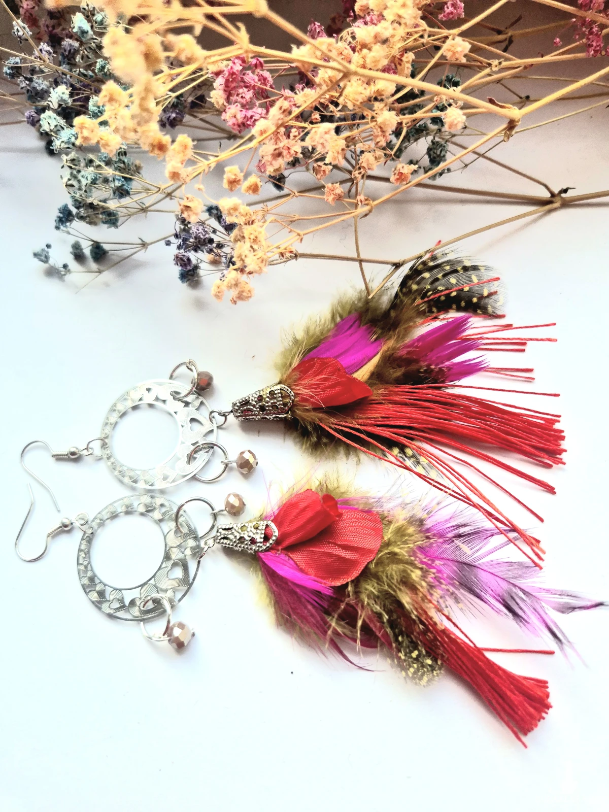 artystyczne kolczyki z kwiatami i piórami handmade- kolczyki lekkie chwosty i pióra w stylu Boho długość około 10 cm polecam leciutkie
