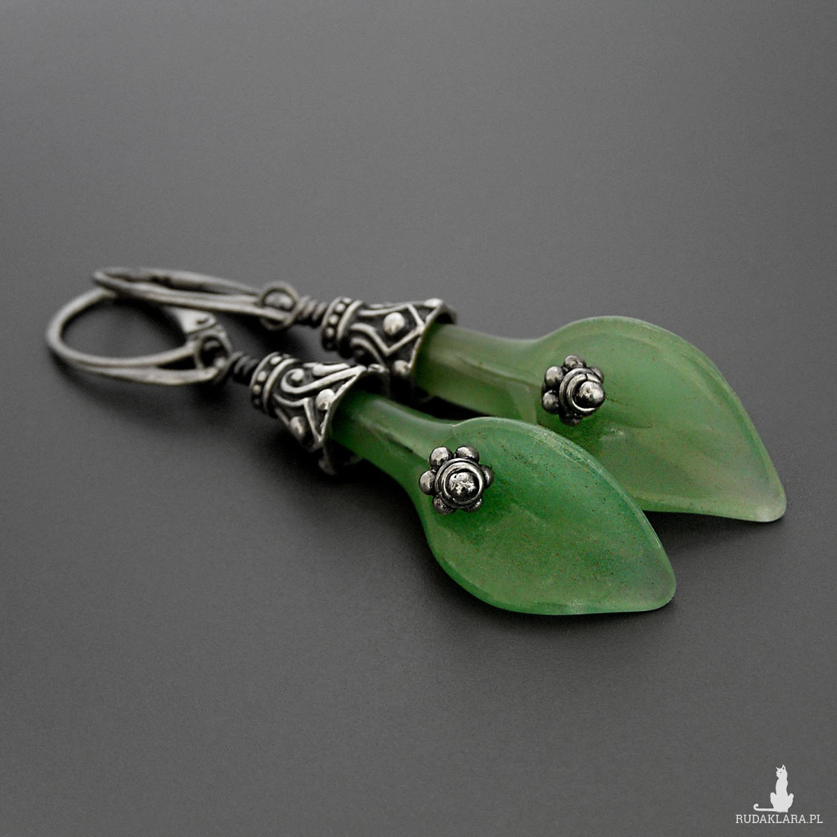 Kolczyki Scarlett, jadeitowe kalie, srebro patynowane, kolekcja Przeminęło z Wiatrem