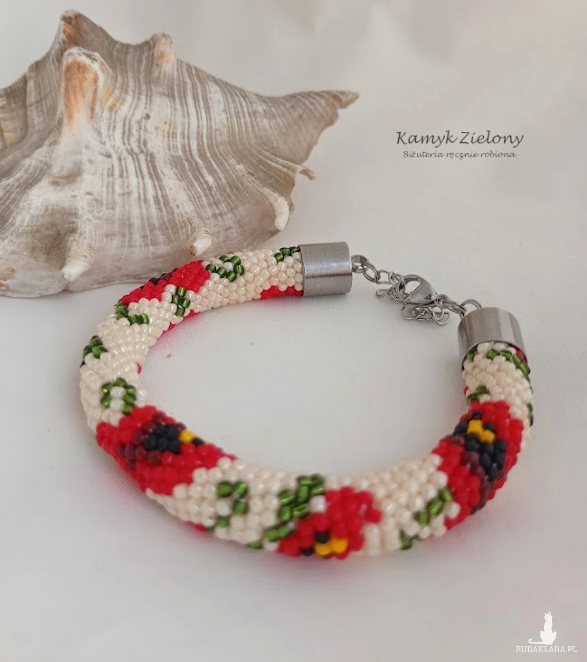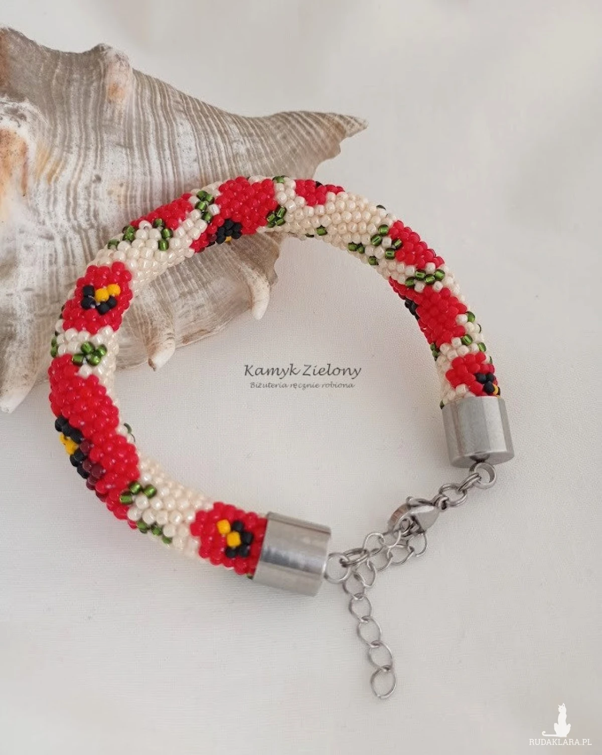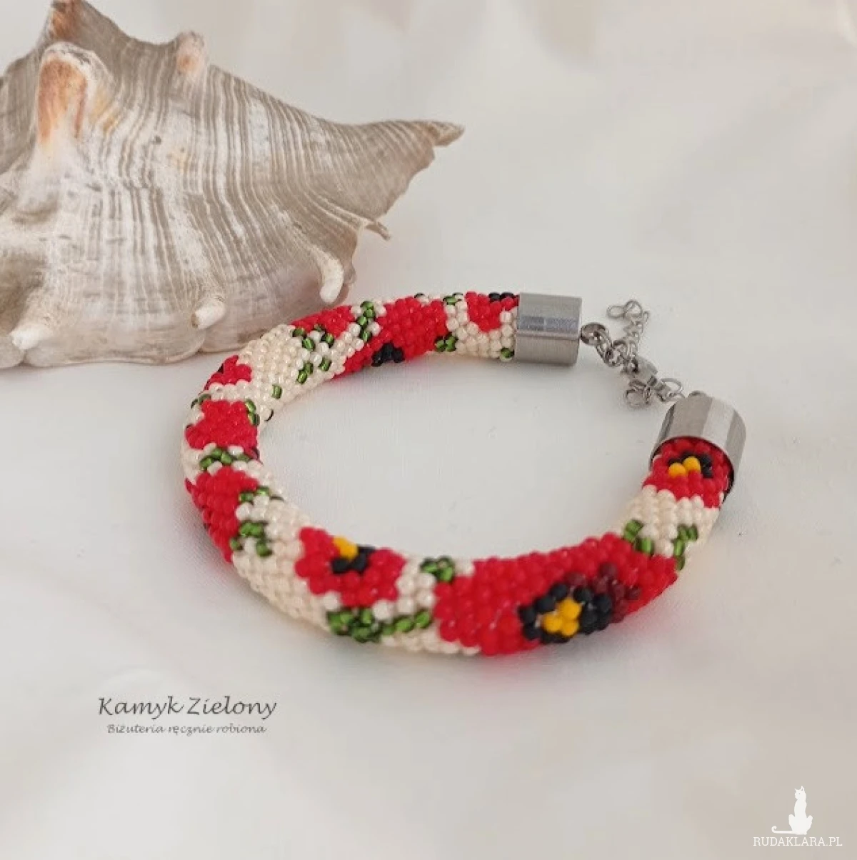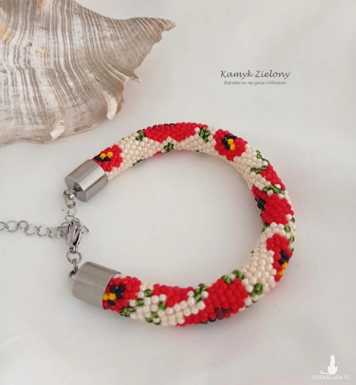 Została wykonana z wysokiej jakości szklanych koralików Toho - na beżowym, lekko błyszczącym tle umieszczono wzorek w duże czerwone maki. Bransoletka świetnie sprawdzi się jako samodzielna ozdoba, ale można ją również połączyć z dostępnym w innej ofercie naszyjnikiem w czerwone maki, czy z "makowymi" kolczykami.