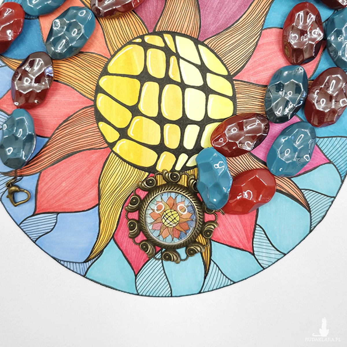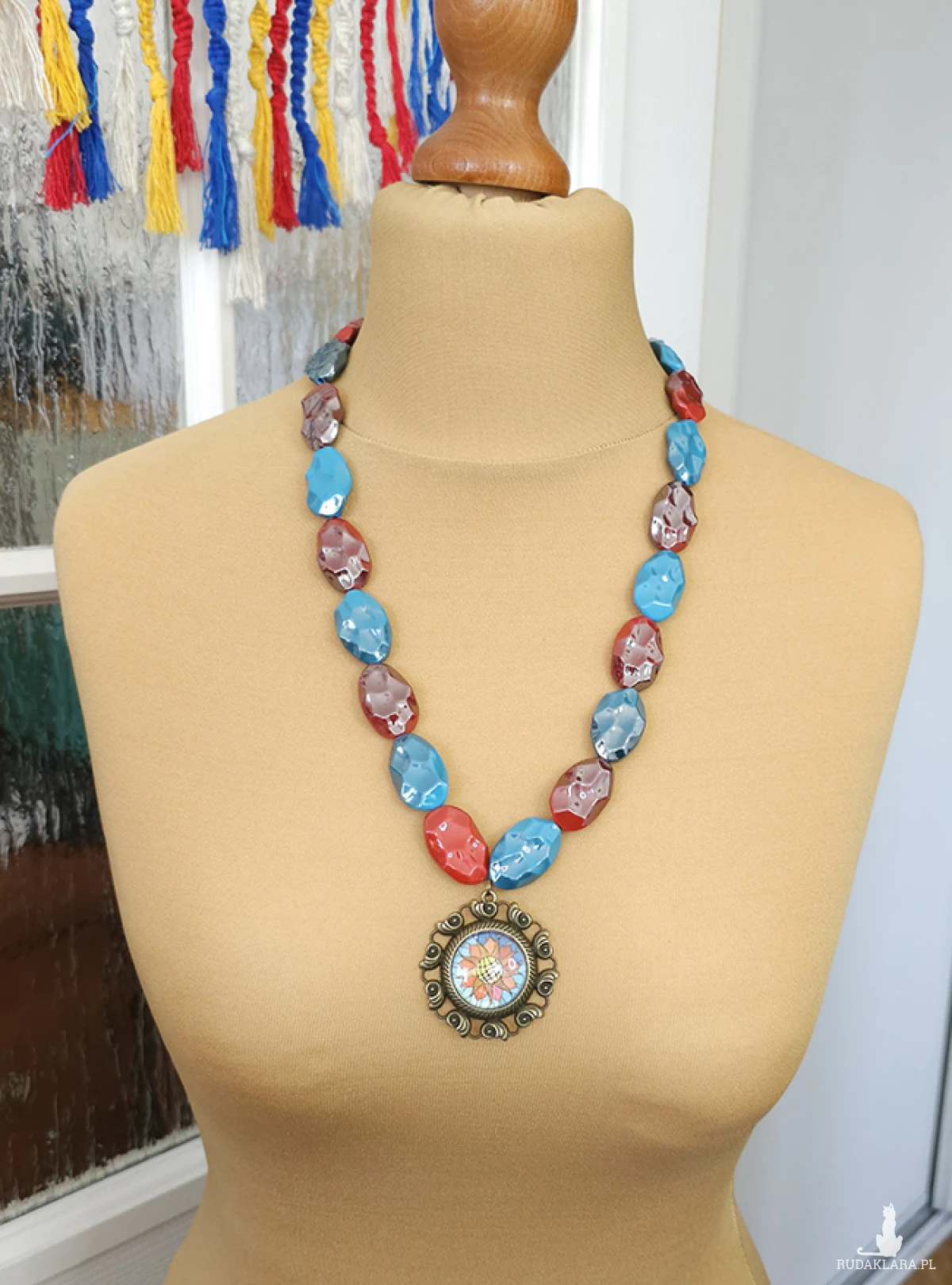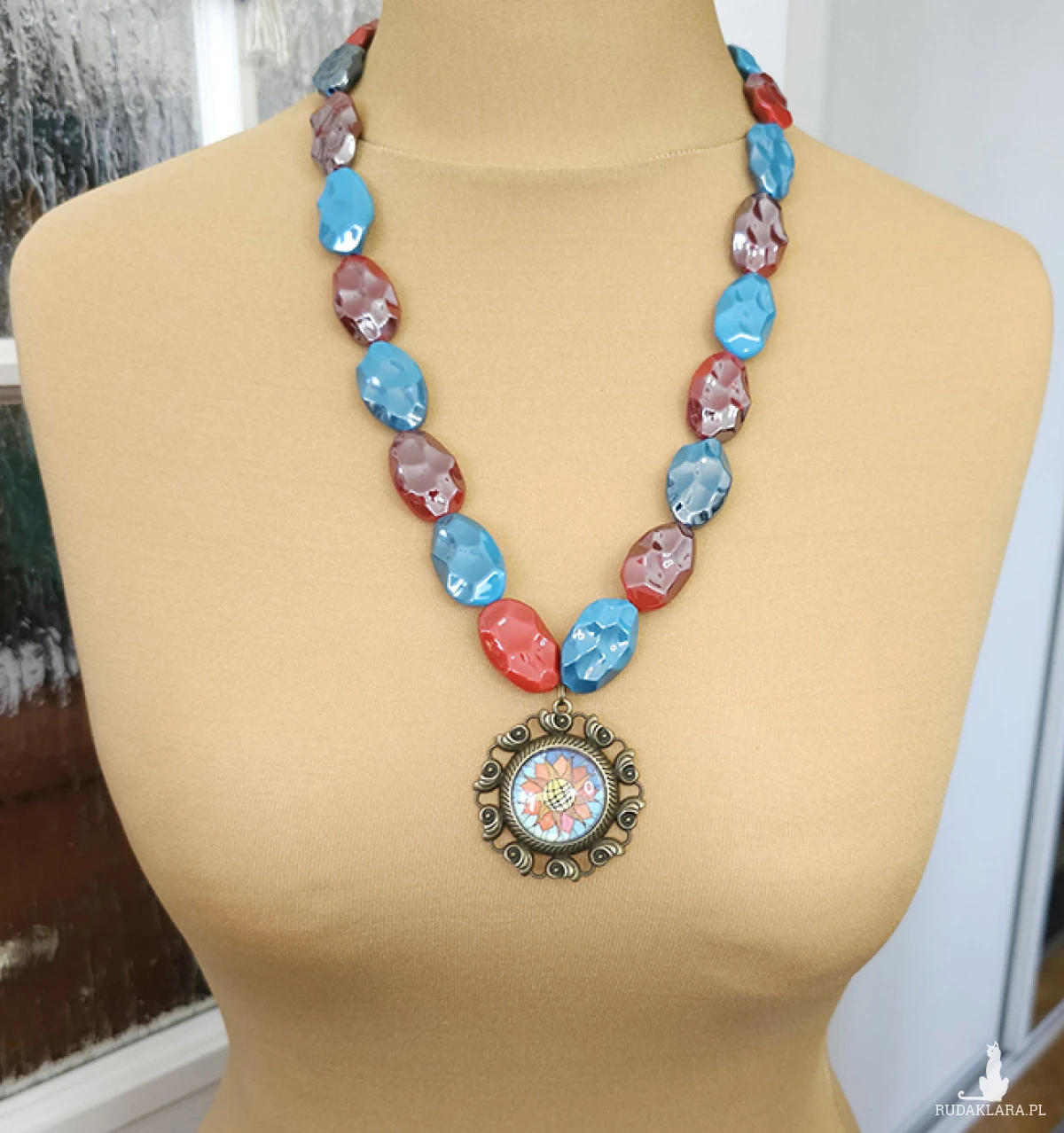 Naszyjnik wykonany z dużych akrylowych, platerowanych korali (30 mm) i fragmentu rysunku mojego autorstwa ukrytego za szkłem w wisiorku.