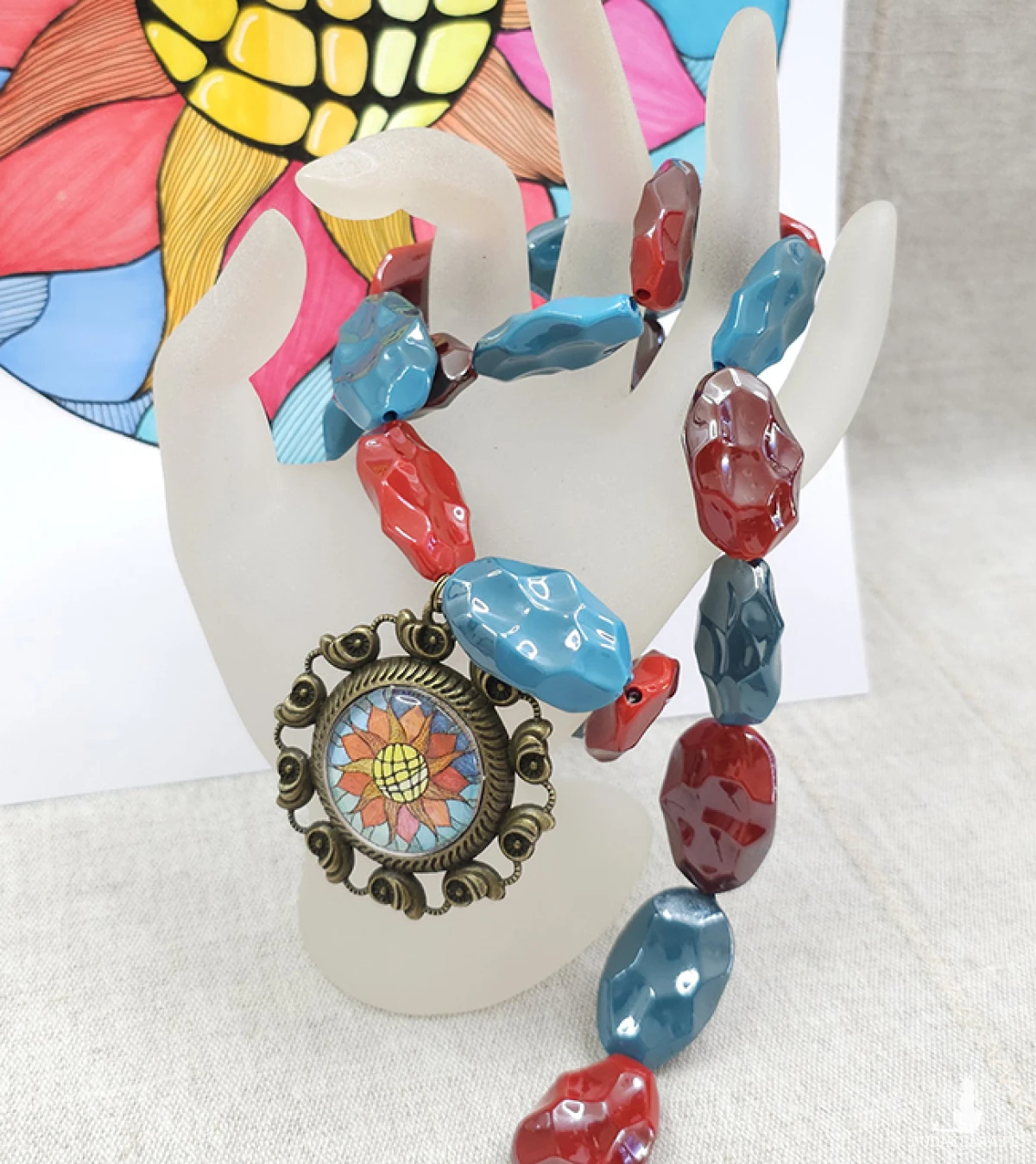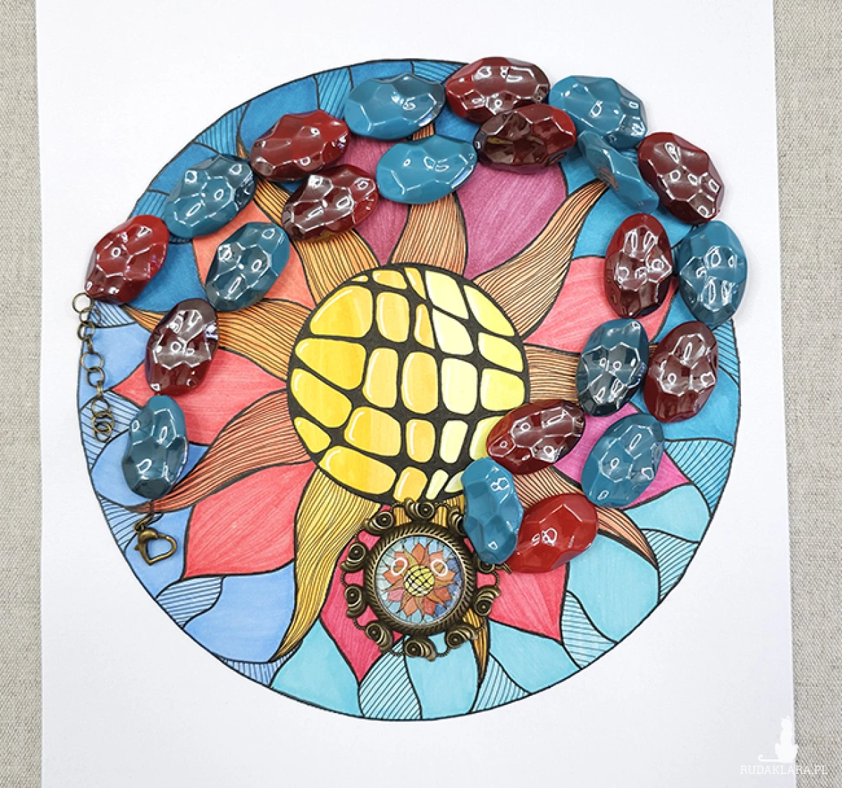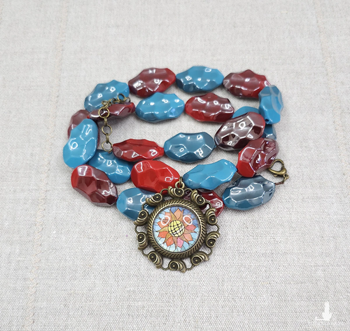 Naszyjnik wykonany z dużych akrylowych, platerowanych korali (30 mm) i fragmentu rysunku mojego autorstwa ukrytego za szkłem w wisiorku.