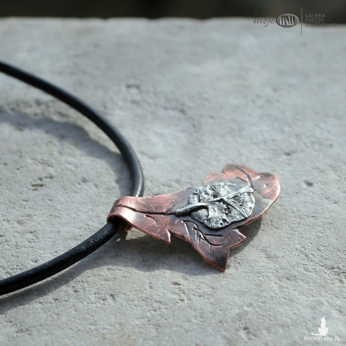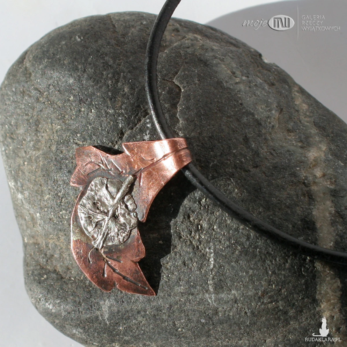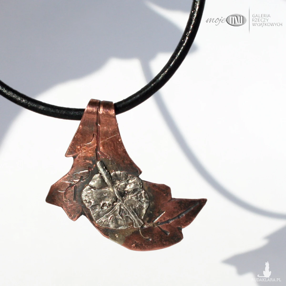 Wisior z miedzi i srebra w formie stylizowanego liścia. Wisior zawieszony jest na czarnym skórzanym rzemieniu o grubości 3 mm i długości ok. 50 cm, końcówki rzemienia i zapięcie ze stali chirurgicznej.