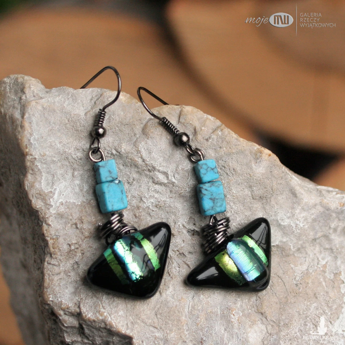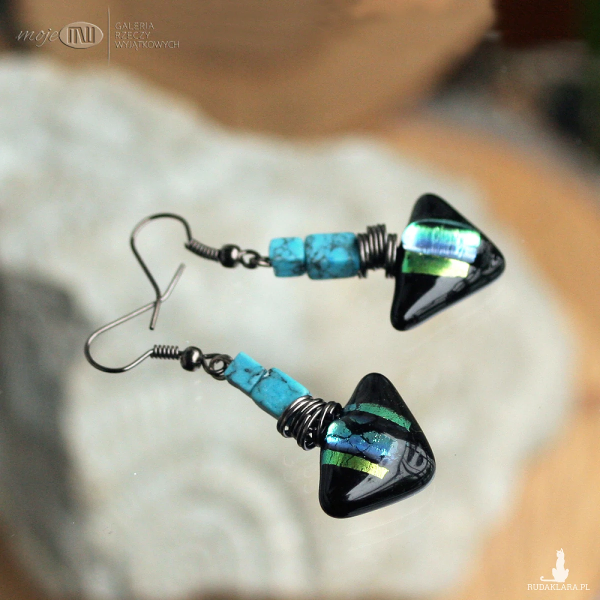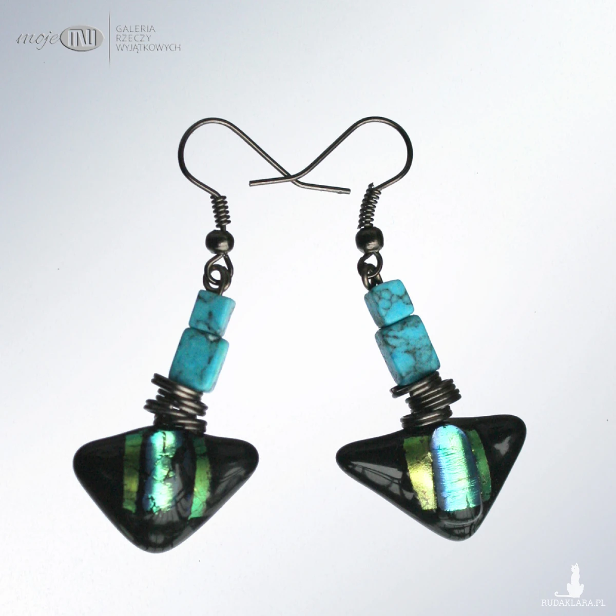 Szklane trójkąty wykonane przeze mnie metodą fusingu (czyli stapiania szkła w wysokich temperaturach) częściowo ze szkła dichroicznego, które opalizuje w świetle.