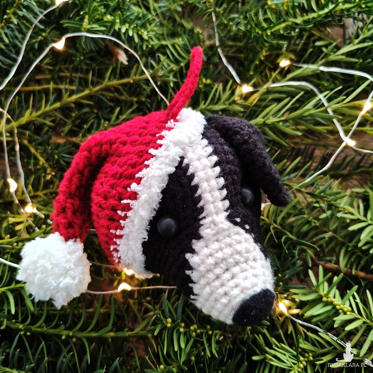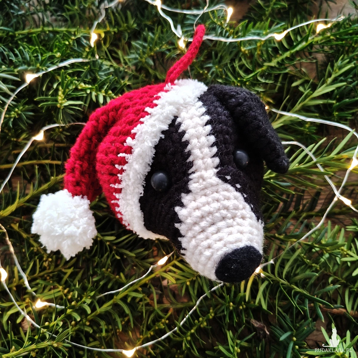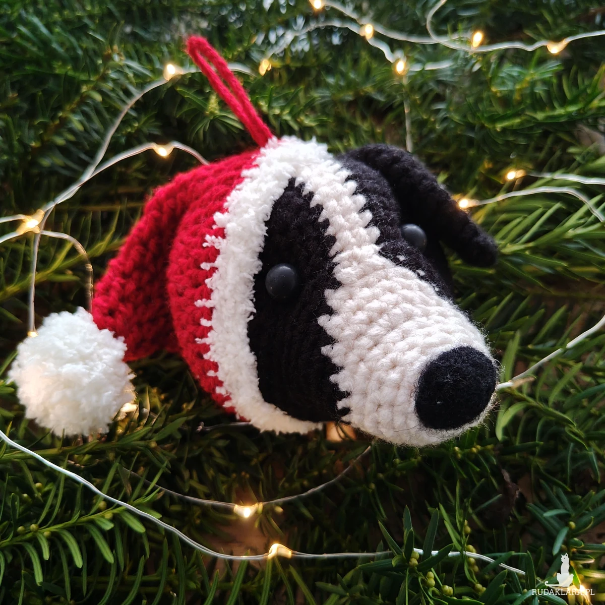 Wykonana z miękkiej włóczki i ubrana w świąteczną czerwoną czapkę Mikołaja ozdoba wniesie ciepło, charakter i świąteczną atmosferę do Twojego wnętrza lub zaskoczy miłośnika psów przemyślanym, ręcznie robionym prezentem, który będzie dla niego pamiątką przez lata.