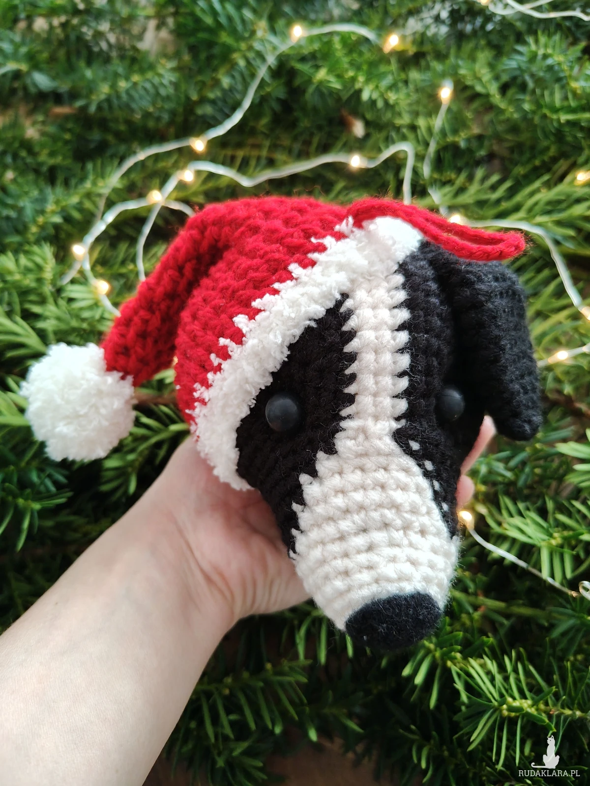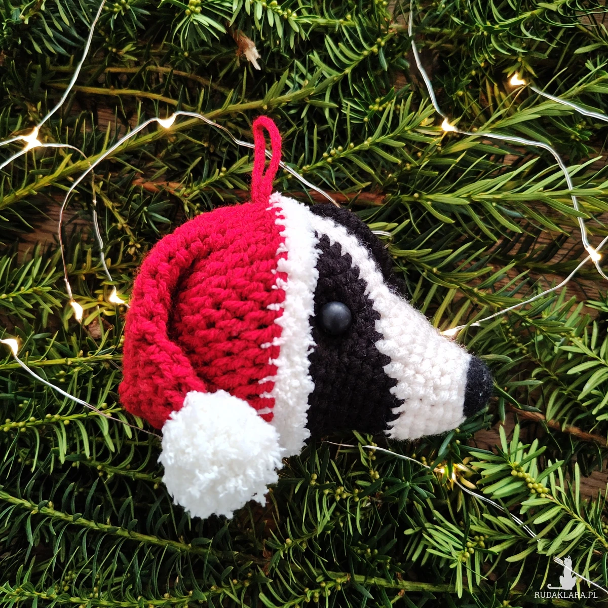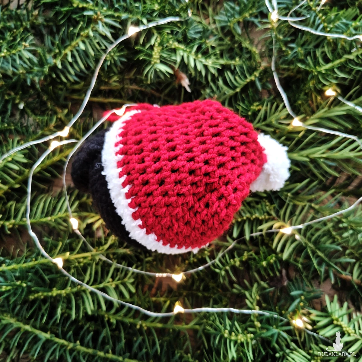 Wykonana z miękkiej włóczki i ubrana w świąteczną czerwoną czapkę Mikołaja ozdoba wniesie ciepło, charakter i świąteczną atmosferę do Twojego wnętrza lub zaskoczy miłośnika psów przemyślanym, ręcznie robionym prezentem, który będzie dla niego pamiątką przez lata.
