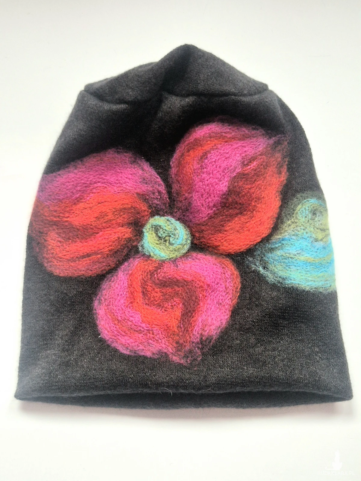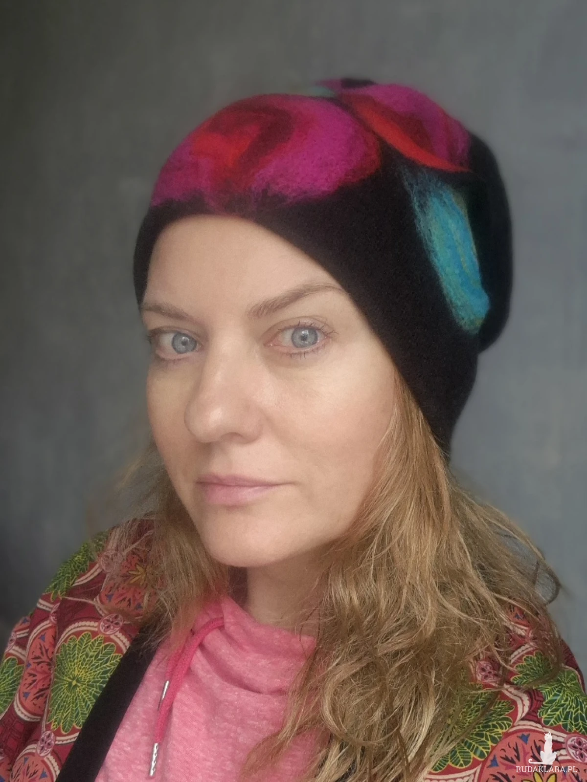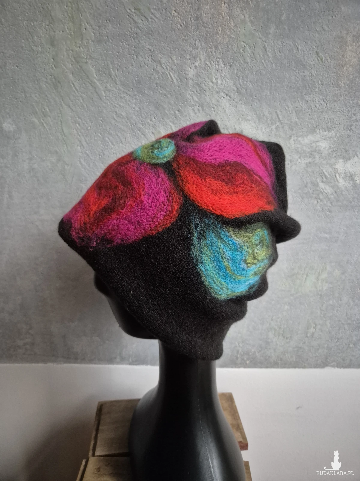czapka wełniana filcowana zimowa czarna handmade w kwiaty na podszewce-- rozmiar uniwersalny, wełniana, filcowana wełną merynosów, bardzo ciepła, fantastyczna, miła, miękko układa się na głowie, niesamowicie zwraca uwagę, doskonałą na codzienne noszenie jak i na prezent, zawsze możesz ją założyć po basenie i przeżyjesz,box w1