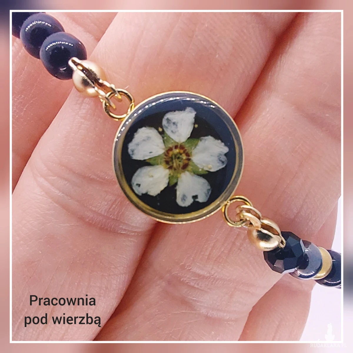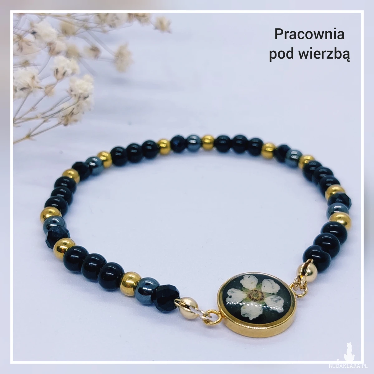 Stworzona ręcznie z kamieni naturalnych, na wygodnej gumce jubilerskiej, z elementami stali szlachetnej i oczkiem z kwiatem białej tawuły.
