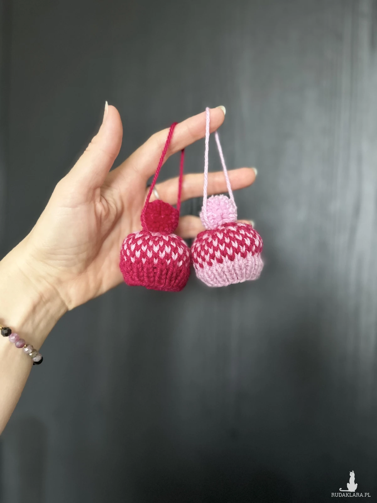Zestaw 2 szt. zawieszek choinkowych, mini-czapeczek, wykonanych ręcznie na drutach z wełny owczej.