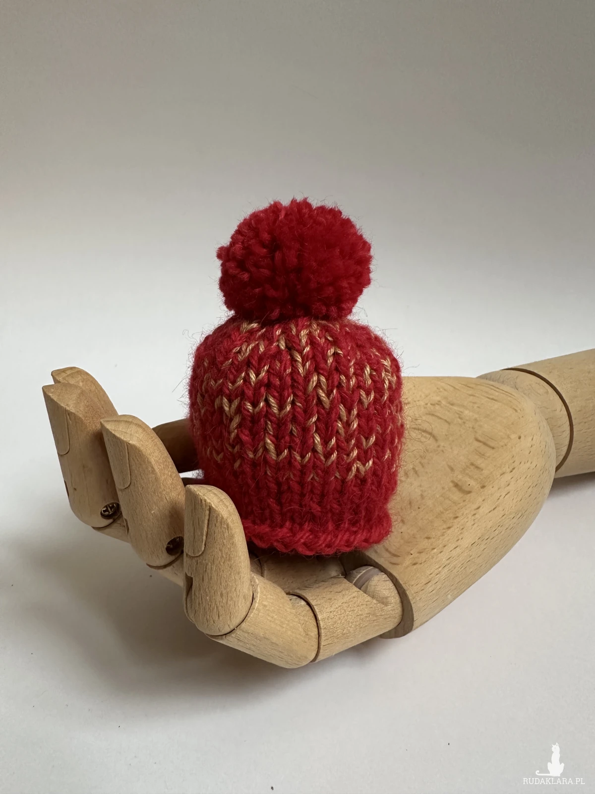Ta ozdoba choinkowa mini-czapeczka, wykonana ręcznie na drutach z naturalnych włóczek składających się z wełny, alpaki oraz bawełny.