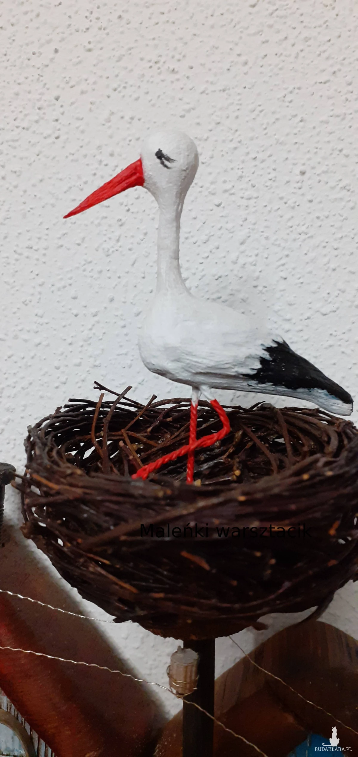 Praca w całości wykonana własnoręcznie z przypadkowej ramy okiennej, starych desek oraz drewna opałowego. Bocian wyrzeźbiony z drewna sosnowego. Do malowania zostały użyte farby akrylowe oraz pasta woskowa. Całość zabezpieczona jest akrylowym lakierem satynowym.