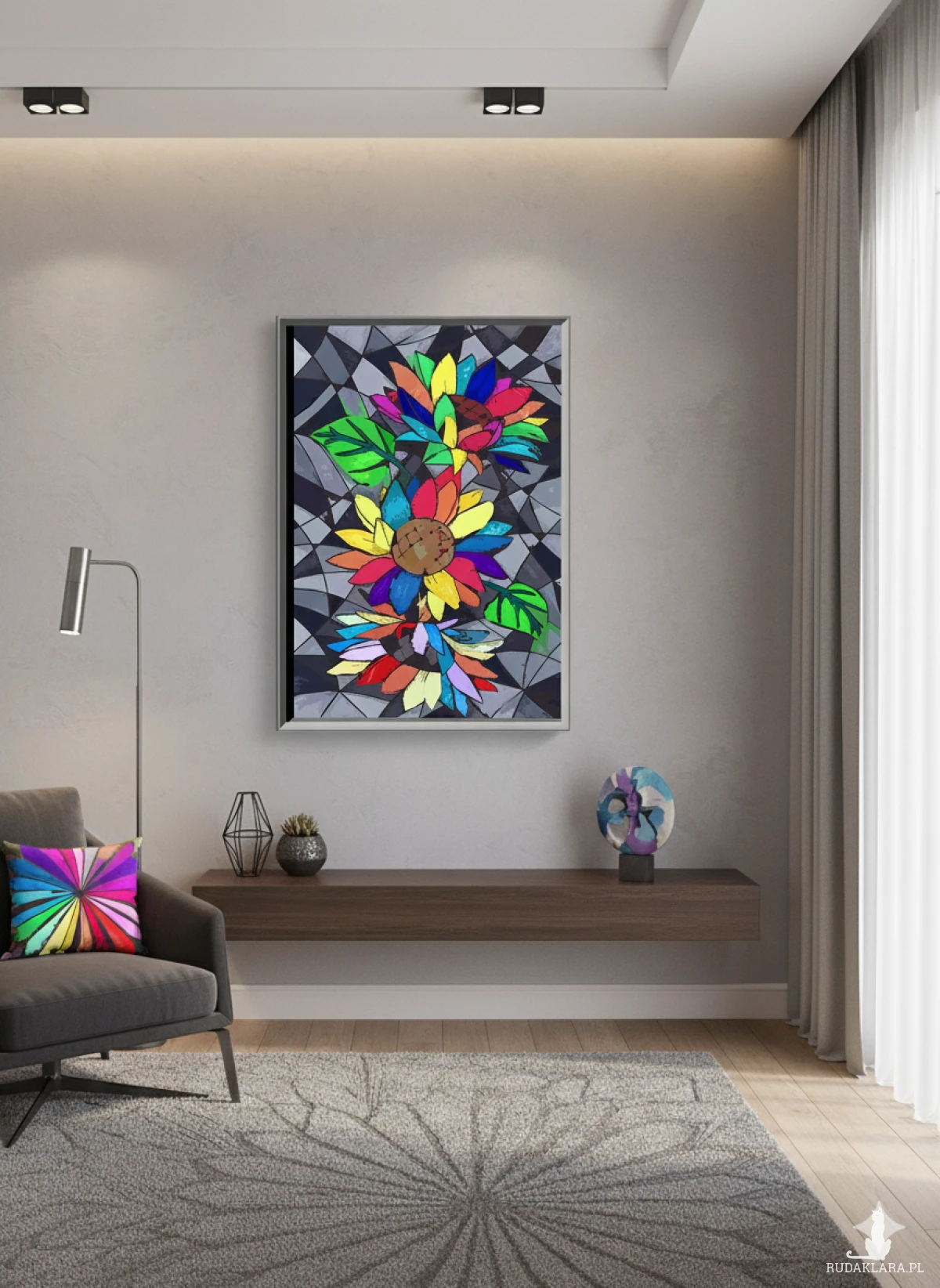 Dekoracyjna ilustracja przedstawiająca trzy stylizowane słoneczniki, z wyraźnymi, kratkowanymi centrami i gęsto ułożonymi płatkami. Cała kompozycja osadzona jest na geometrycznym, mozaikowym tle w odcieniach szarości i czerni, co potęguje kontrast.