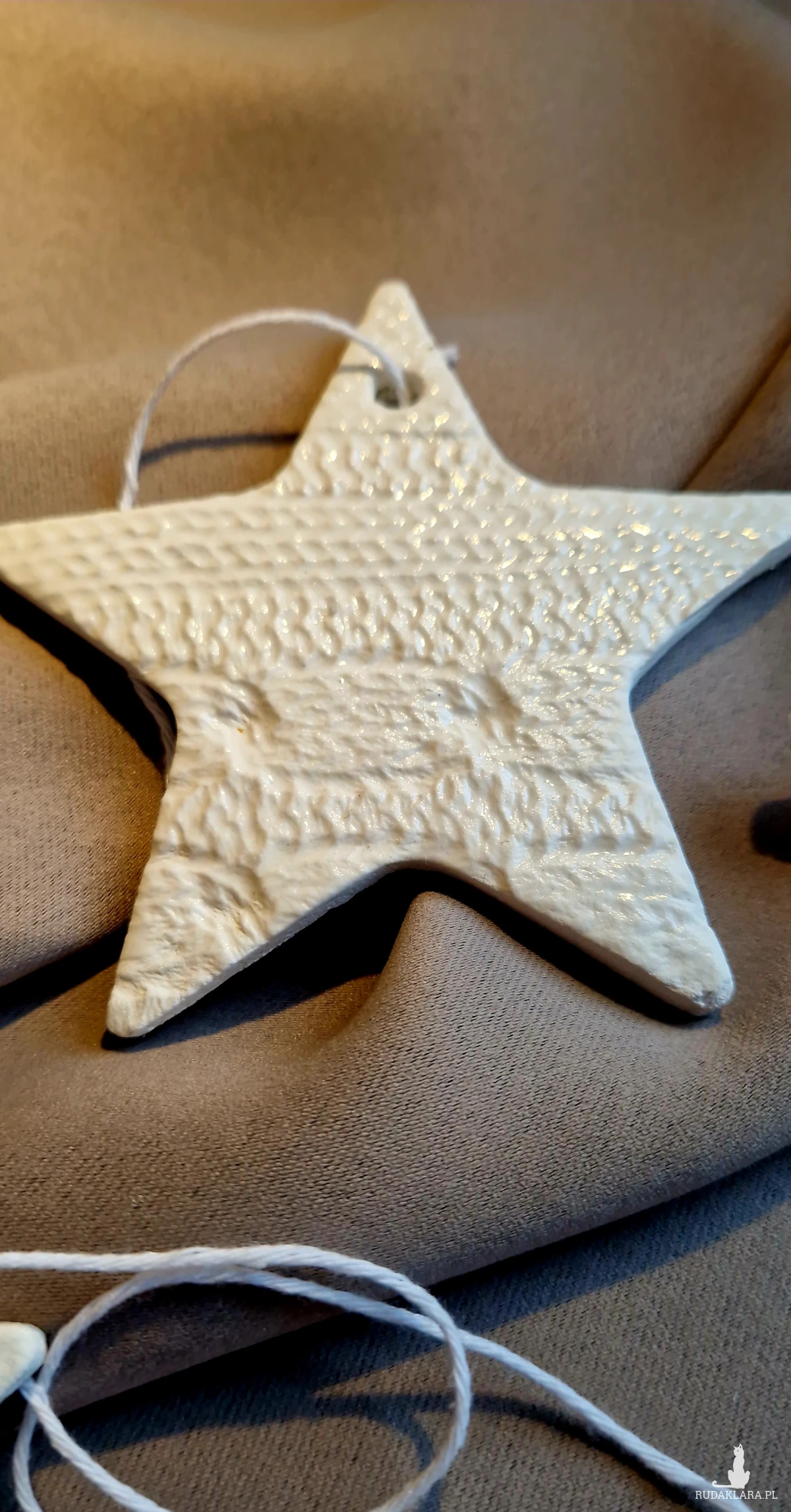 Wyjątkowe zawieszki w kształcie gwiazdek, w dwóch rozmiarach. Każda gwiazdka ma odciśnięty delikatny wzór sweterkowy, który nadaje jej ciepły, świąteczny charakter.