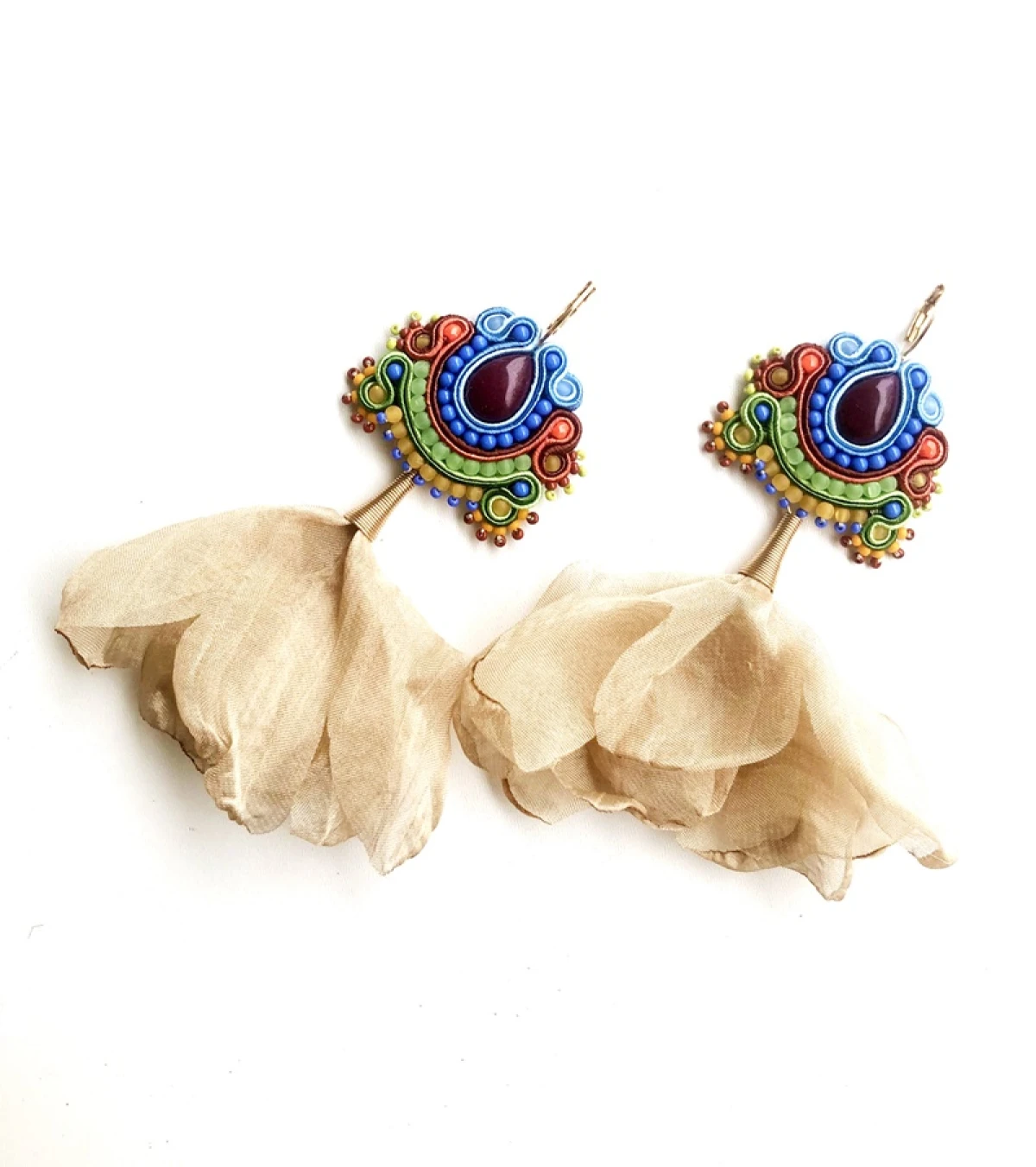 Kolczyki z sutaszu - w połączeniu zieleni, niebieskiego, pomarańczu i brązu z beżowymi kwiatami. Długość ok. 9 cm. Zawieszone na antyalergicznych biglach, możliwość wymiany na klipsy lub sztyfty. Kolczyki wykonywane na indywidualne zamówienie.