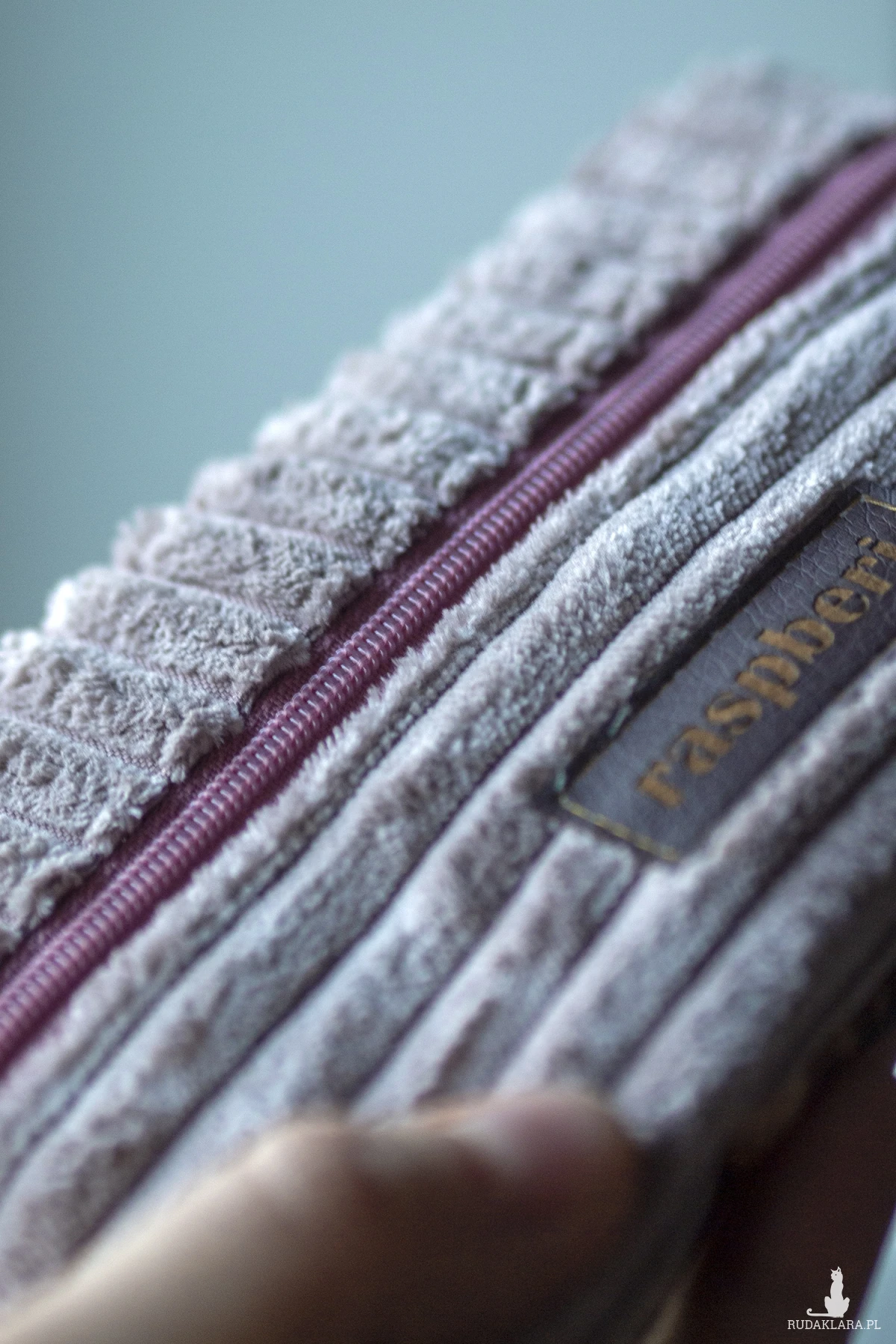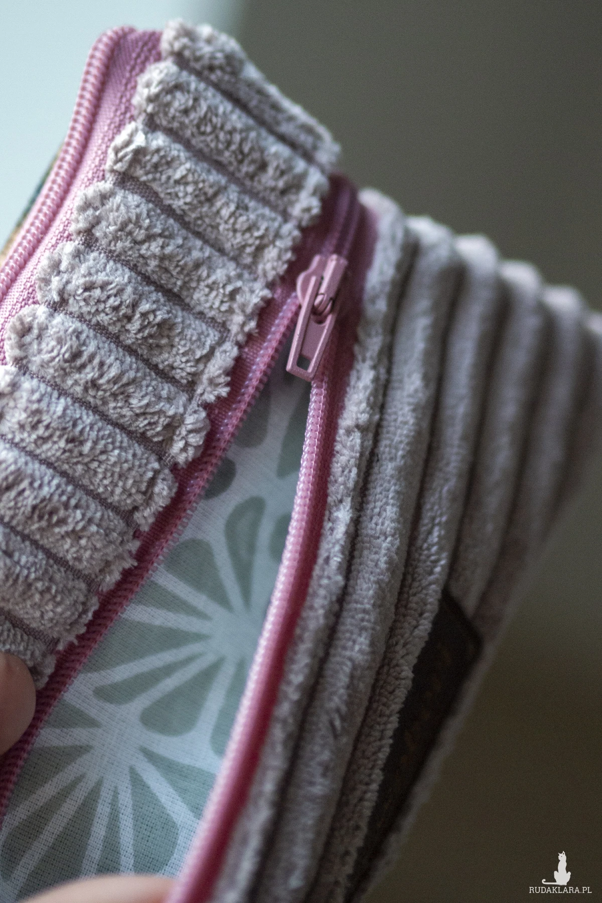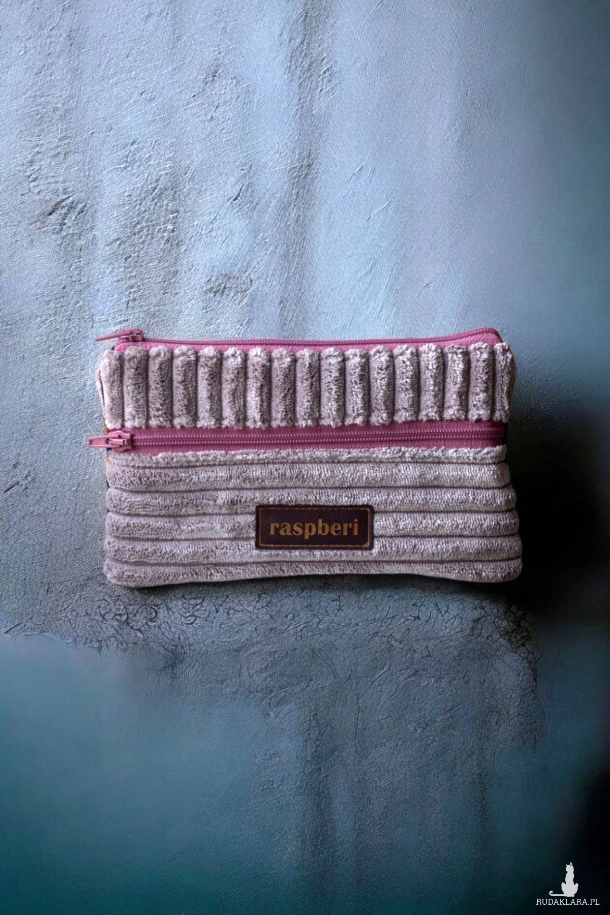 Prosty wodoodporny portfel wykonany z grubego pudroworóżowego sztruksu oraz weluru w panterkę.