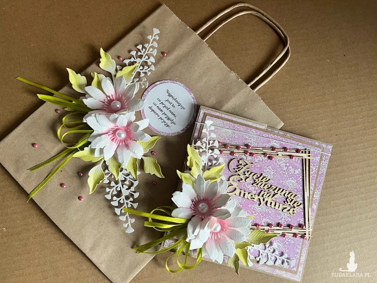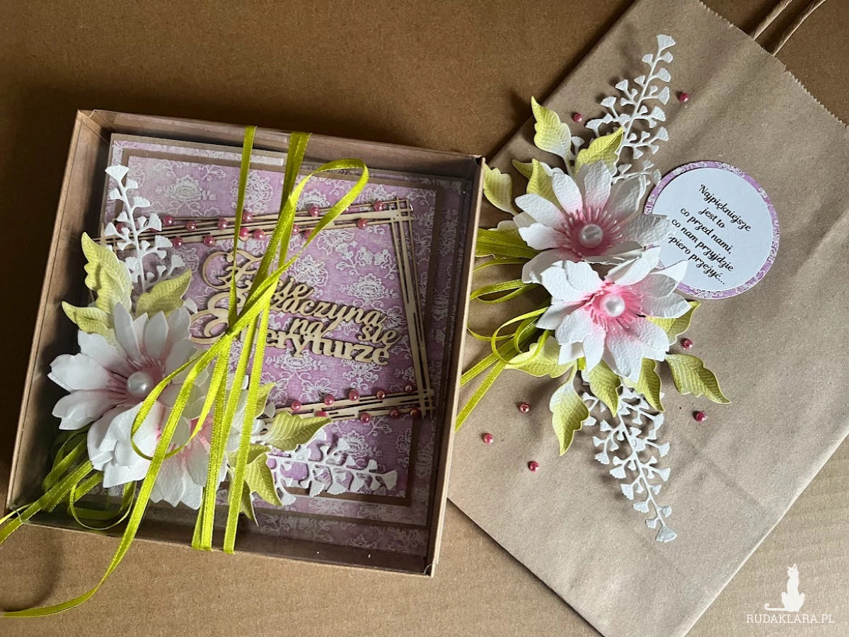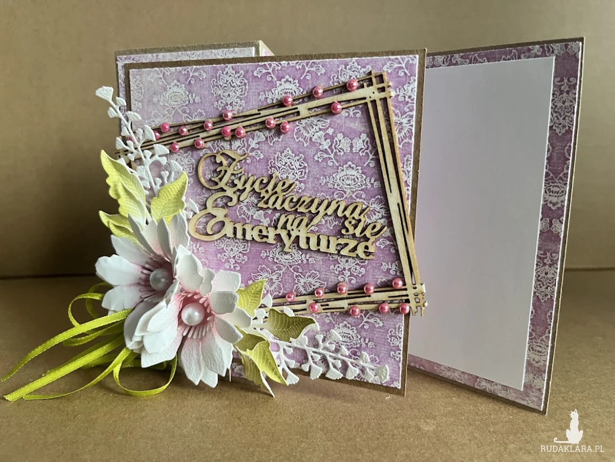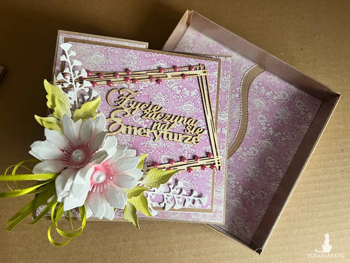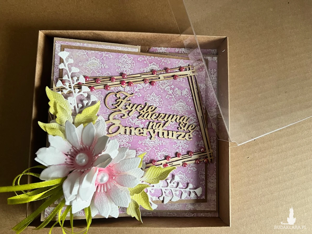 Wyjątkowa,bogato zdobiona kartka z okazji przejścia na emeryturę.Stworzona na bazie papieru kraftowgo z licznymi dodatkami w postaci tekturek oraz kwiatów z papieru ręcznie robionych.Wymiar kartki 14x14cm.Do kartki dołączono pudełko z transparentnym wieczkiem w wymiarze 15,5 x15,5 cm w kolorze eco.Na dnie pudełka umieszczono kieszonkę na małe co nieco a wewnątrz kartki umieszczono karnet na wypisanie własnoręcznie życzeń .W tej postaci komplet dostępny od ręki