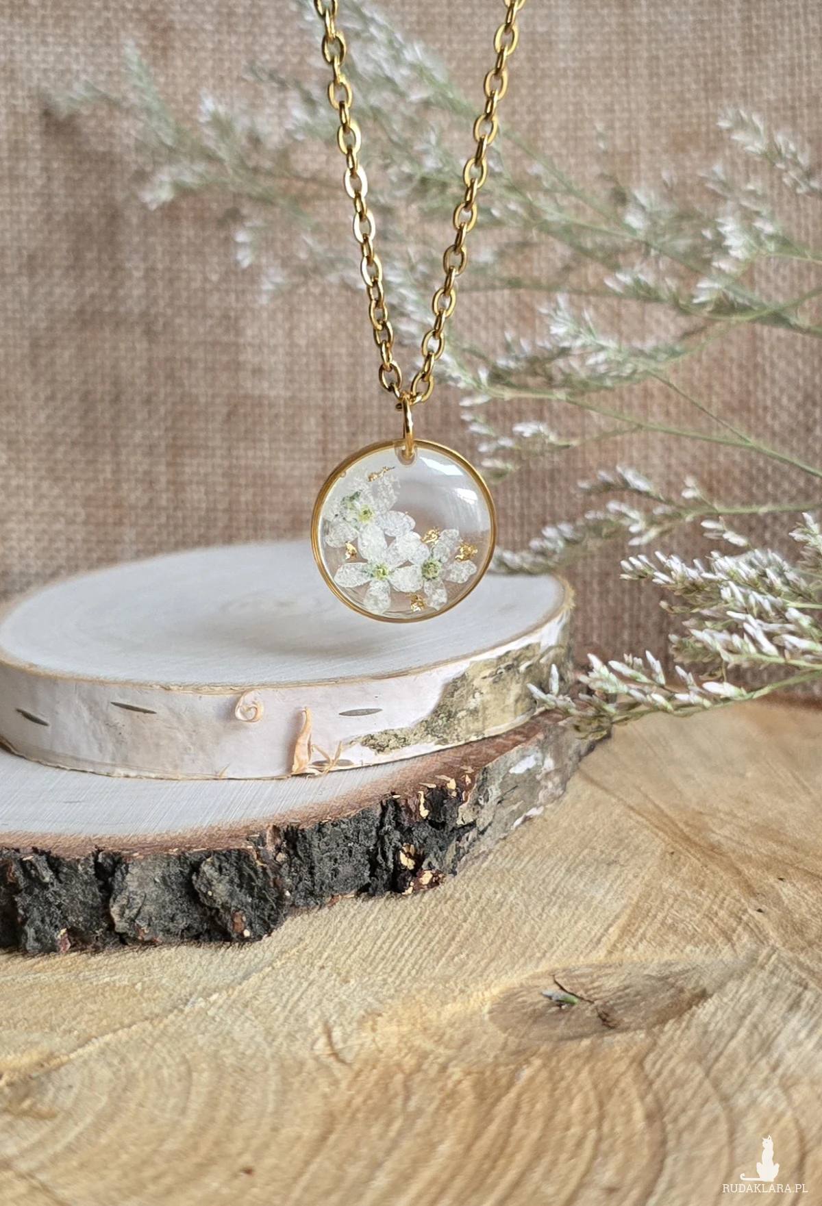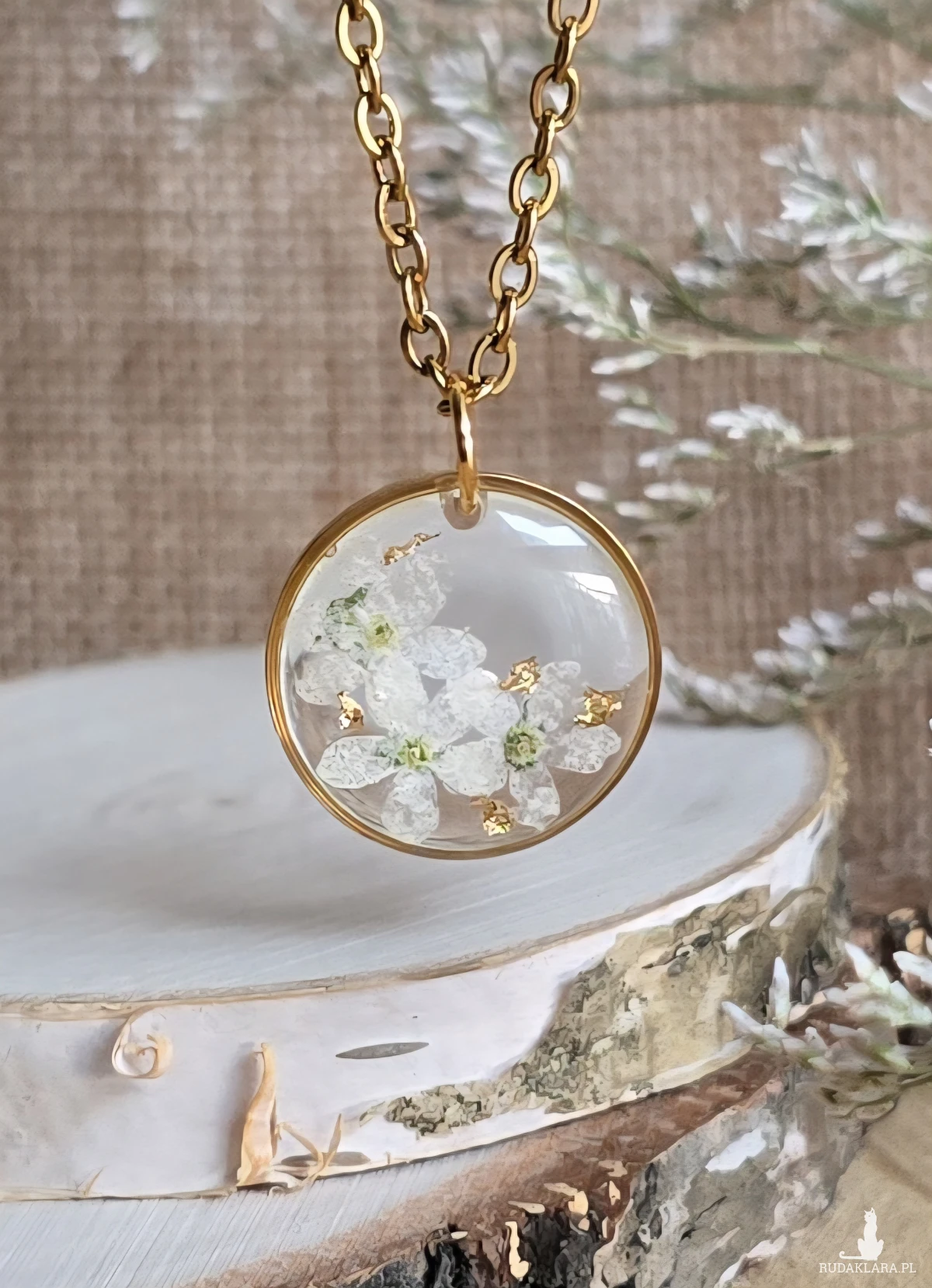 Oferuję Państwu unikalną biżuterię. Zawieszka jest wykonana z suszonych kwiatów i żywicy epoksydowej. Biżuteria jest wspaniałym i oryginalnym prezentem na lata.