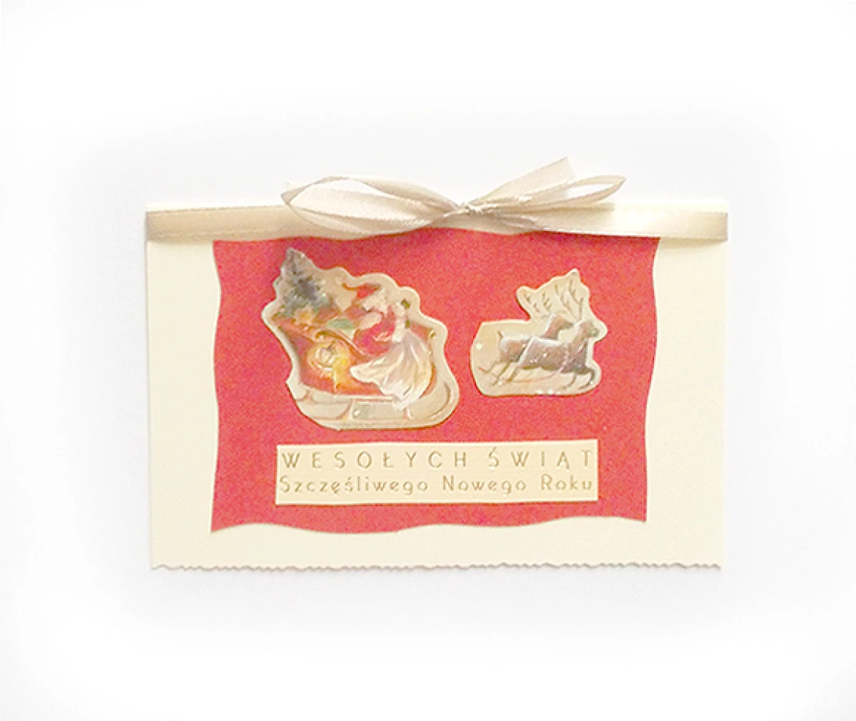 Otwierana kartka z okazji świąt Bożego Narodzenia oraz Nowego Roku, kremowy kartonik, wstążeczka. W środku karnet jest bez życzeń. Dołączona biała koperta.