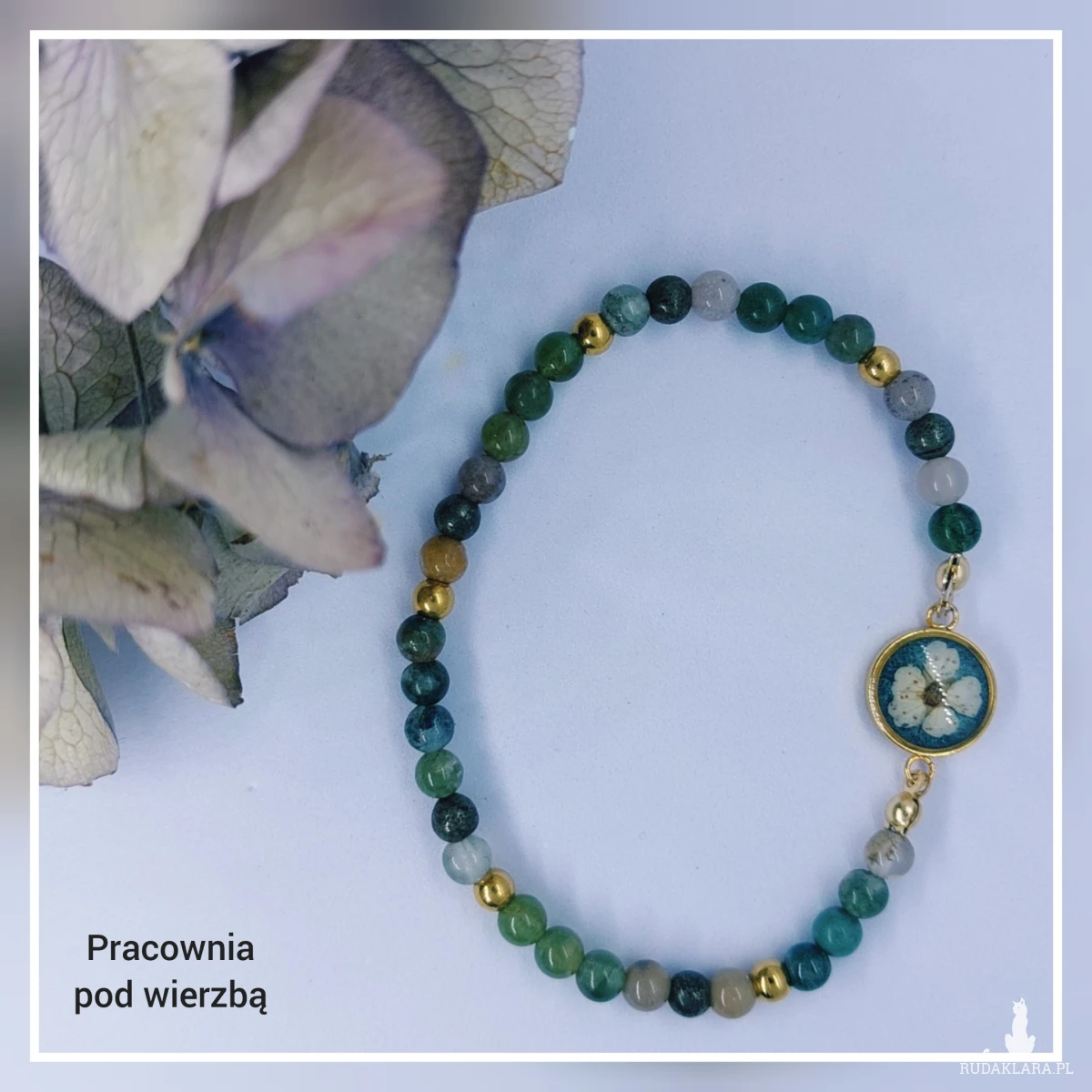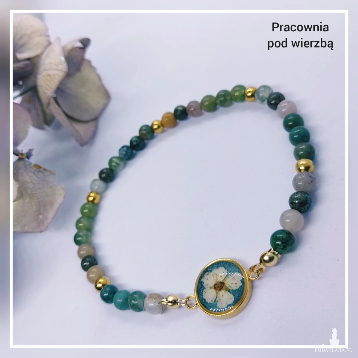 Stworzona ręcznie z kamieni naturalnych, na wygodnej gumce jubilerskiej, z elementami stali szlachetnej i oczkiem z kwiatem tawuły.