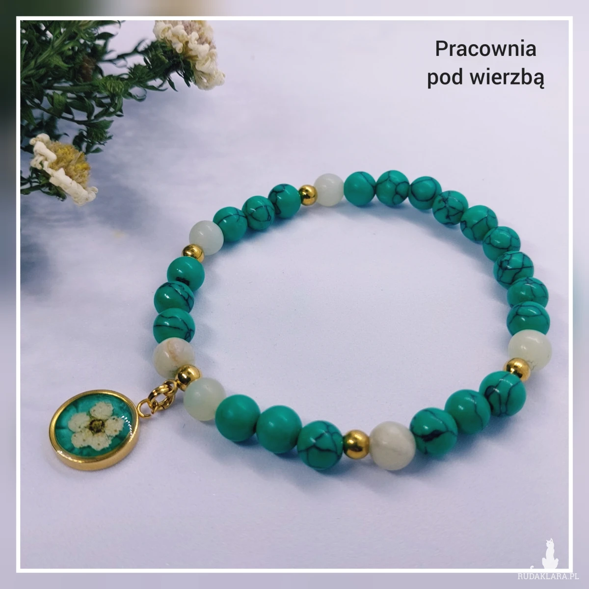 Stworzona ręcznie z kamieni naturalnych, na wygodnej gumce jubilerskiej, z elementami stali szlachetnej i oczkiem z kwiatem tawuły.