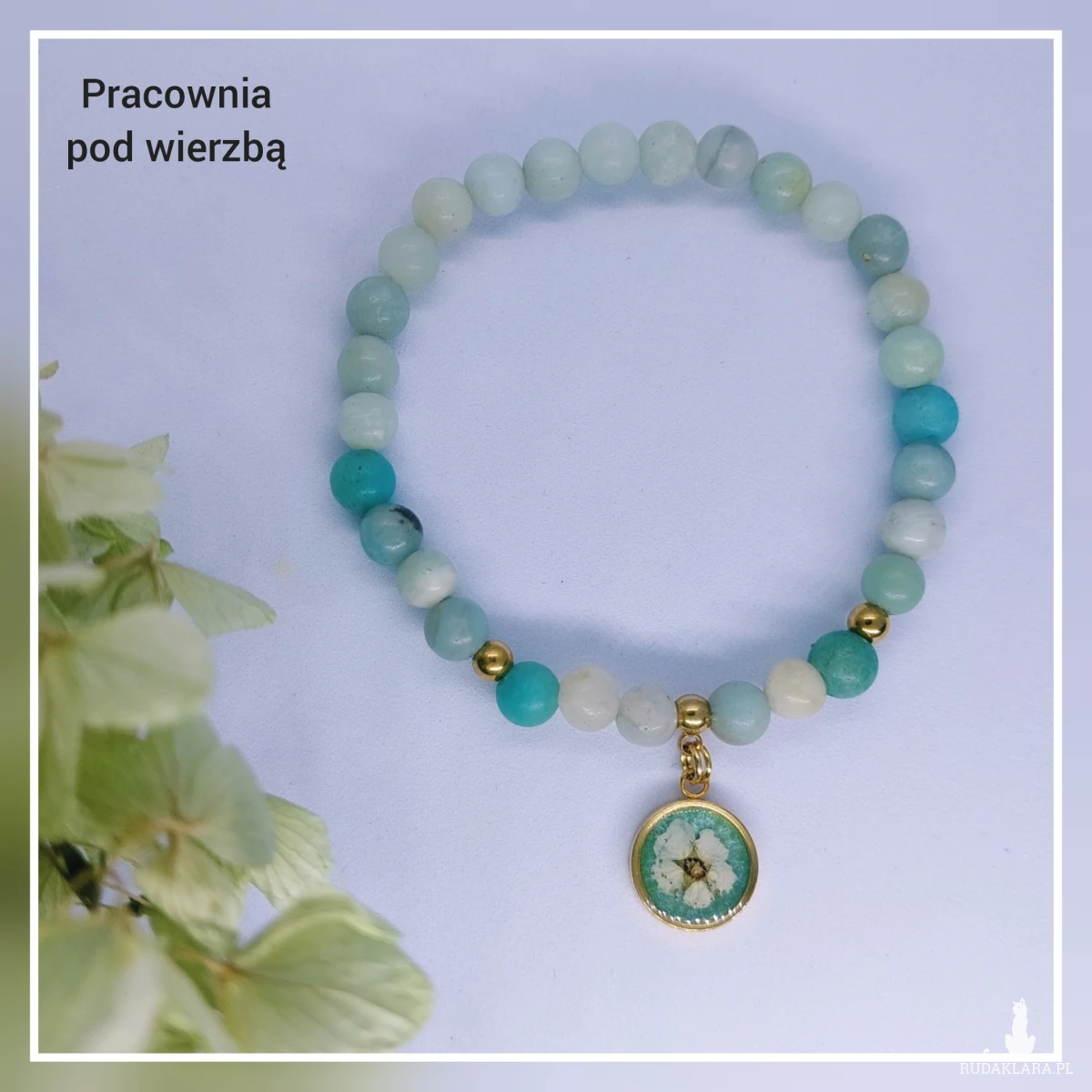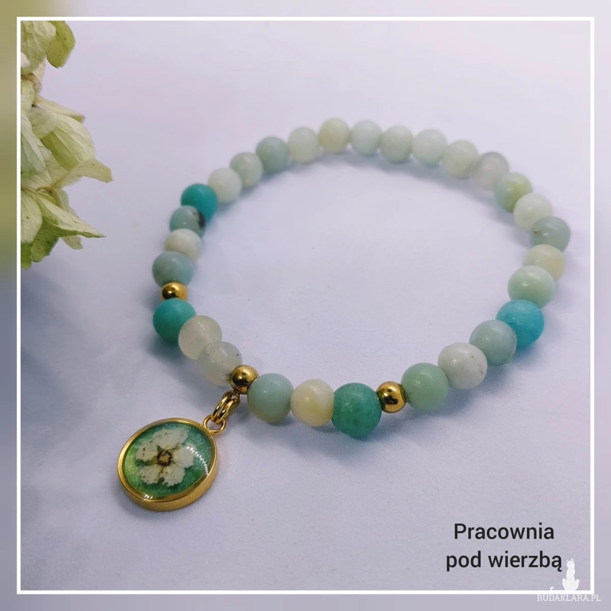 Stworzona ręcznie z kamieni naturalnych, na wygodnej gumce jubilerskiej, z elementami stali szlachetnej i oczkiem z kwiatem tawuły.