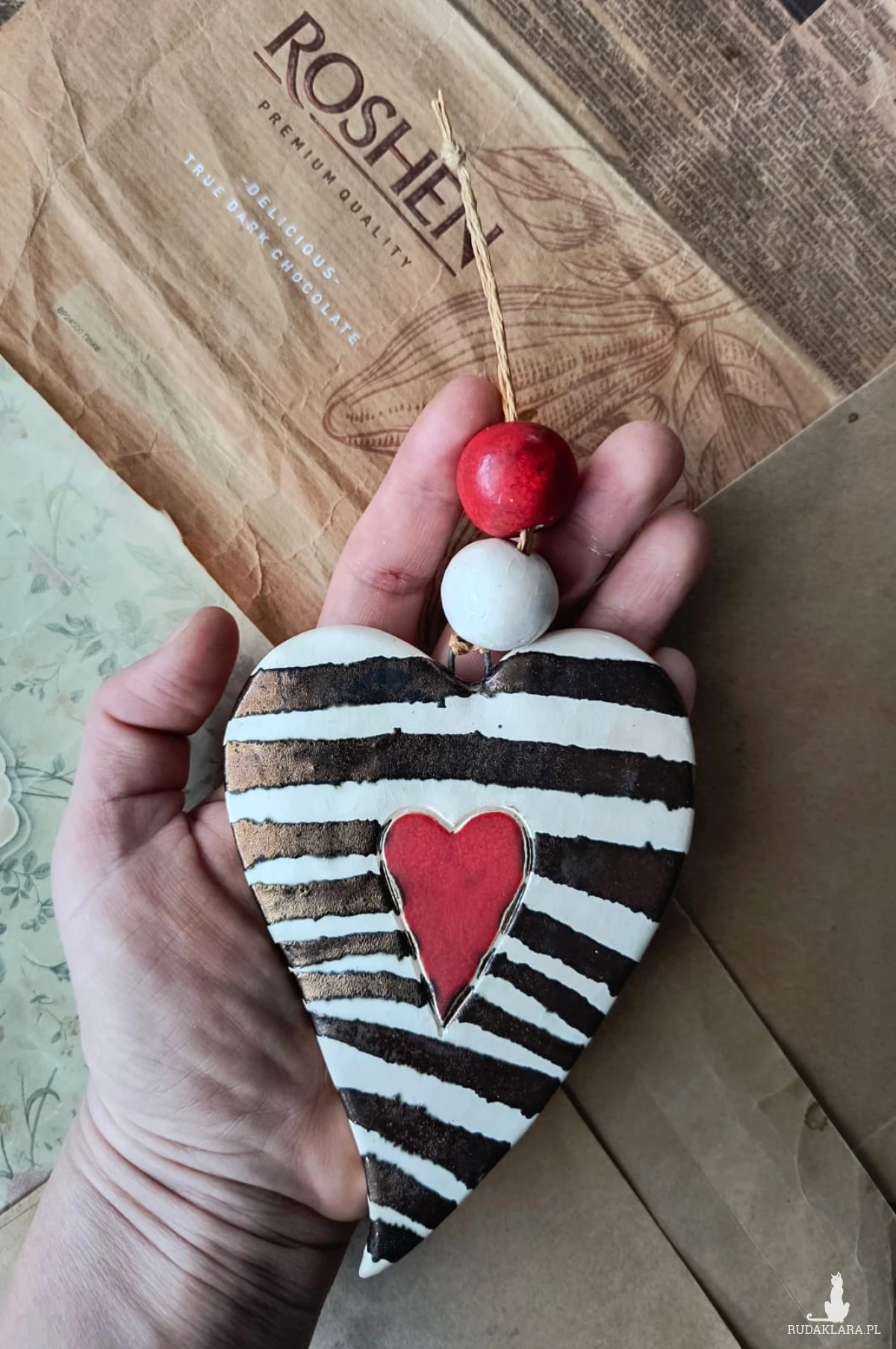 Serce ceramiczne, wykonane z gliny szamotowej wypalone na biskwit, a następnie szkliwione w temperaturze 1260 stopni C. Wymiary ok 9,5 cm x 9 cm plus sznurek z koralikami. Polecam serdecznie na każdą okazję.