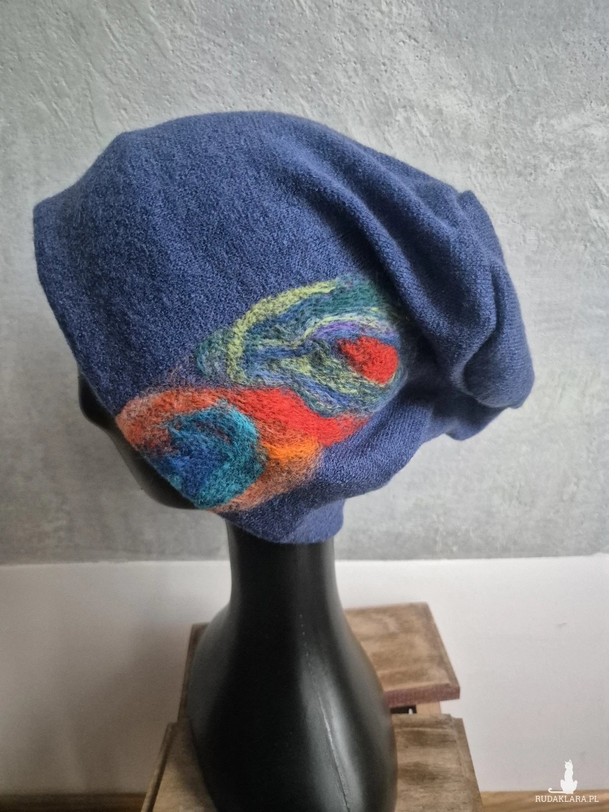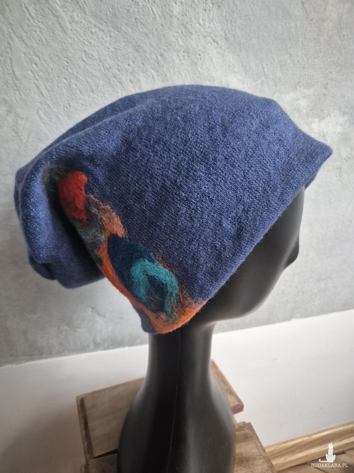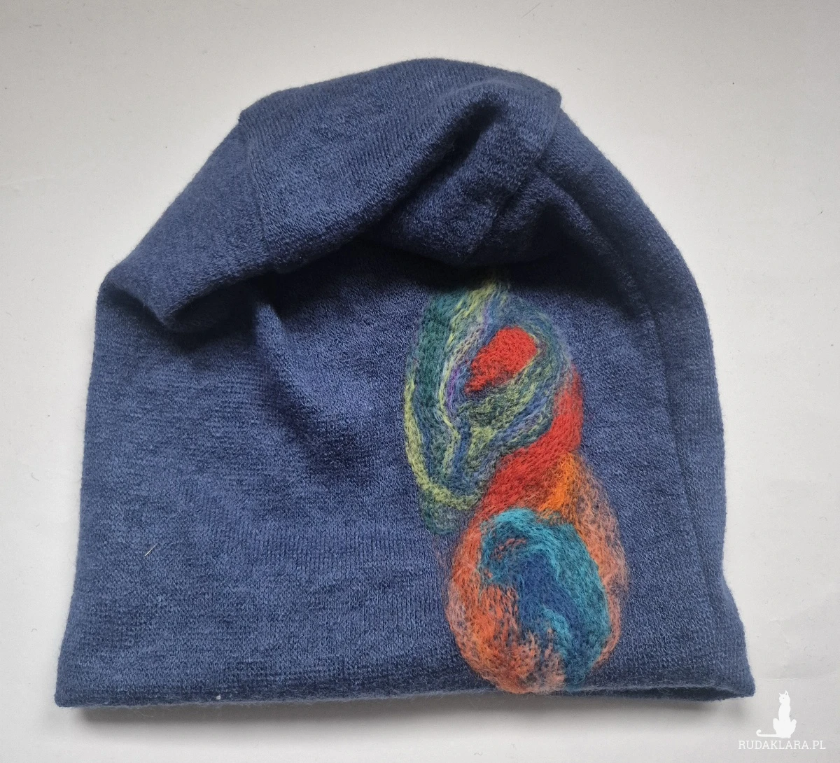 czapka wełniana filcowana zimowa niebieska handmade w kwiaty na podszewce, motyw z dwóch stron taki sam-- rozmiar uniwersalny, wełniana, filcowana wełną merynosów, bardzo ciepła, fantastyczna, miła, miękko układa się na głowie, niesamowicie zwraca uwagę, doskonałą na codzienne noszenie jak i na prezent, zawsze możesz ją założyć po basenie i przeżyjesz,box a1
