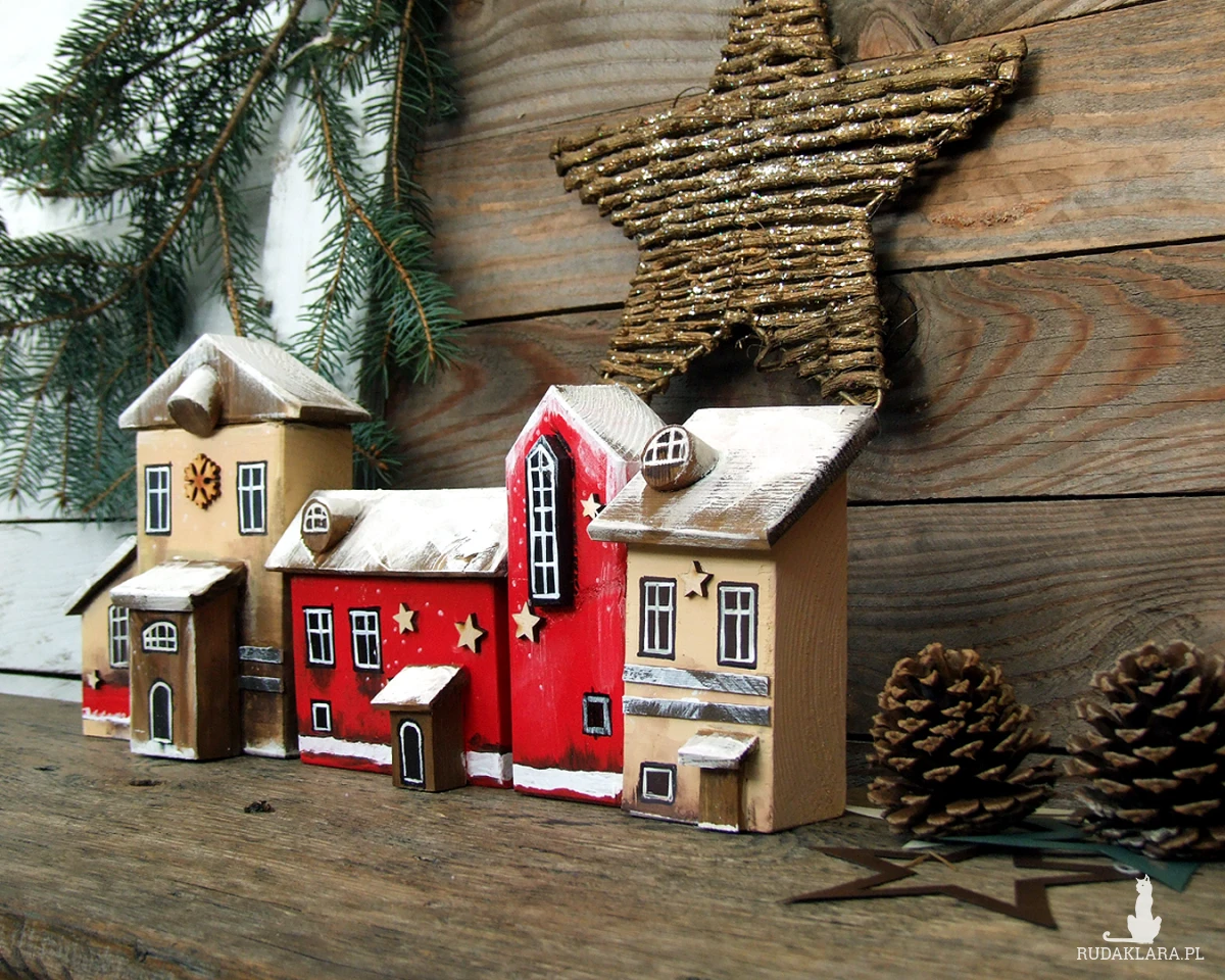 Pięć drewnianych domków, ręcznie malowanych - dekoracja w zimowym świątecznym klimacie, do aranżacji wnętrza, także jako dodatek do stroików. Domki będą także pięknym prezentem, dla bliskich kochających rękodzieło, drewno i naturalne dodatki do domu.