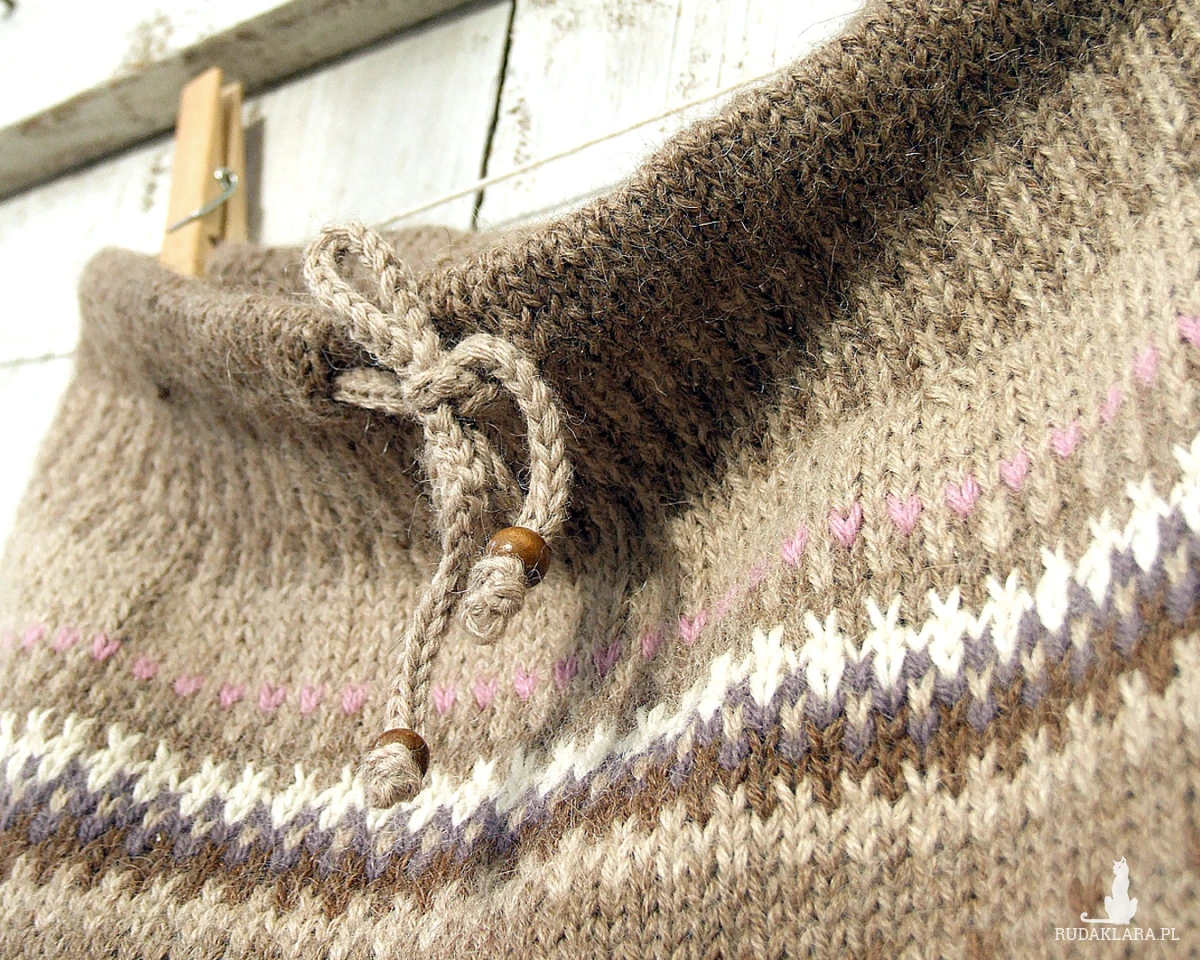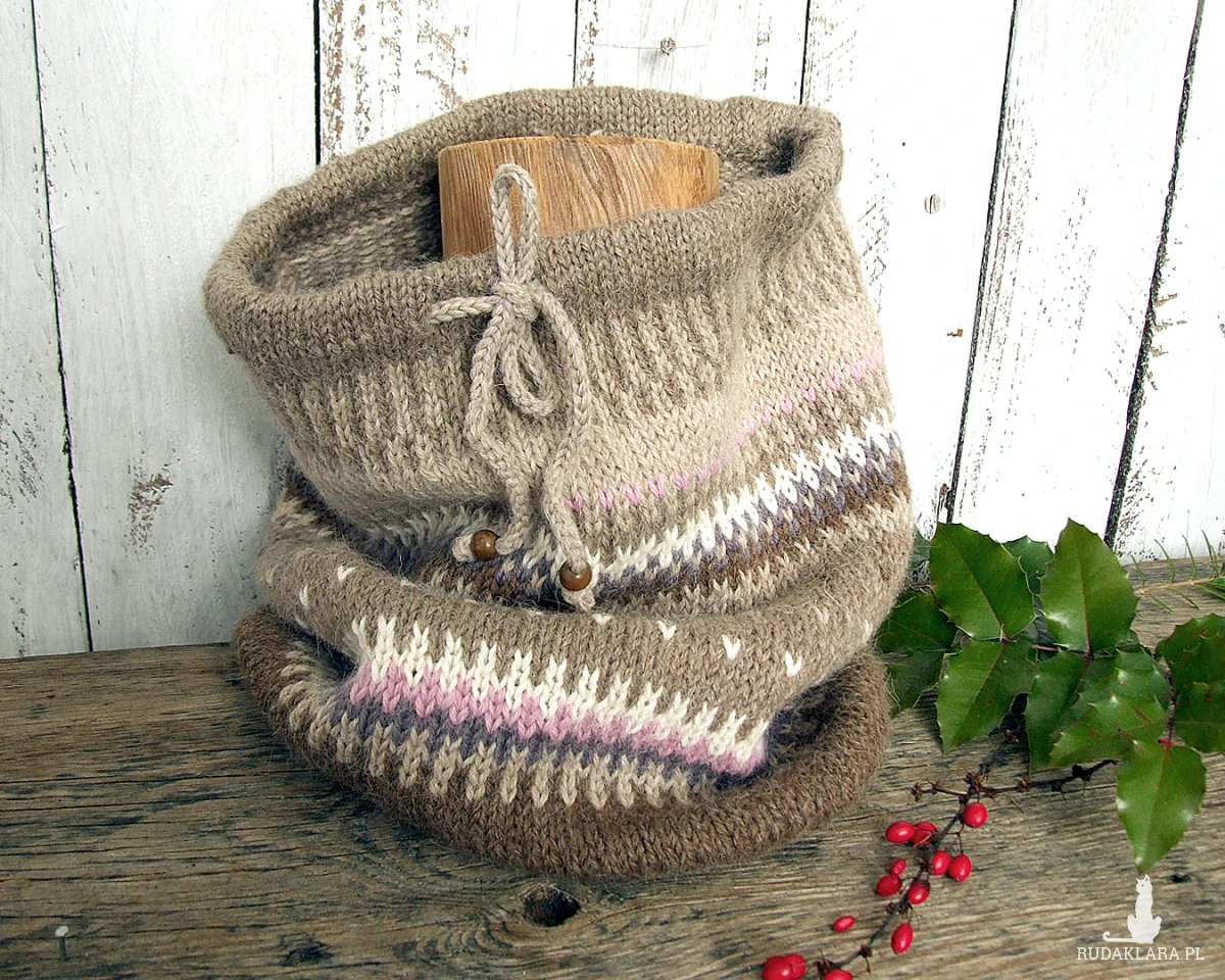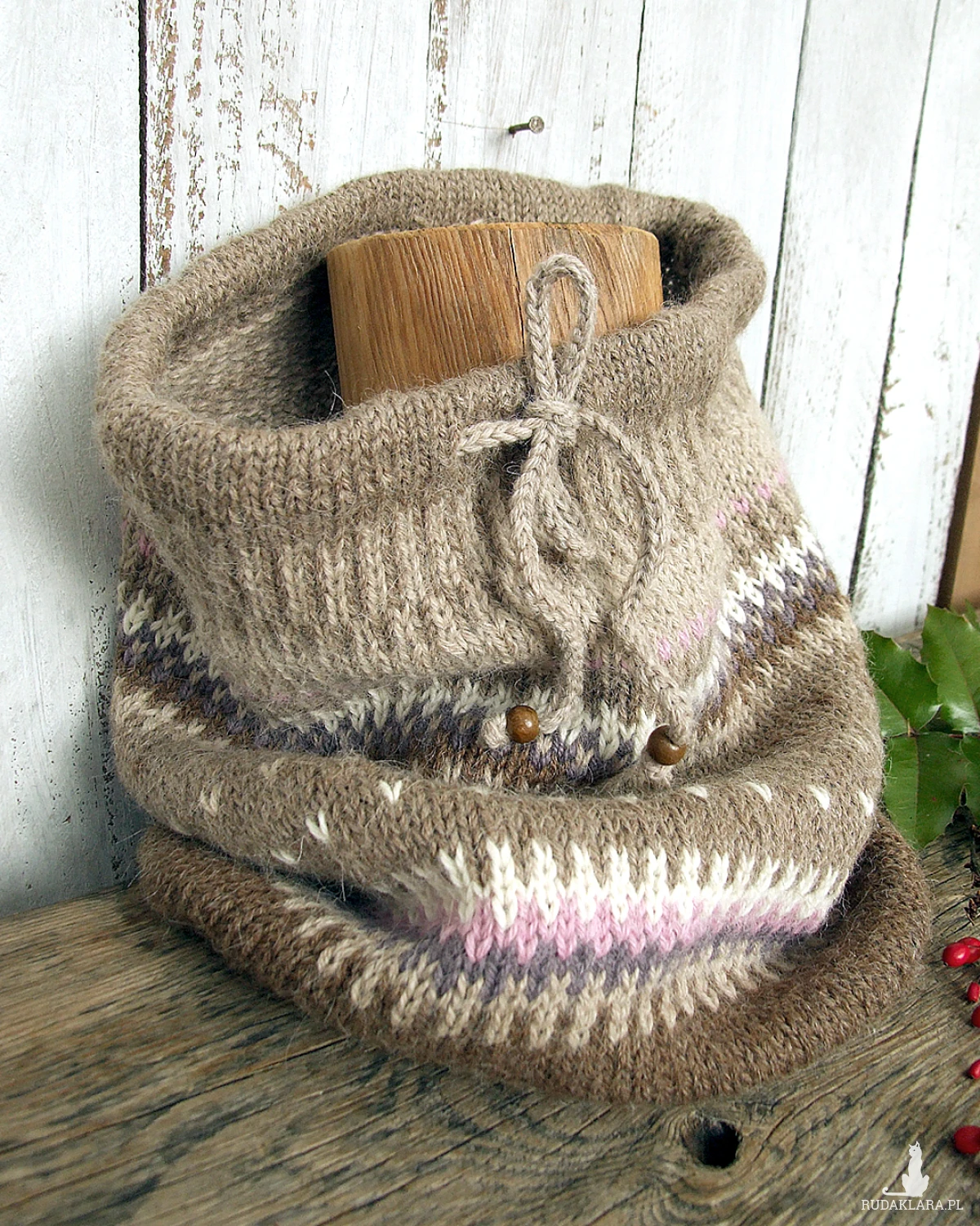 Ciepły komin ręcznie wykonany na drutach, wzorem żakardowym - średniej grubości, gładki, góra komina zakończona wąskim tunelem i sznureczkiem do wiązania/regulacji.