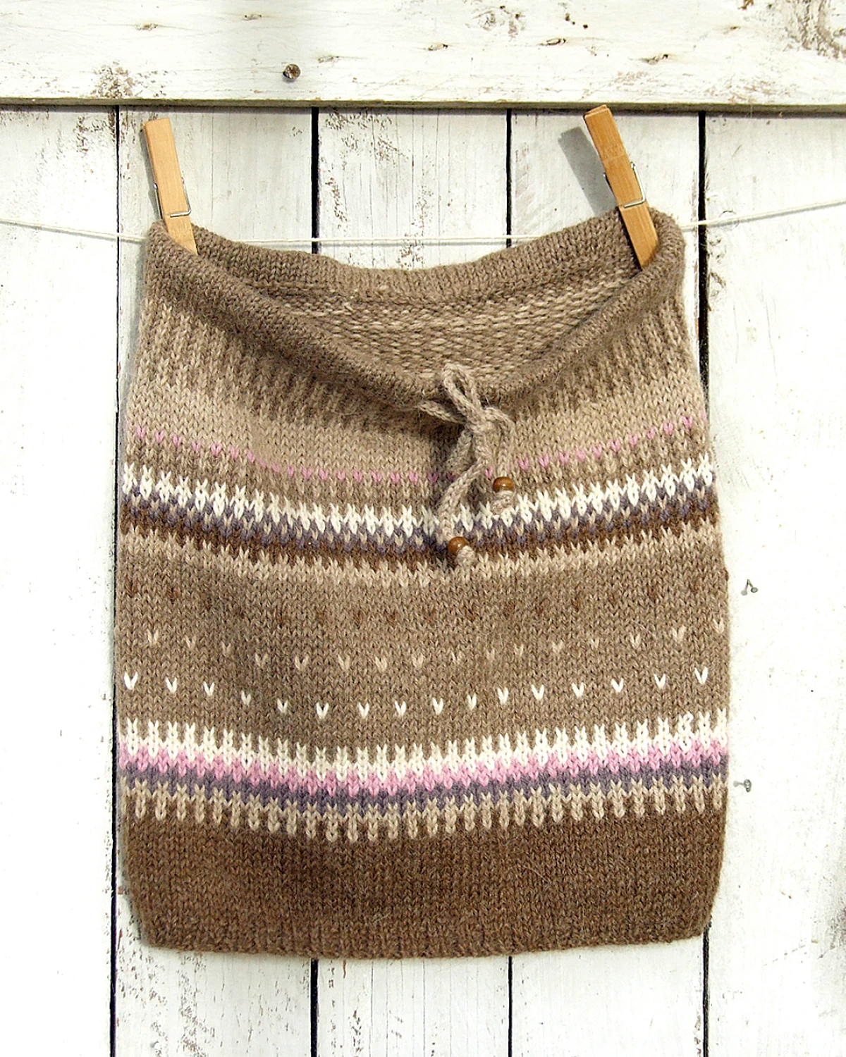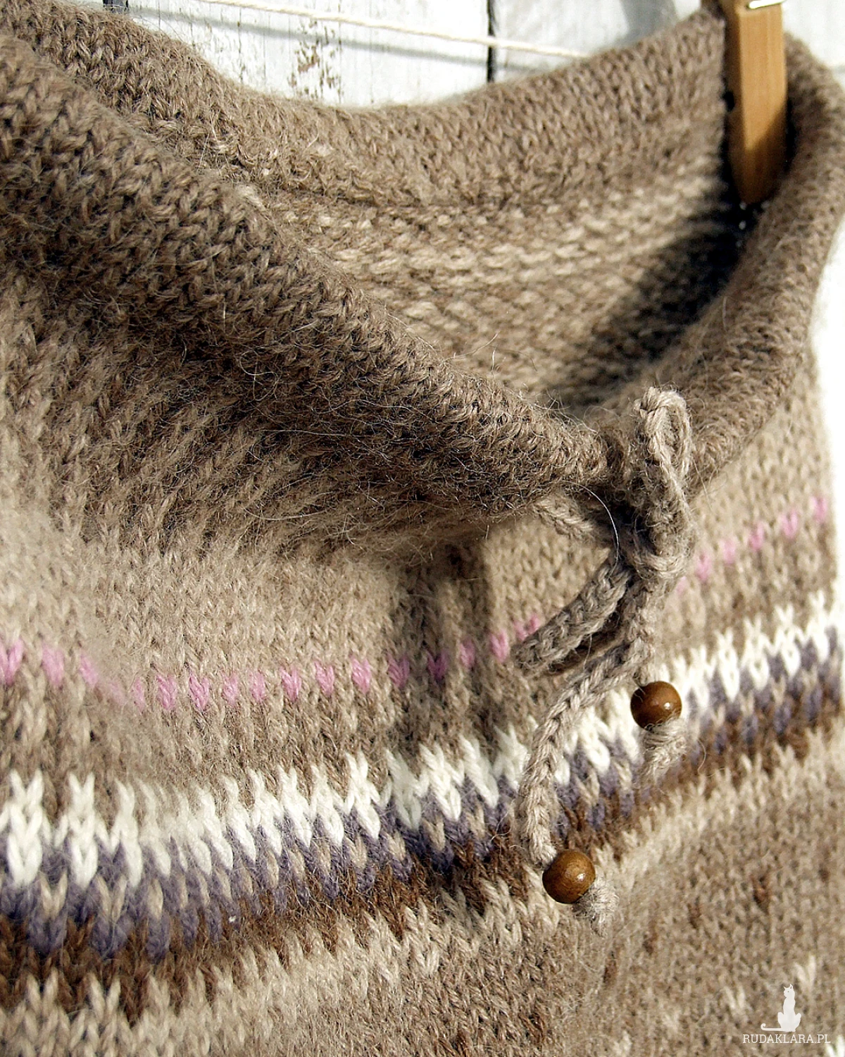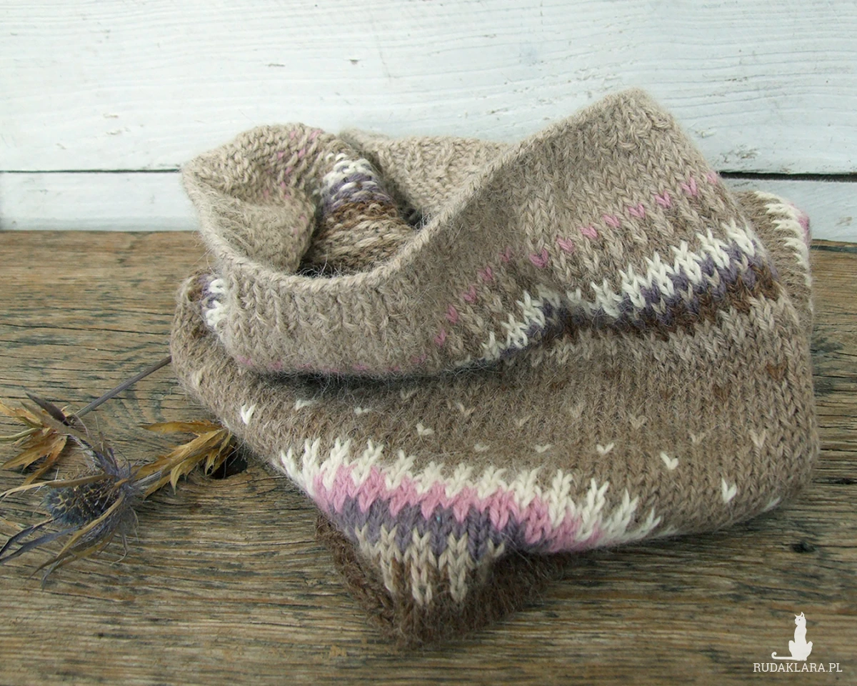 Ciepły komin ręcznie wykonany na drutach, wzorem żakardowym - średniej grubości, gładki, góra komina zakończona wąskim tunelem i sznureczkiem do wiązania/regulacji.