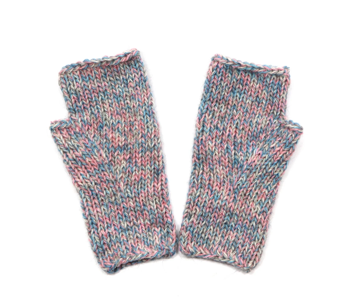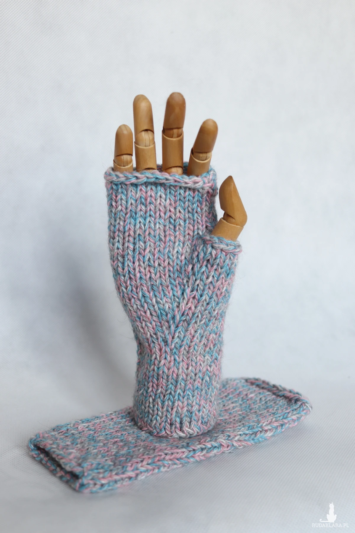 Cieplutkie bezszwowe mitenki zrobione na drutach z czterech nitek włóczki w kolorach: szary, ecru, turkusowy i jasnoróżowy.