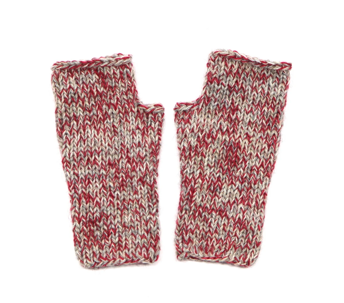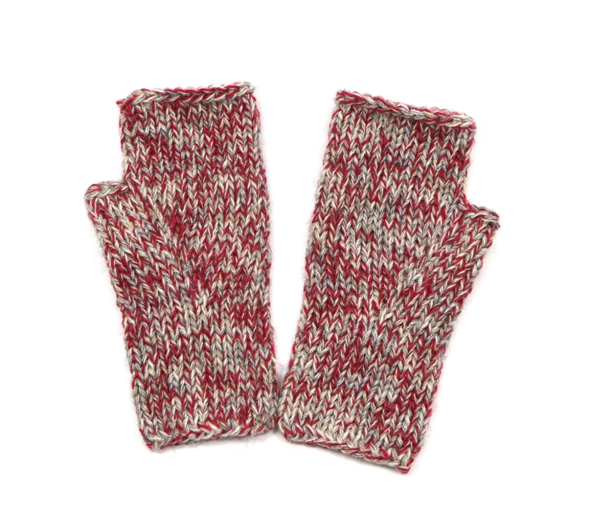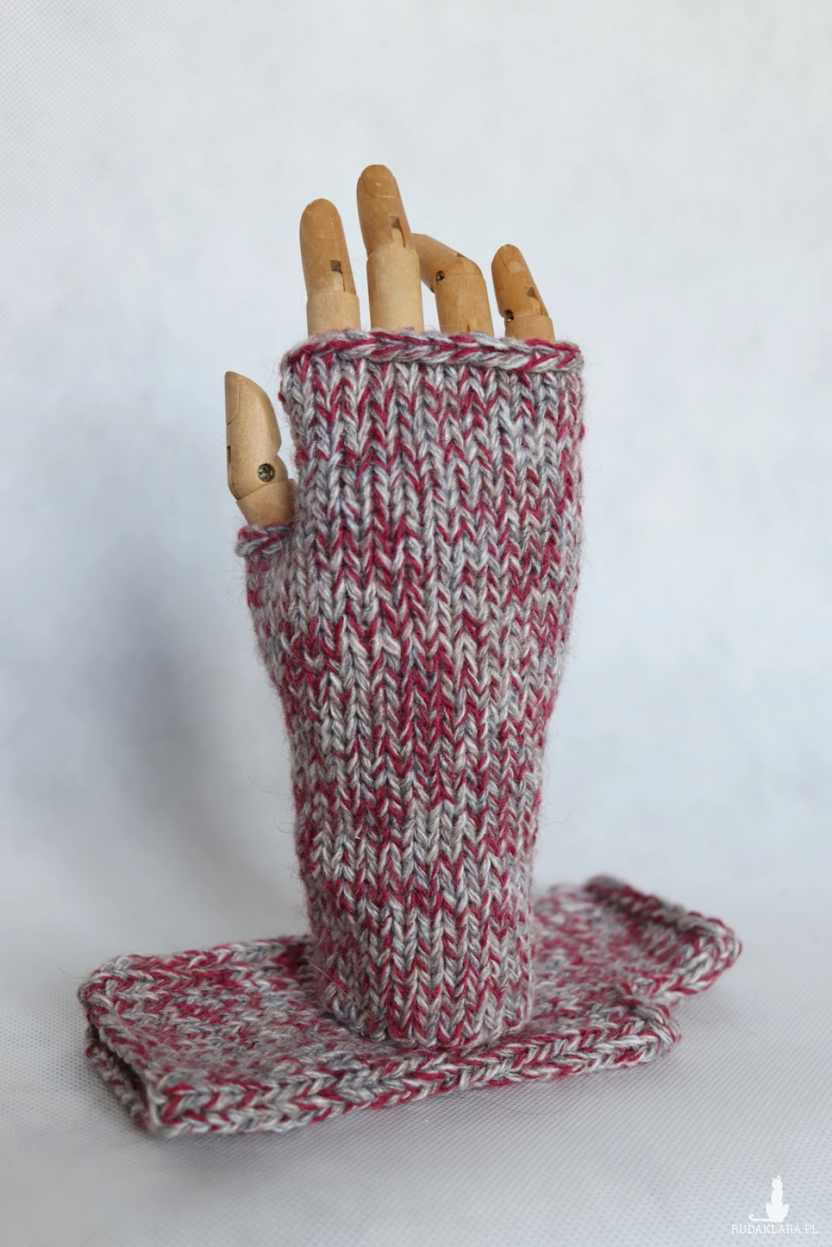 Cieplutkie bezszwowe mitenki zrobione na drutach z czterech nitek włóczki w kolorach: szary, beżowy, ecru i bordowym.