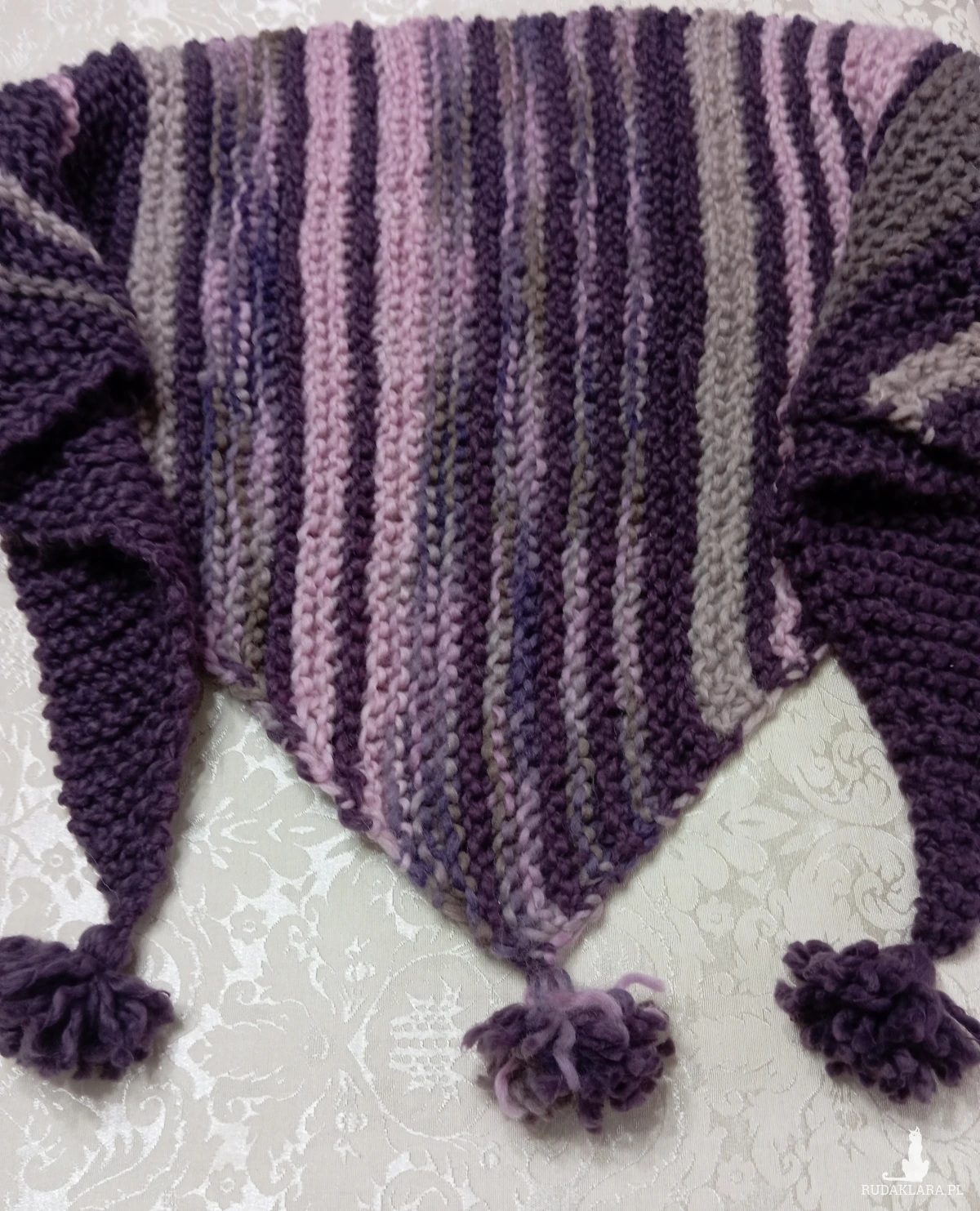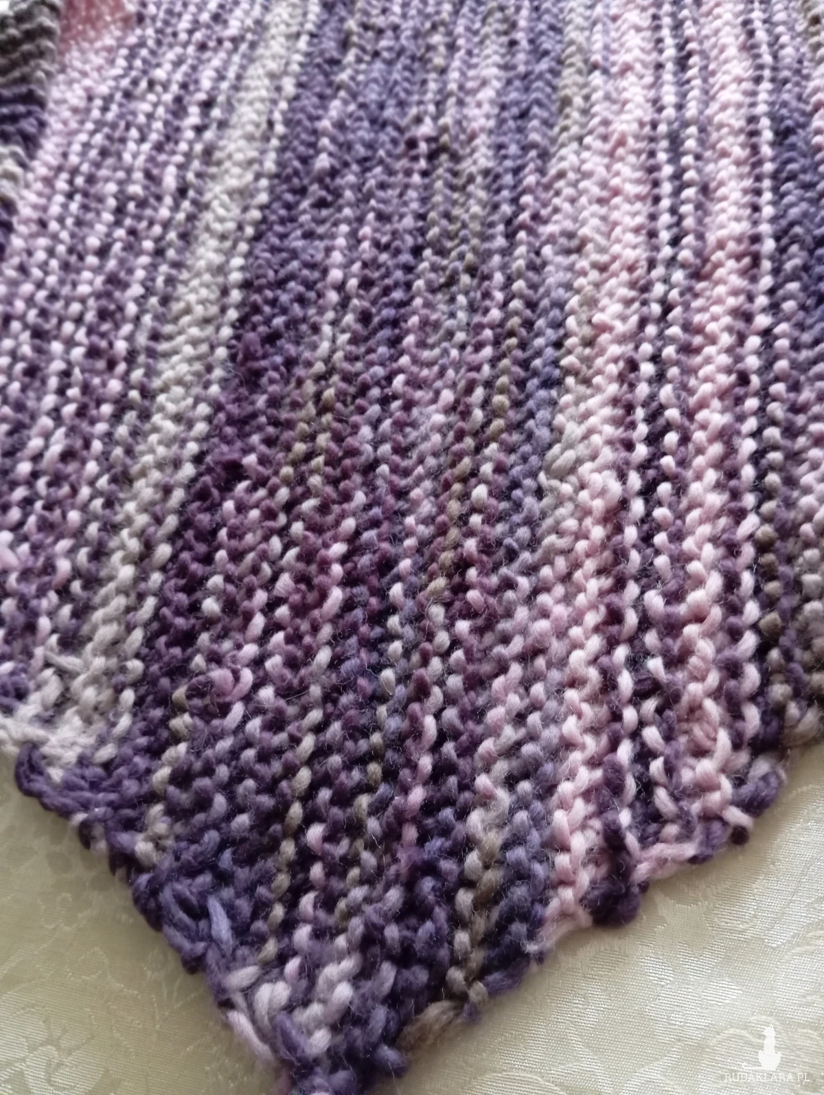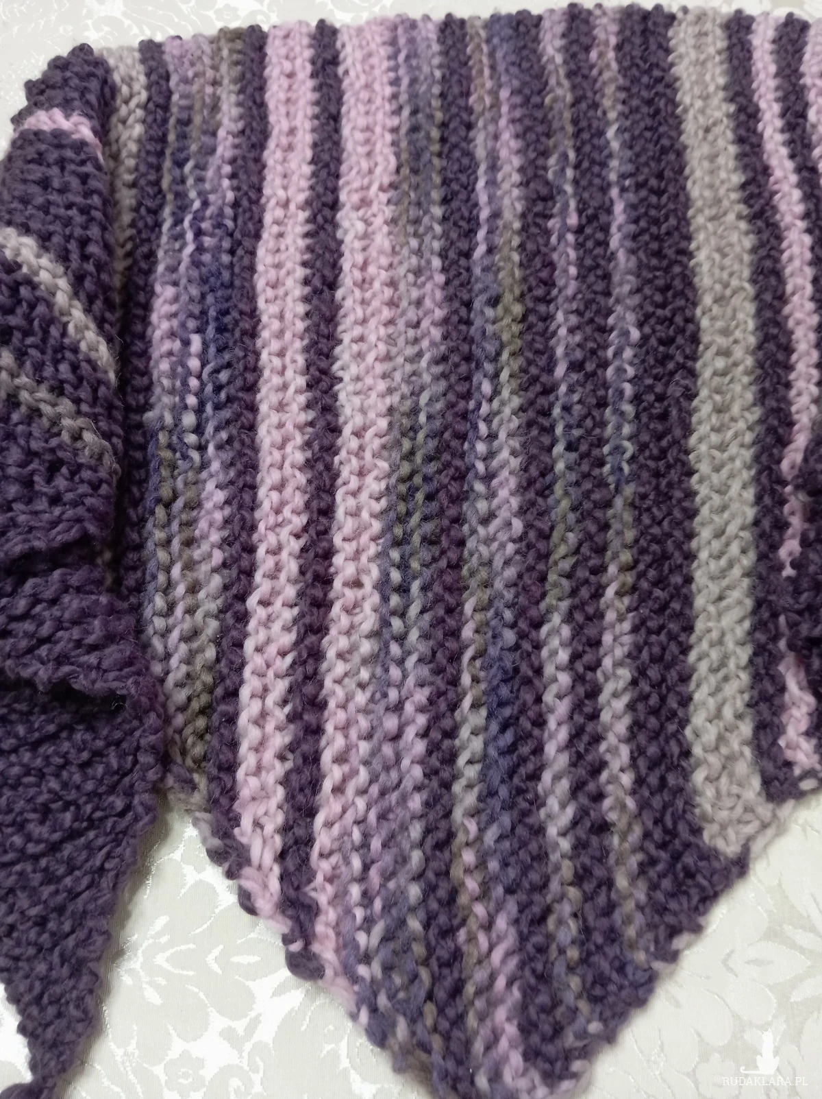 Duża ciepła wełniana chusta, odcienie fioletu i pudrowego różu, rękodzieło. Chusta robiona na drutach, wzór francuski. Wymiary: 175x54 cm (mierzone bez chwostów)