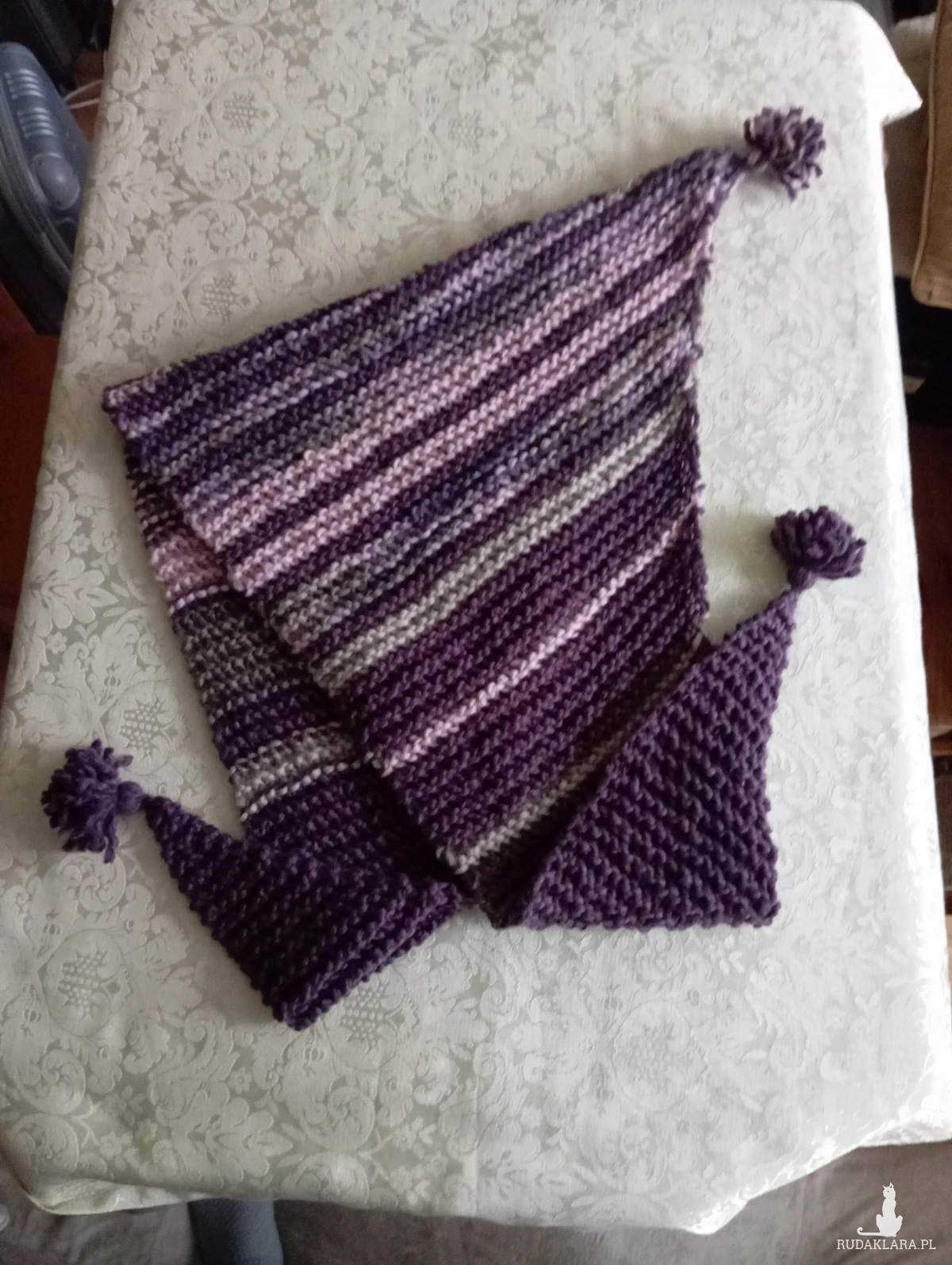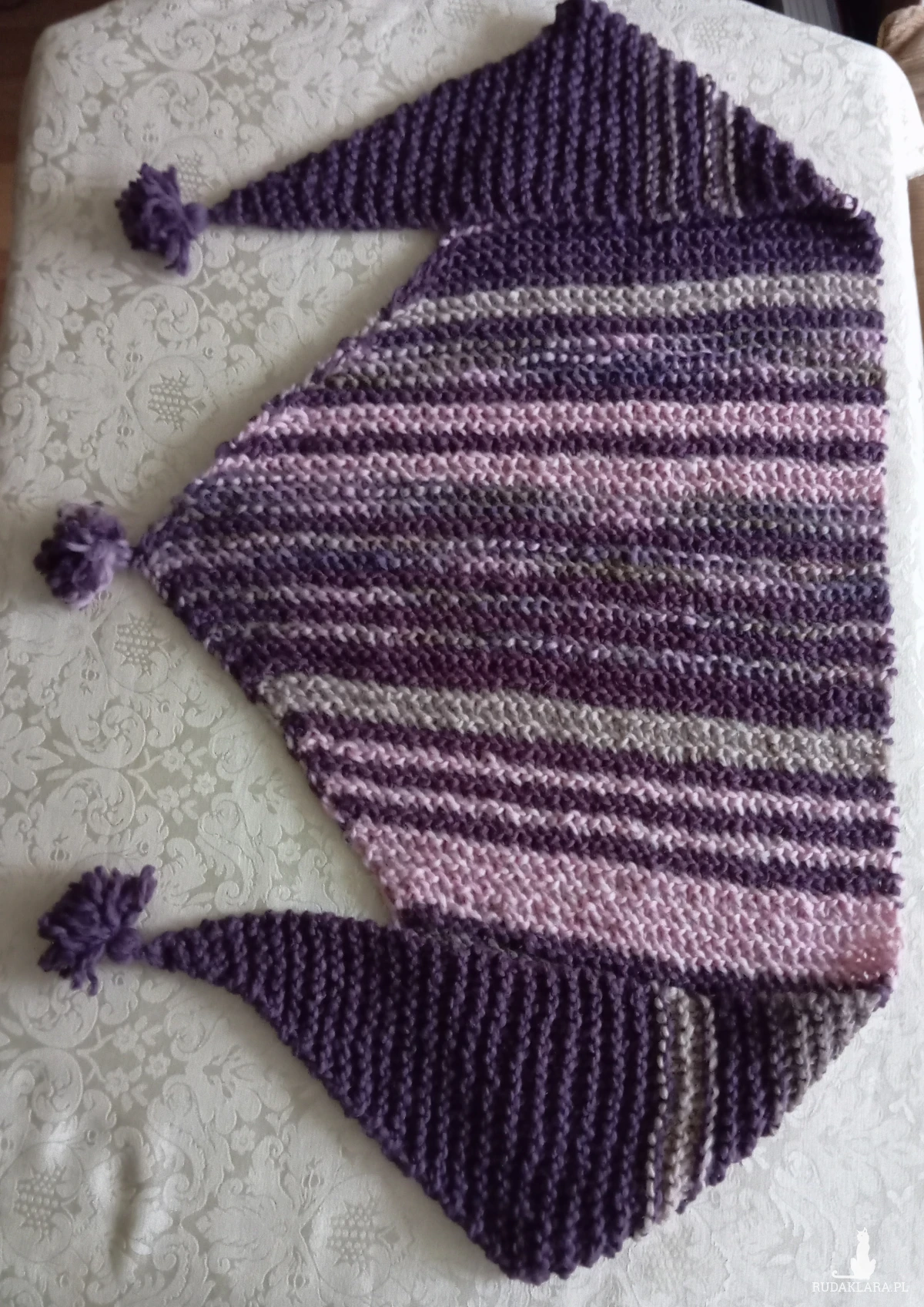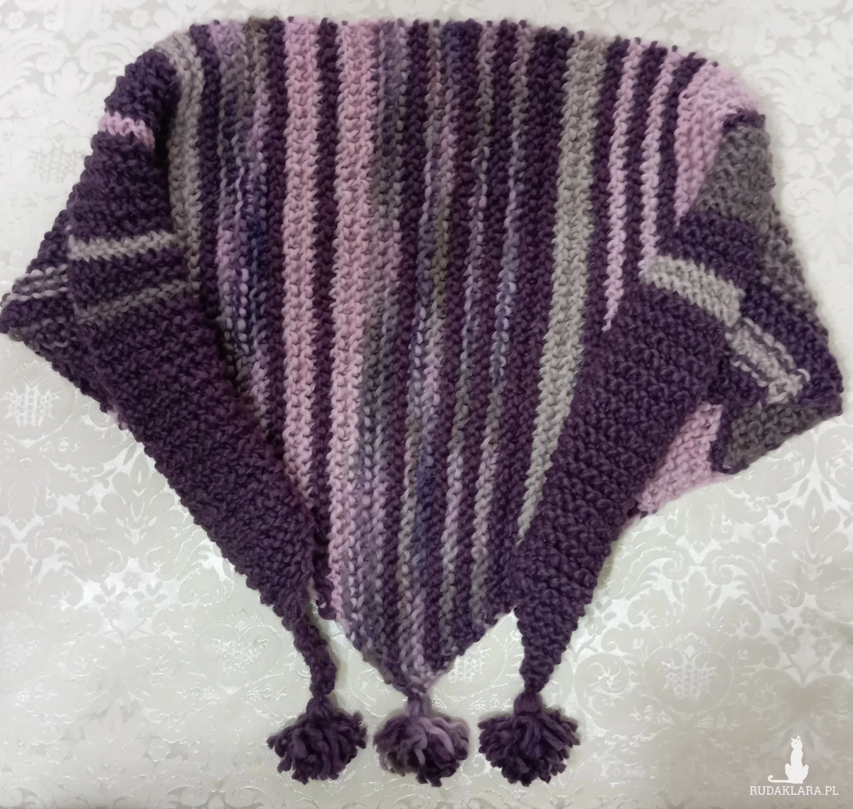 Duża ciepła wełniana chusta, odcienie fioletu i pudrowego różu, rękodzieło. Chusta robiona na drutach, wzór francuski. Wymiary: 175x54 cm (mierzone bez chwostów)