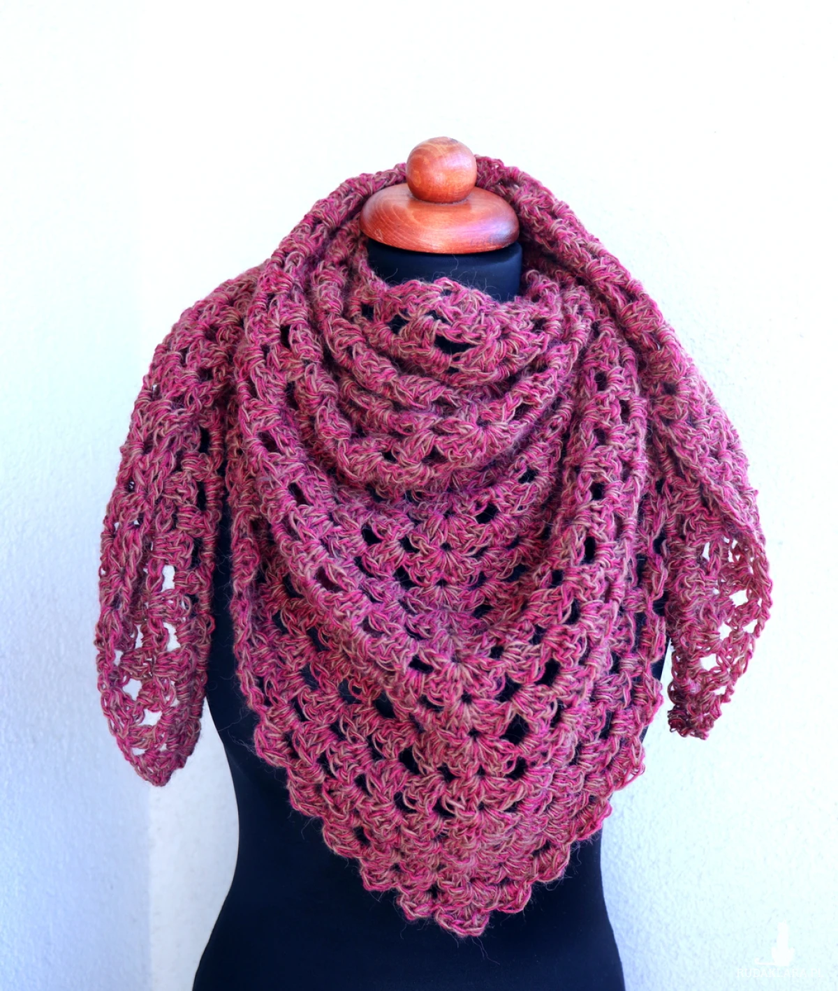Chusta - apaszka zrobiona na szydełku z cieniutkiej akrylowej włóczki w kolorze brązowym i bordowym.