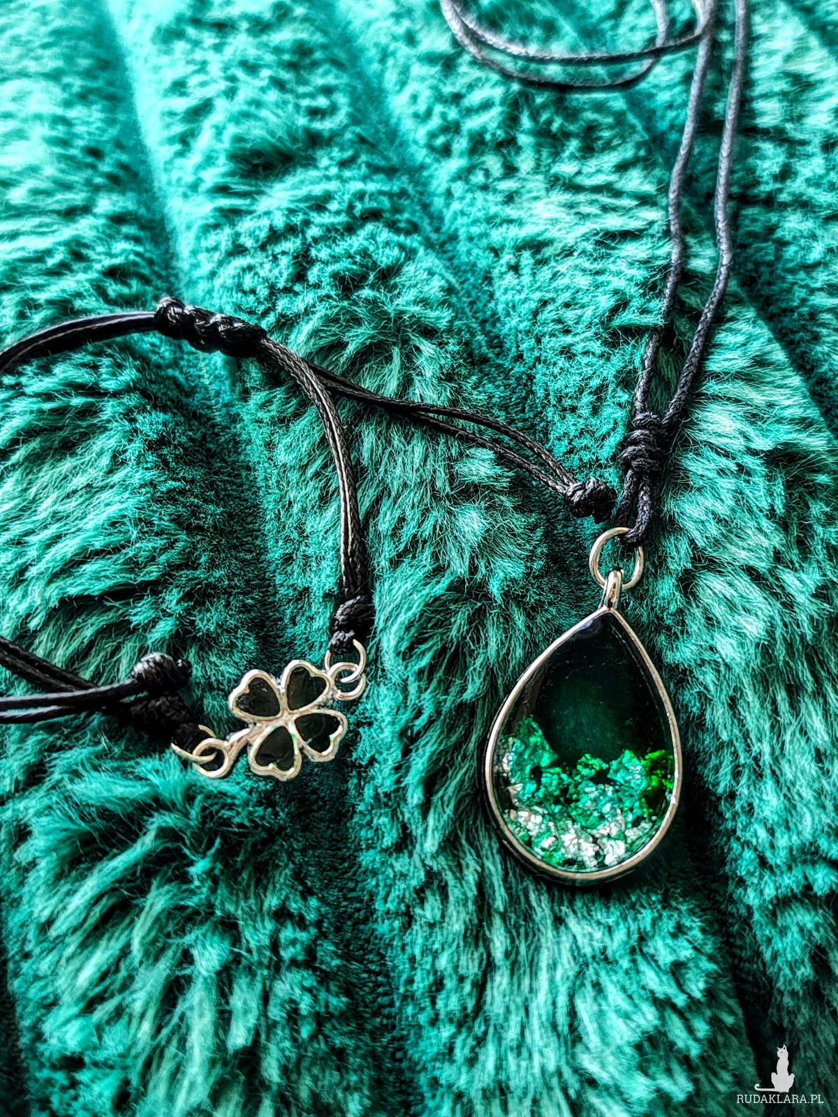 Ręcznie wykonany komplet składający się z naszyjnika z żywicznym wisiorem w kształcie łzy oraz bransoletki z metalową czterolistną koniczynką. Srebrzyste fragmenty zatopione w żywicy nadają biżuterii naturalny, elegancki wygląd.