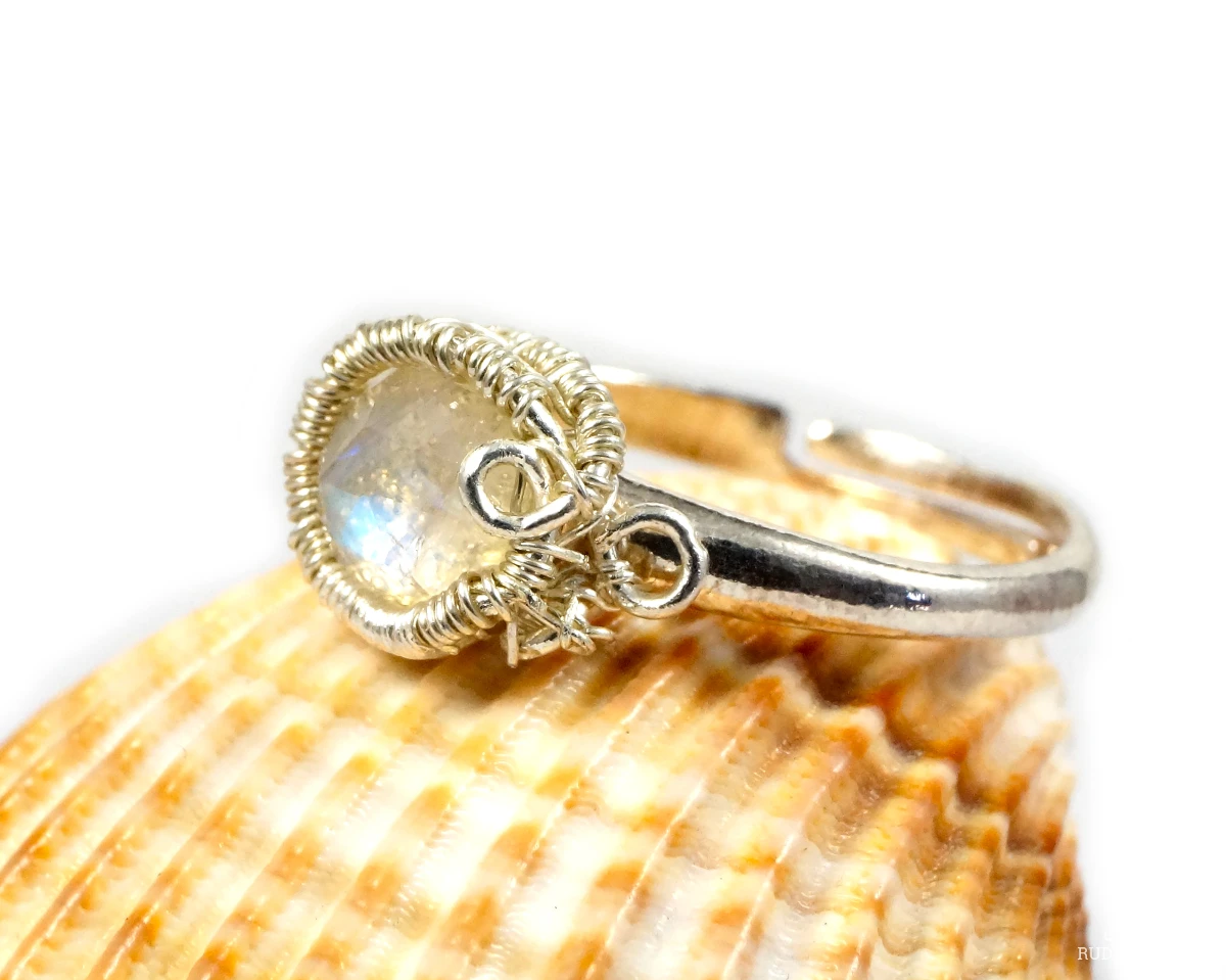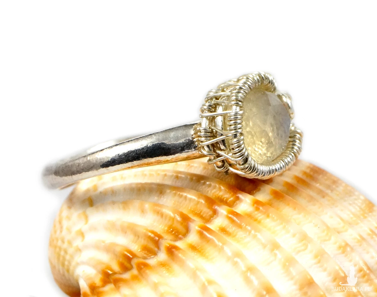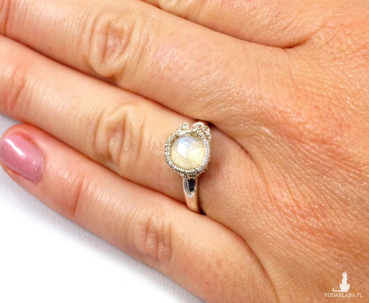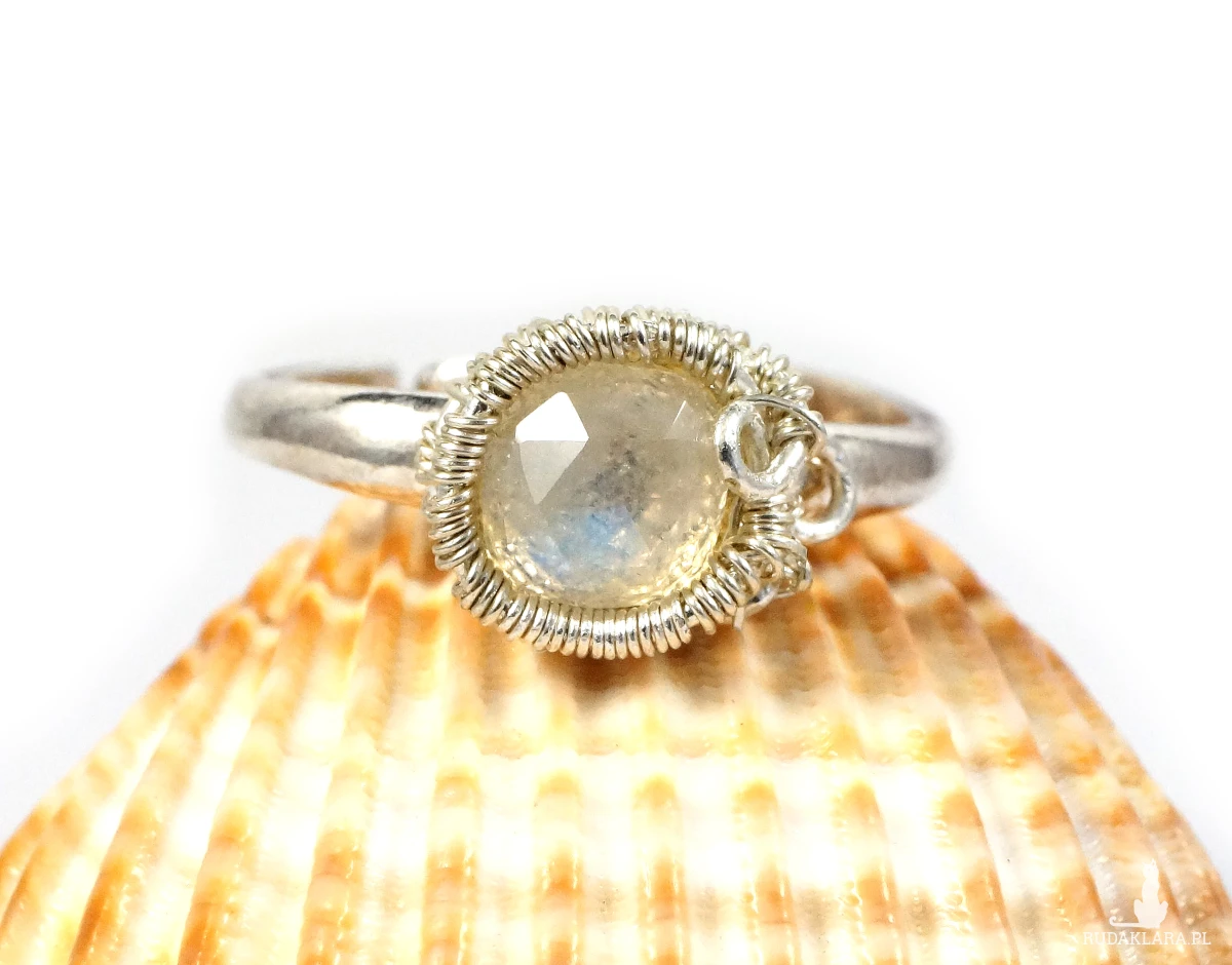 Misternie wykonany pierścionek z fasetowanym kaboszonem kamienienia księżycowego.