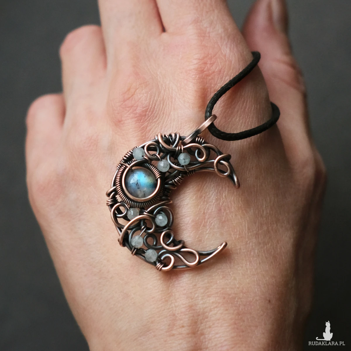 Miedziany wisiorek - księżyc z kamieniem labradorytu oraz drobnymi fasetowanymi akwamarynami. Piękne fantazyjne sploty dodają mu baśniowego charakteru. Labradoryt iryzuje w dwóch kolorach - delikatnie brzoskwiniowym lub niebieskim, w zależności od tego którą stroną jest obrócony.