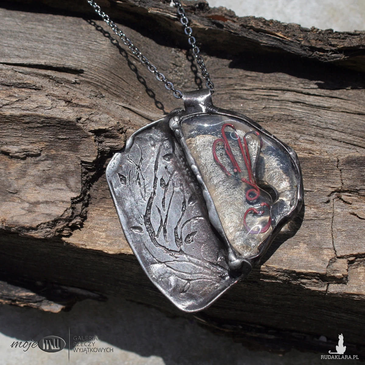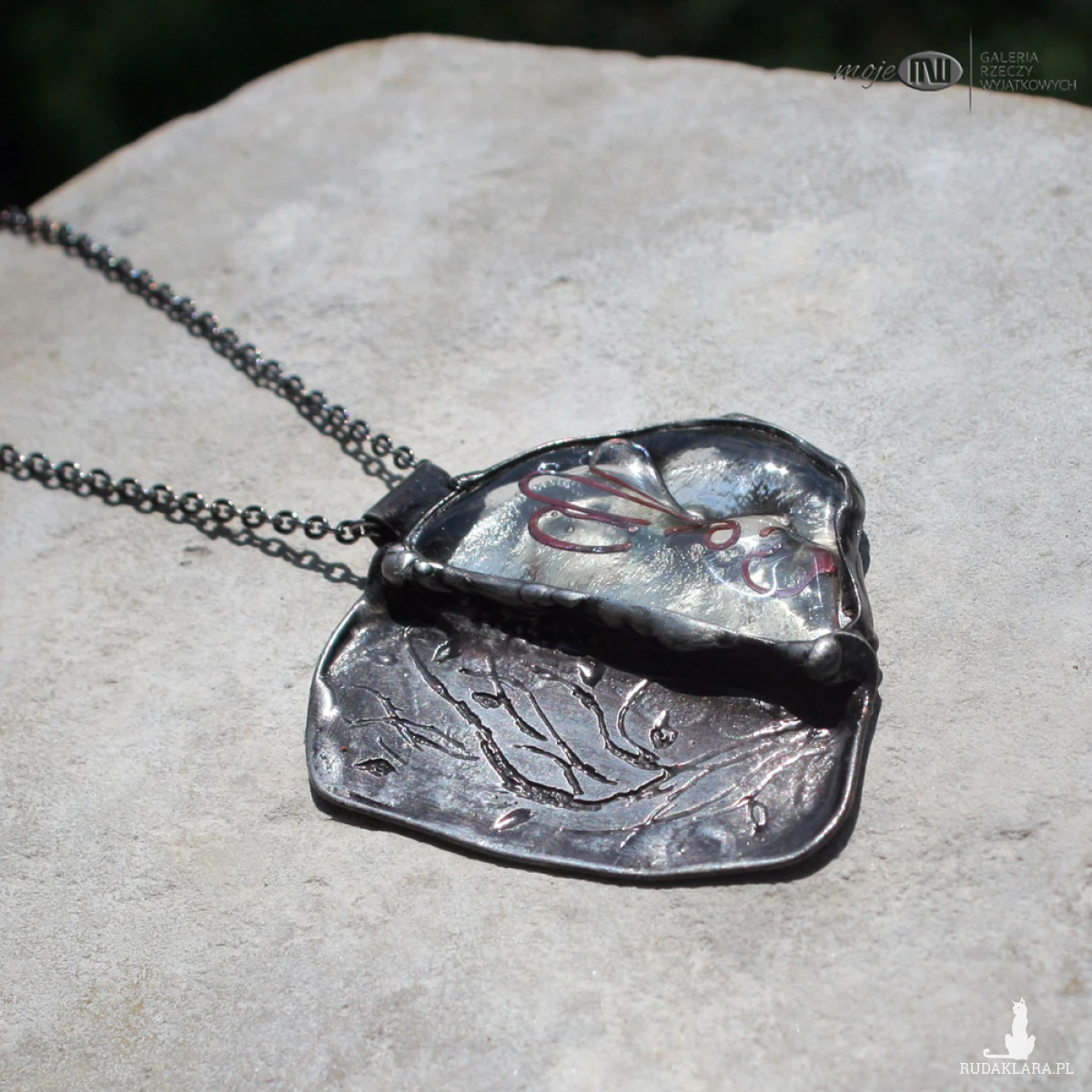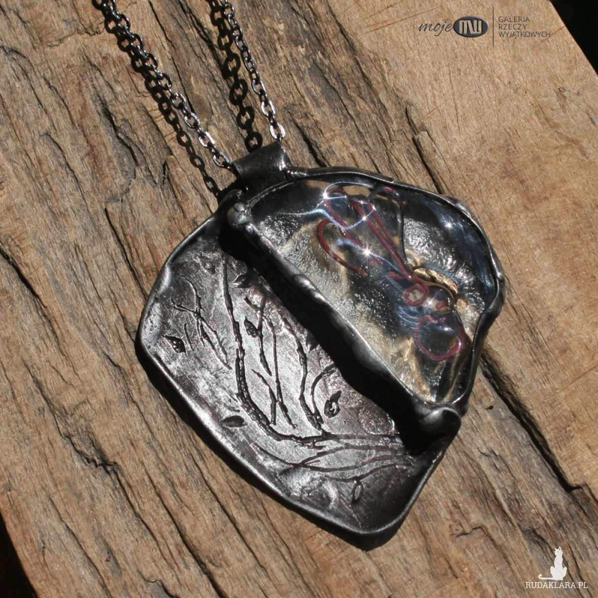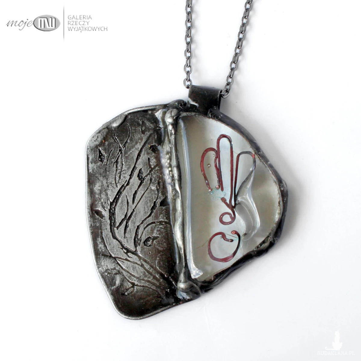 Nieregularny wisior z bezbarwnego szkła i miedzianej blachy. Blacha ma wytrawiony stylizowany, florystyczny wzór, pokryta jest cyną, patynowana na kolor starego srebra, a w szkle zatopione są zawijasy. Wisior zawieszony jest na metalowym łańcuszku w grafitowym kolorze. Zazwyczaj dodaję łańcuszek o długości 60 - 70 cm, ale klient przy zamówieniu może podać długość, która go interesuje.