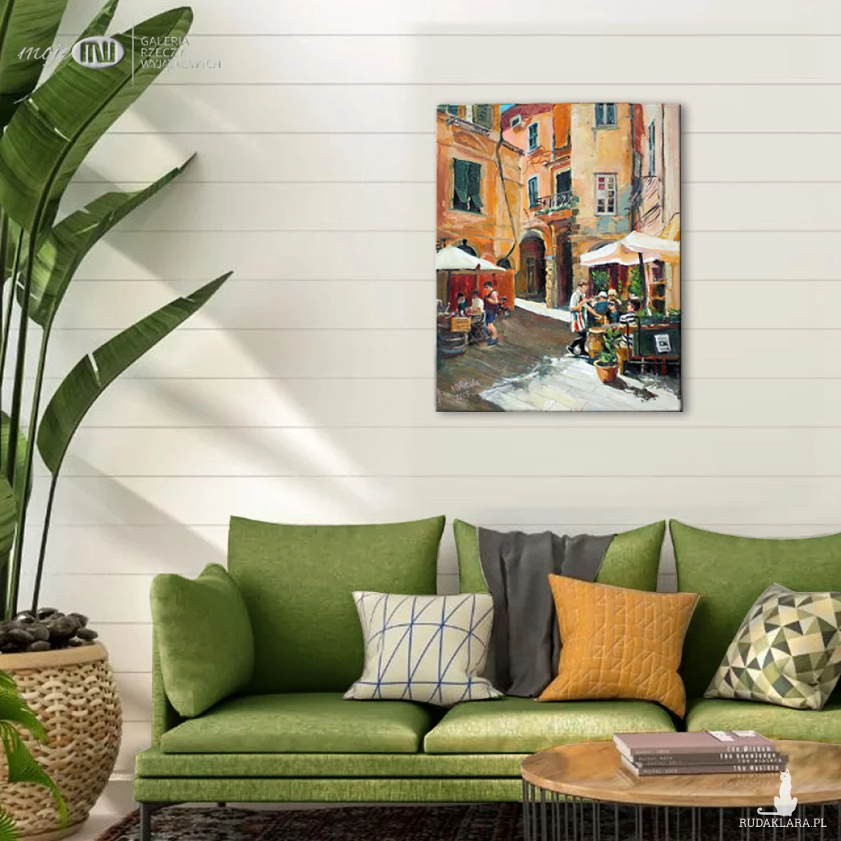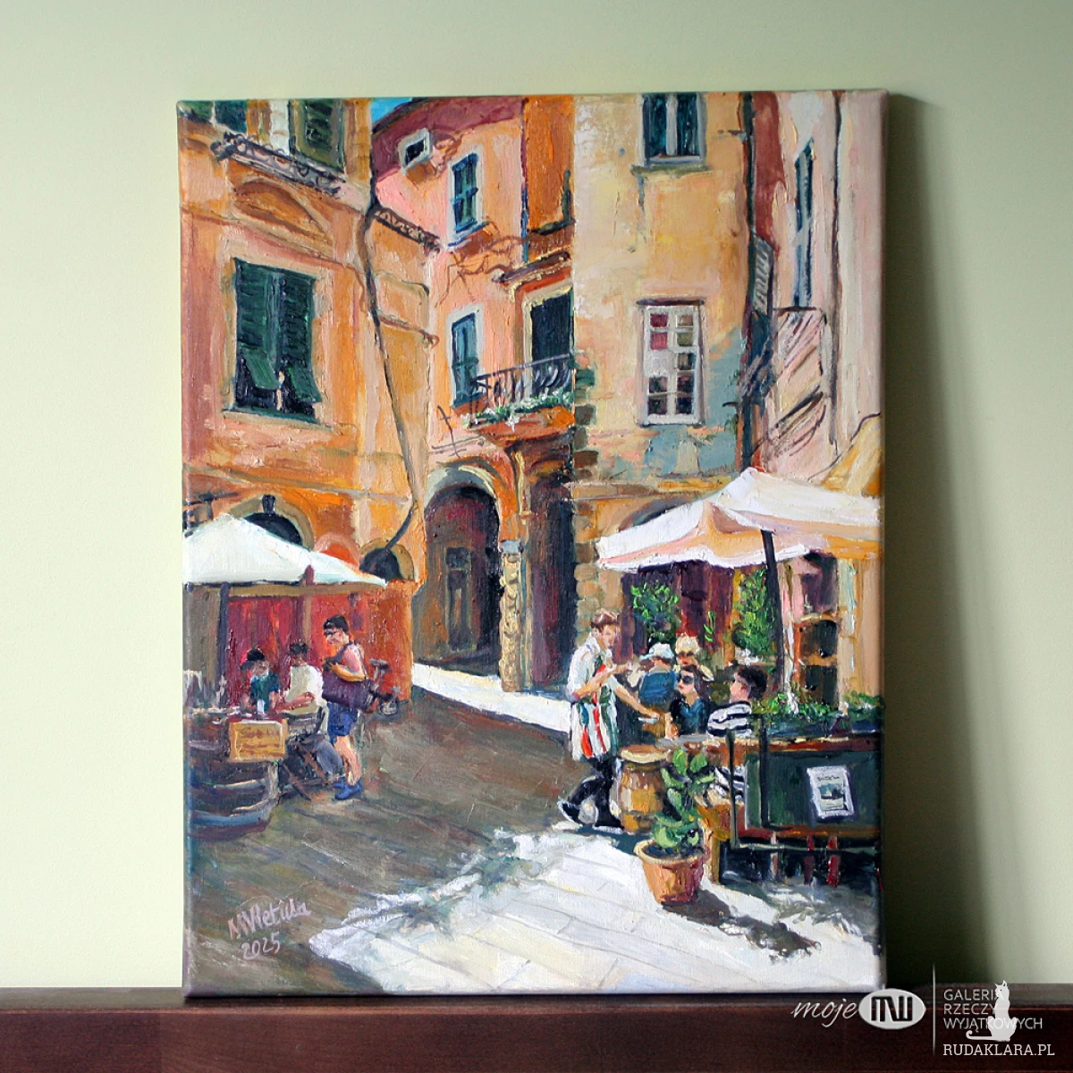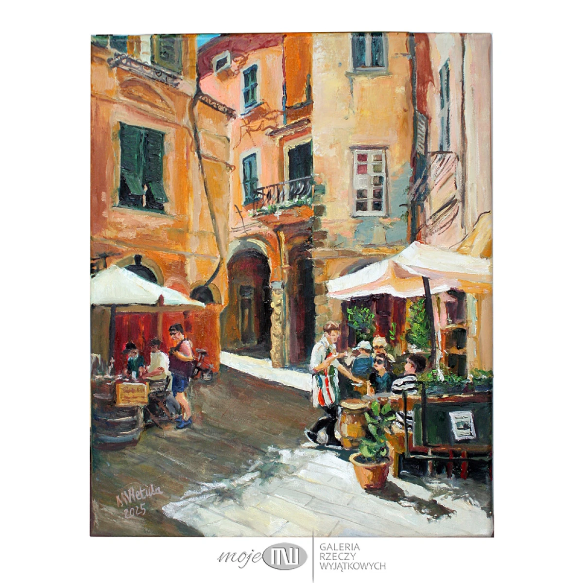 Obraz olejny malowany na płótnie, utrzymany w szerokiej palecie barw z wyraźną dominantą ciepłych odcieni pomarańczu. Będzie stanowił zdecydowany kolorystyczny i dekoracyjny akcent we wnętrzu.