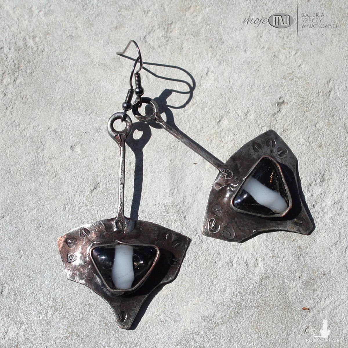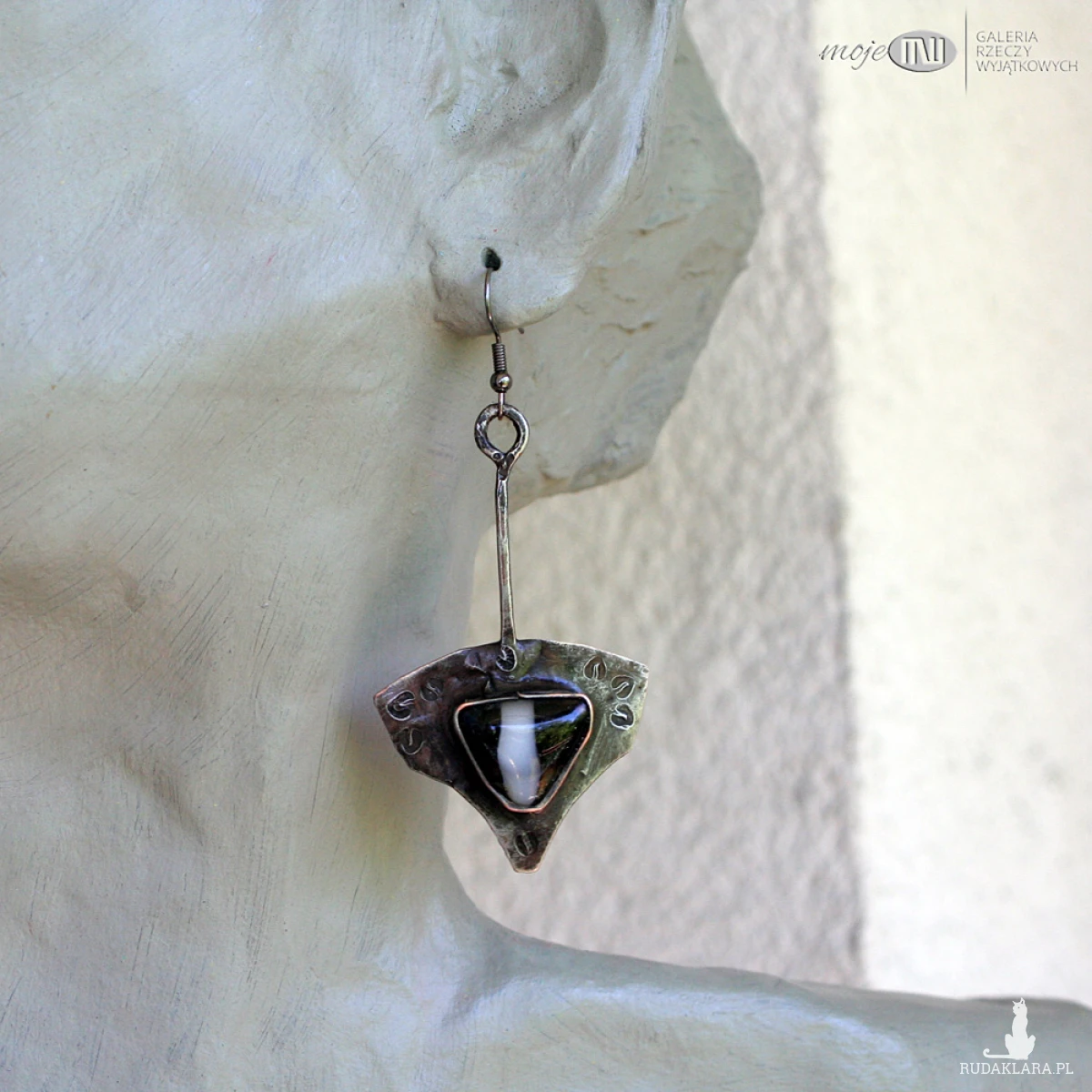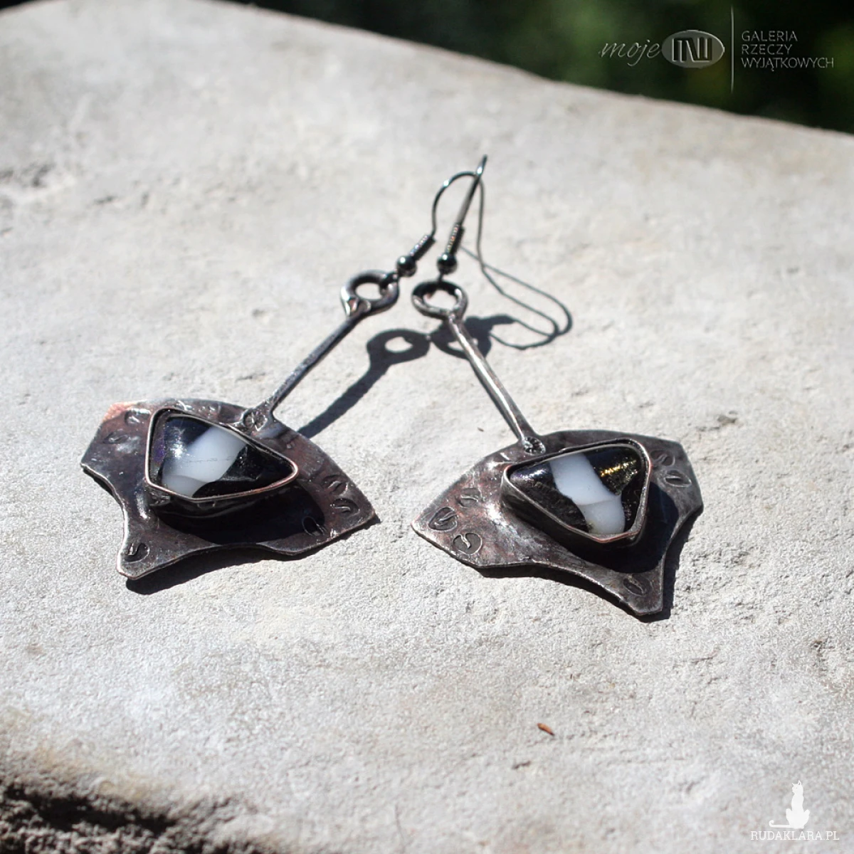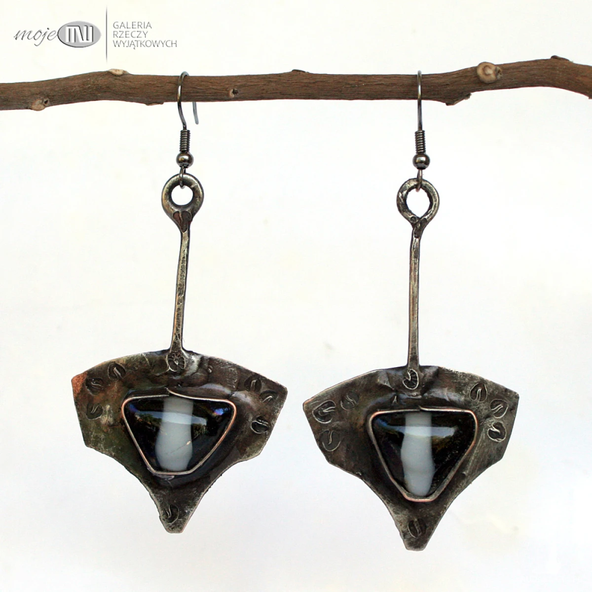 Kolczyki z miedzi pokrytej cyną, patynowanej i przecieranej oraz szklanych kaboszonów - wytopiłam je ze szkła dichroicznego, które delikatnie połyskuje wewnątrz. Zawieszone na metalowych biglach w kolorze grafitowym.