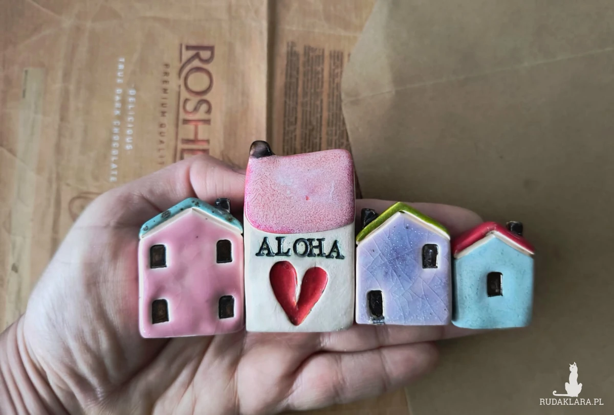Zestaw 4 domków wykonanych z gliny szamotowej wypalonych na biskwit, a następnie szkliwionych w temperaturze ok 1260 stopni C. Wysokość od 3,5 x 4 cm szer do 3,5 x 6,5 cm wys. W wesołych kolorach. idealne do postawienia na półeczce. Serdecznie polecam! Domki również do kupienia osobno.