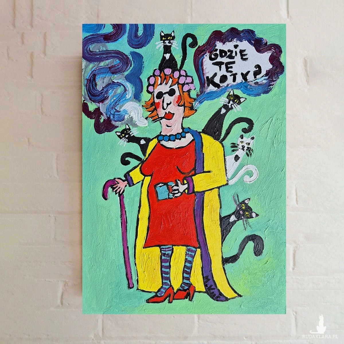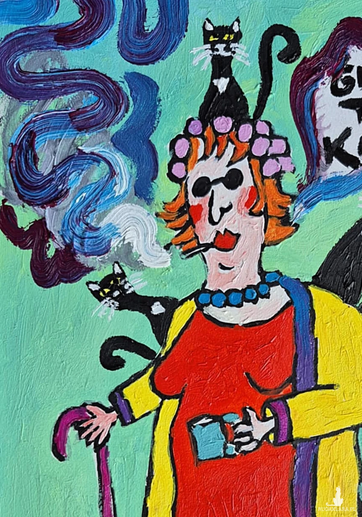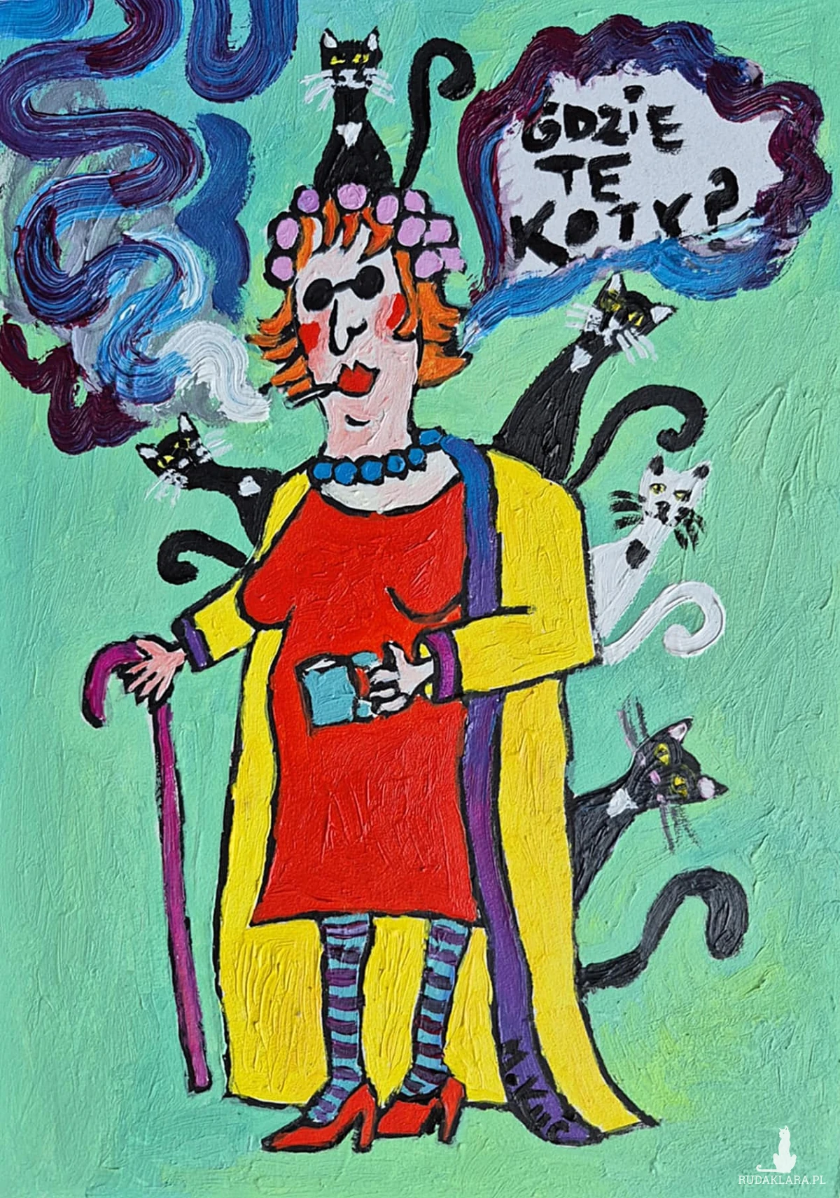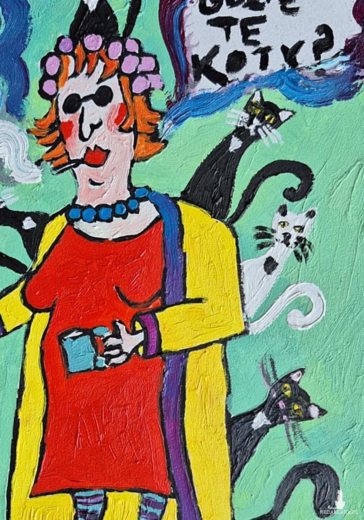 Kobieta pali papierosa, a unoszące się z niego dymy mają barwy fioletu i błękitu, jakby były malowane ruchem pędzla zanurzonego w fantazji. Z chmury dymu wyłania się napis: „Gdzie te koty?” – ironiczny, bo przecież kotów jest tu całe stado. Napis wzmocniony ekspresyjnym, surowym liternictwem dodaje całości komiksowego charakteru.