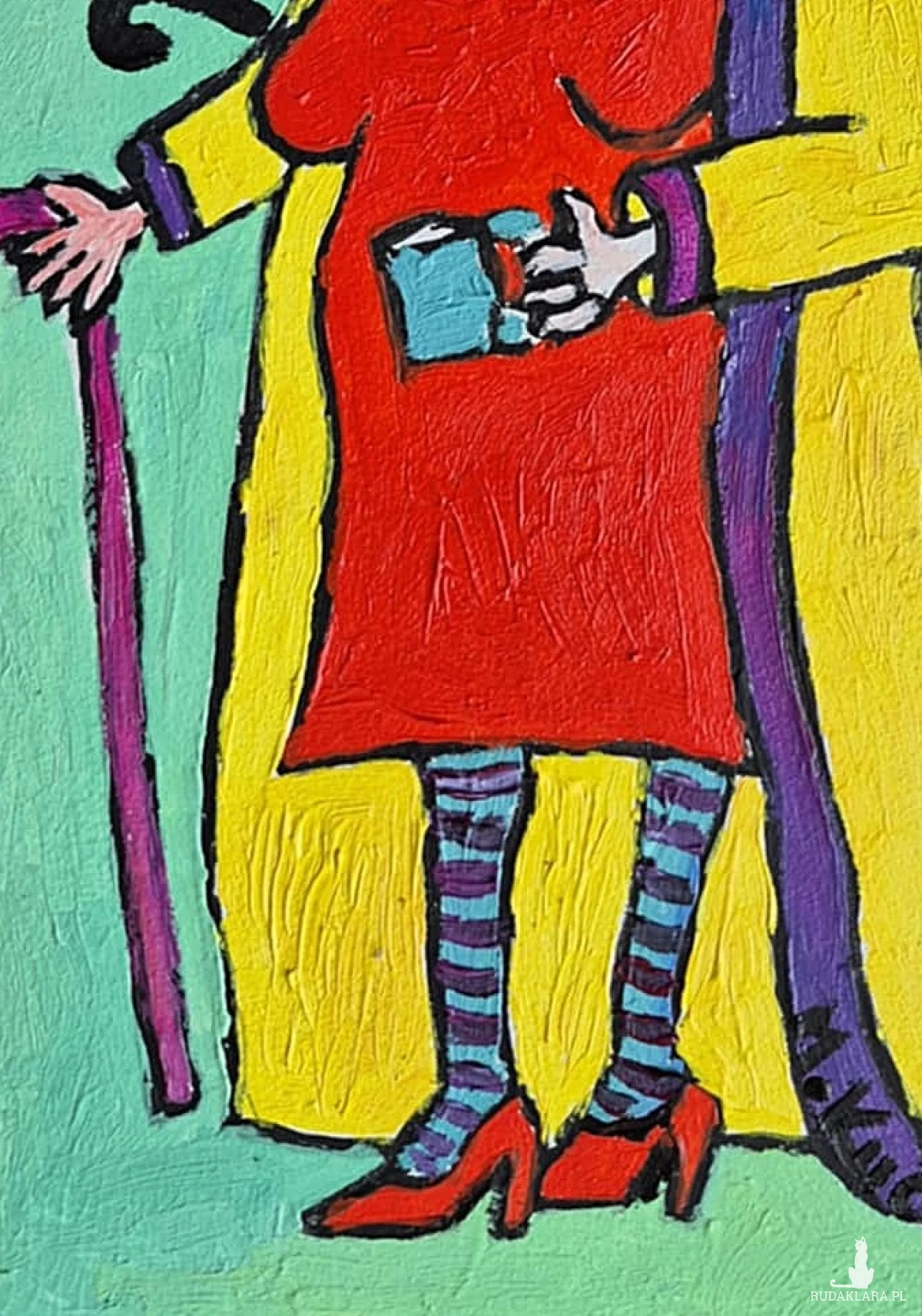 W centrum kompozycji stoi kobieta o karykaturalnych, przerysowanych proporcjach – jakby wyjęta z groteskowej opowieści. Ubrana jest w intensywne, kontrastowe barwy: żółty płaszcz z fioletową lamówką przykrywa jaskrawą czerwoną sukienkę, a na nogach ma pasiastą, błękitno-czarną bieliznę i czerwone szpilki. Całość tworzy wrażenie teatralnego kostiumu, który podkreśla jej ekscentryczną naturę.