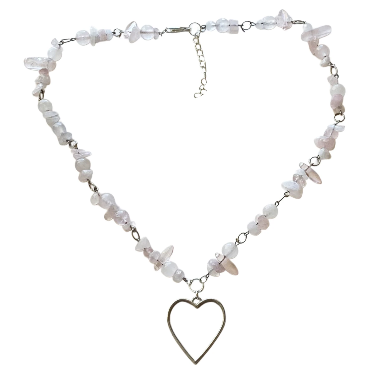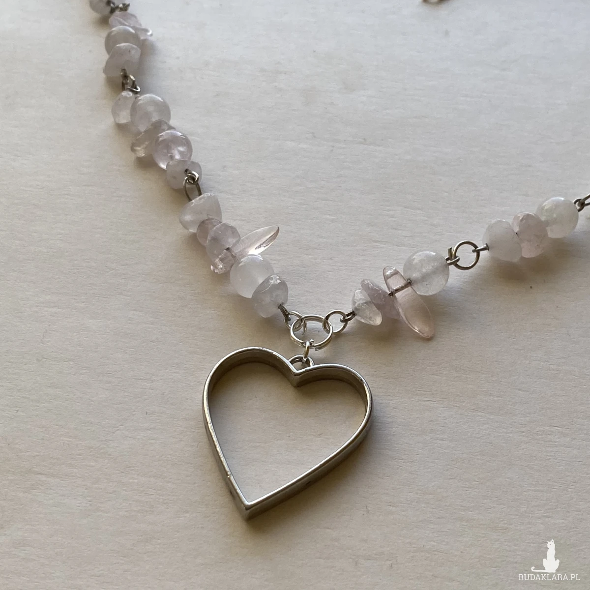 Naszyjnik z kwarcu różowego, zawieszka duże serduszko. Elementy koloru srebrnego ze stali chirurgicznej.