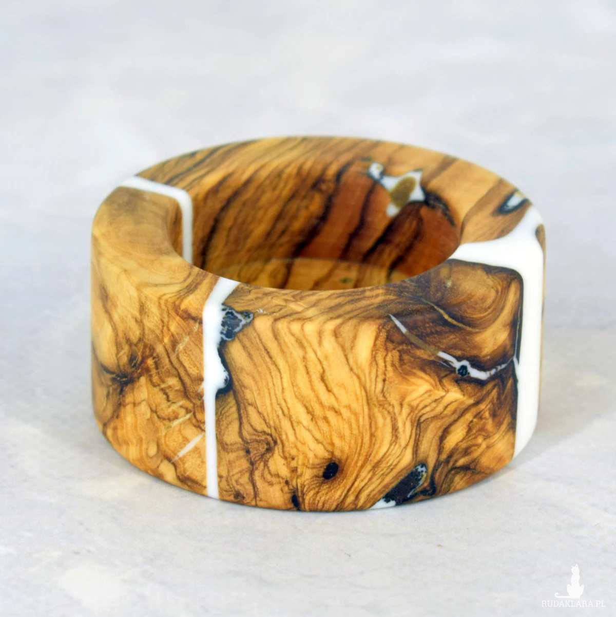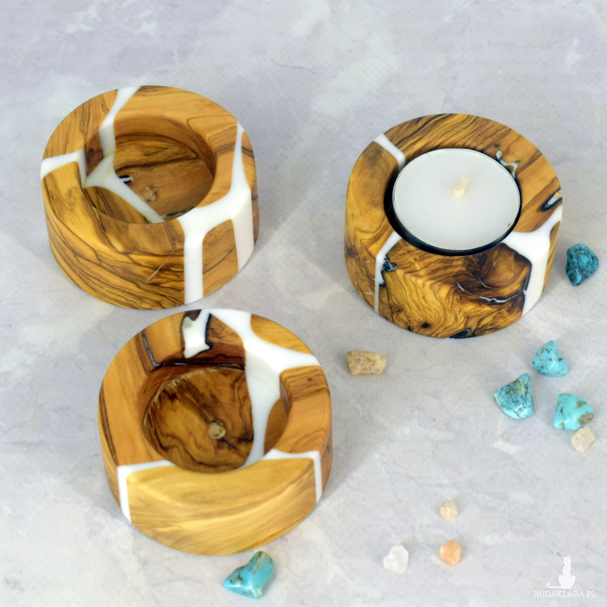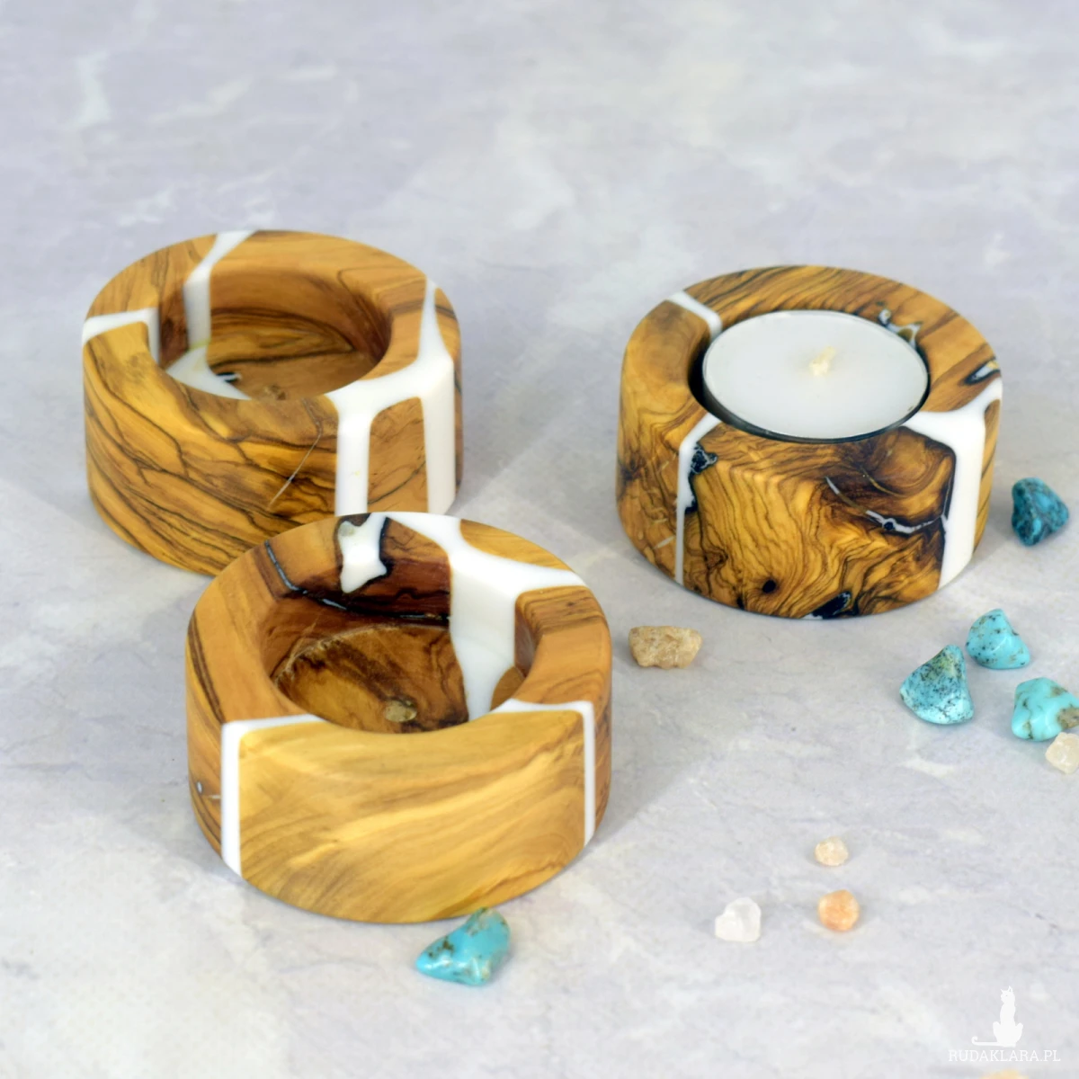 Ręcznie wykonany świecznik z kawałków drewna oliwnego połączonych białą żywicą. To idealny dodatek na długie wieczory. Naturalne usłojenie, ciepła barwa i subtelne wykończenie tworzą wyjątkową atmosferę – zarówno w salonie, jak i sypialni czy jadalni. Pasuje do standardowych świeczek typu tealight.
