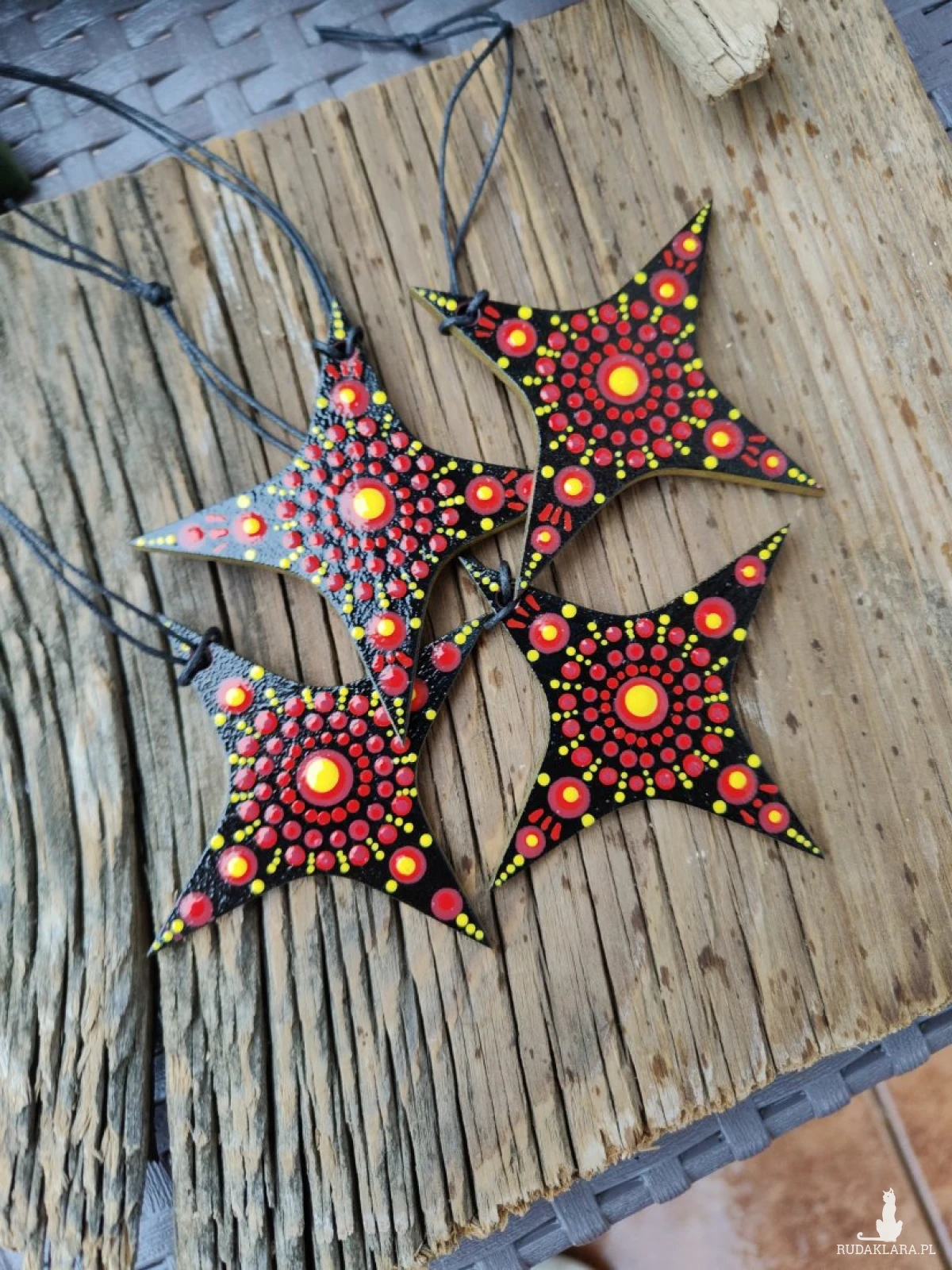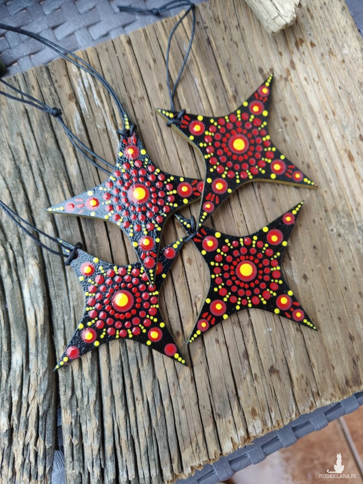 Ozdobne gwiazdki wykonane ręcznie i malowane techniką kropkowania (dot painting). Każda zawieszka jest unikatowa – zdobiona energetyczną mandalą w ciepłych odcieniach czerwieni, pomarańczu i żółci. Idealnie sprawdzi się jako dekoracja świąteczna, element wystroju domu lub prezent w rustykalnym, boho czy etnicznym stylu. Można zawiesić je na choince, w oknie, przy doniczkach lub jako ozdobę ścienną.