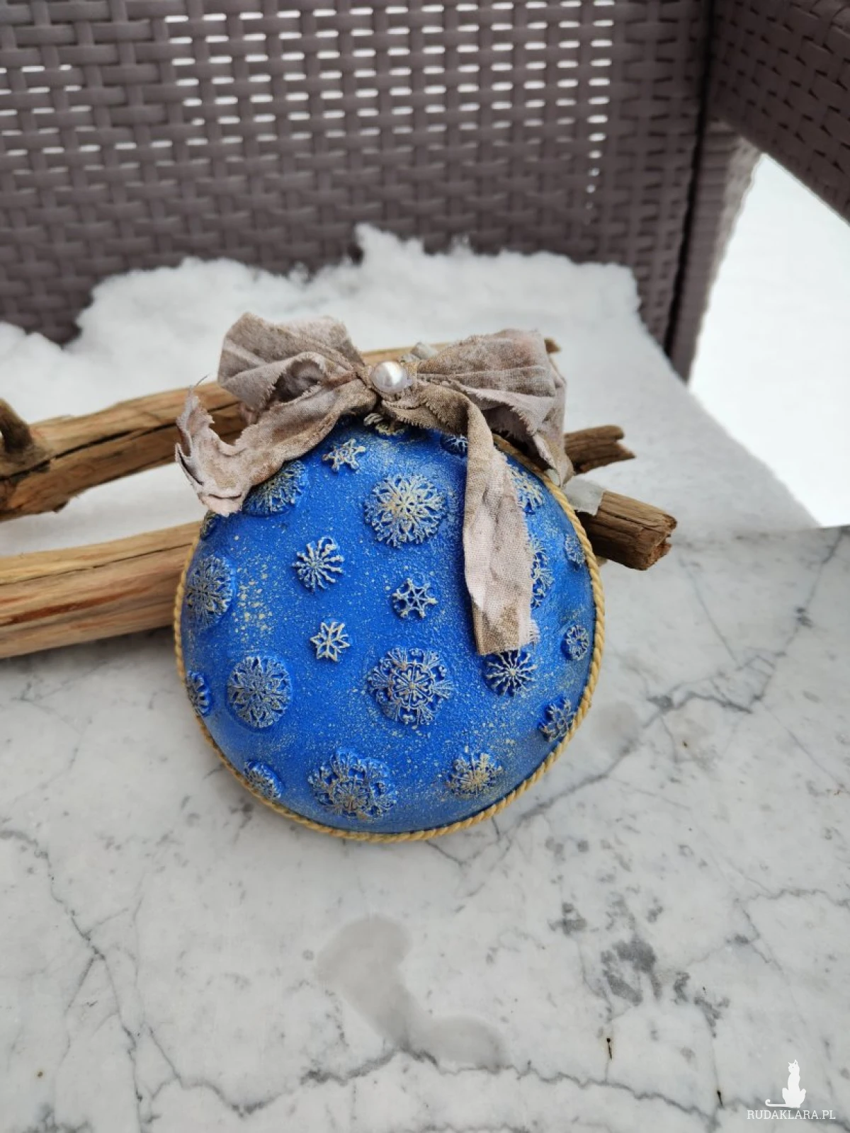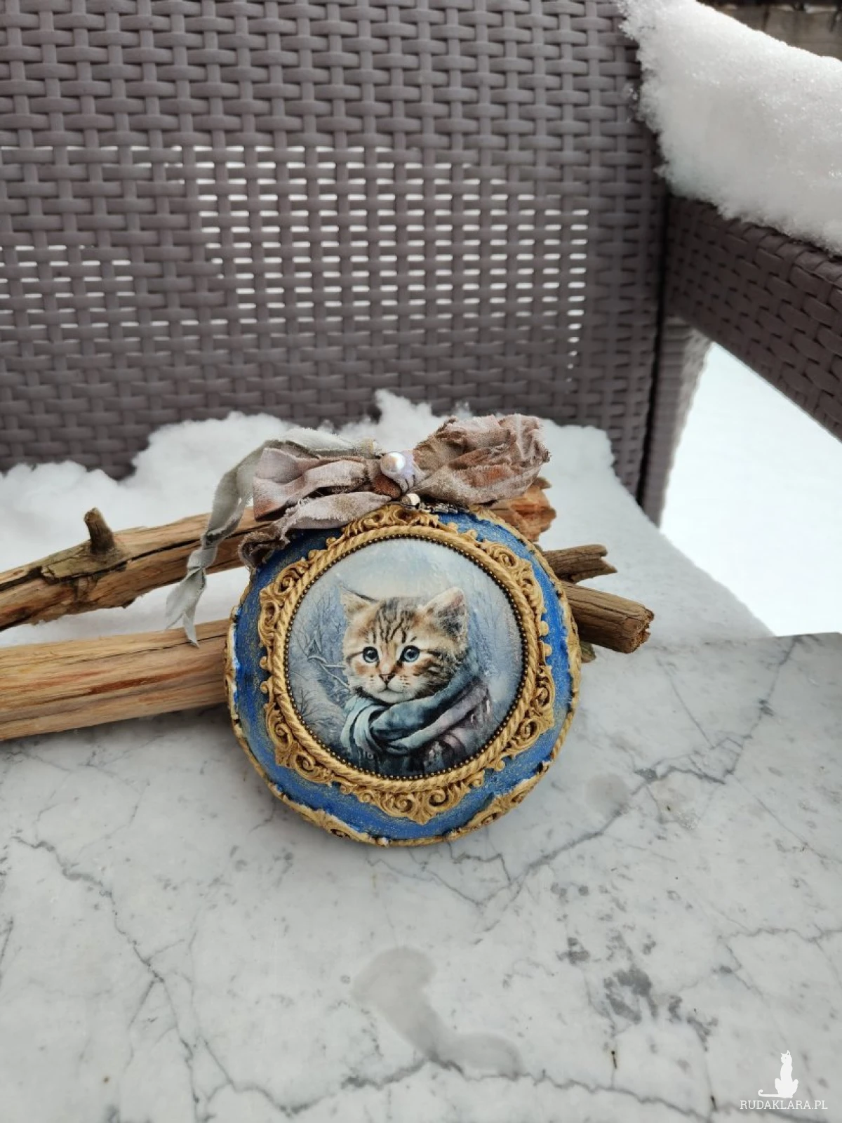 Elegancka, ręcznie zdobiona bombka o wyjątkowo przytulnym, zimowym charakterze. W centralnej części znajduje się urocza ilustracja kotka otulonego szalem, osadzona w dekoracyjnej, złoconej ramce. Całość dopełniają miękkie, materiałowe kokardy w odcieniach szarości i beżu, które nadają ozdobie szlachetnego, vintage’owego wyglądu. Bombka idealnie sprawdzi się jako nastrojowa dekoracja choinki, stroika lub jako prezent dla miłośników kotów i stylu retro.
