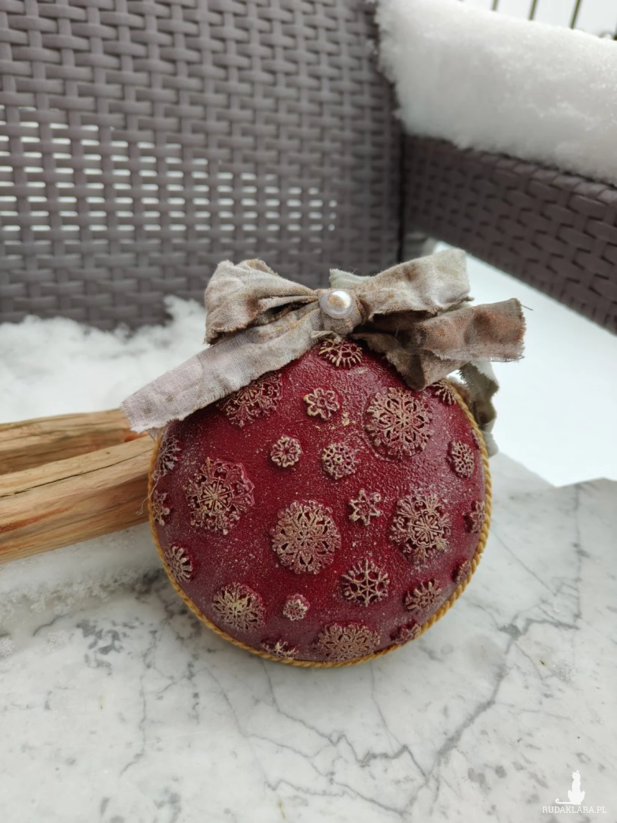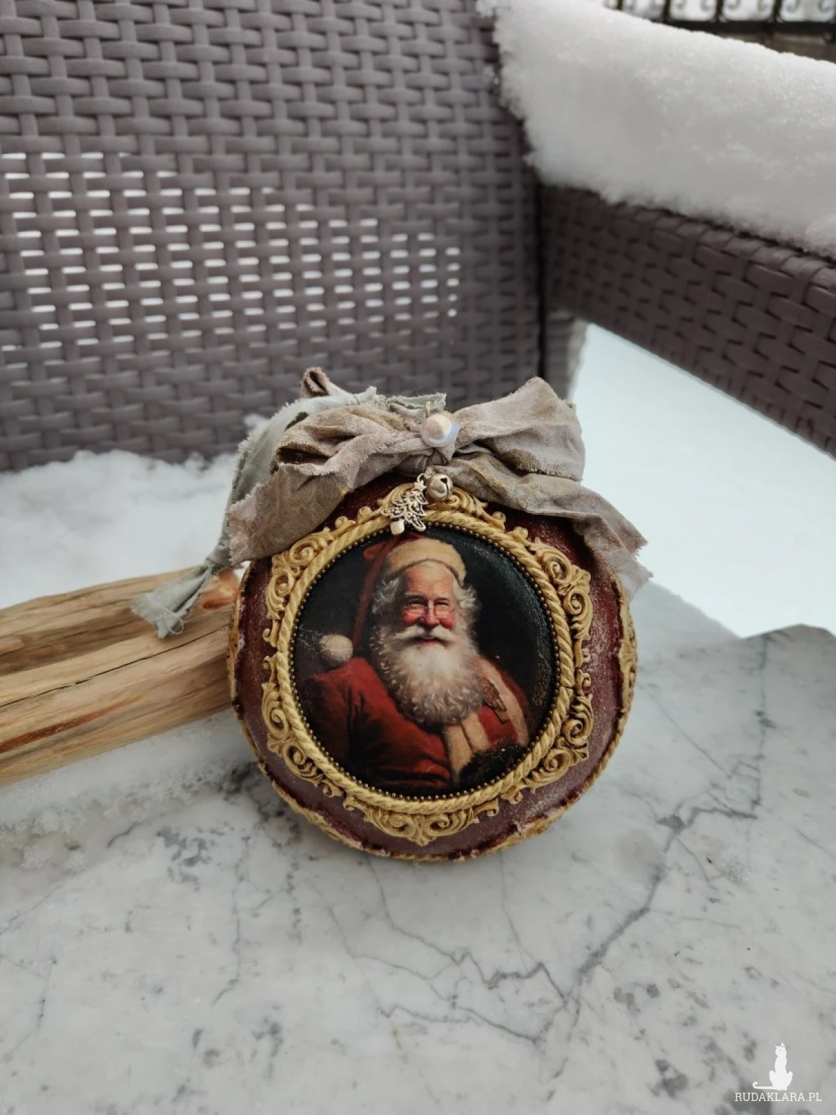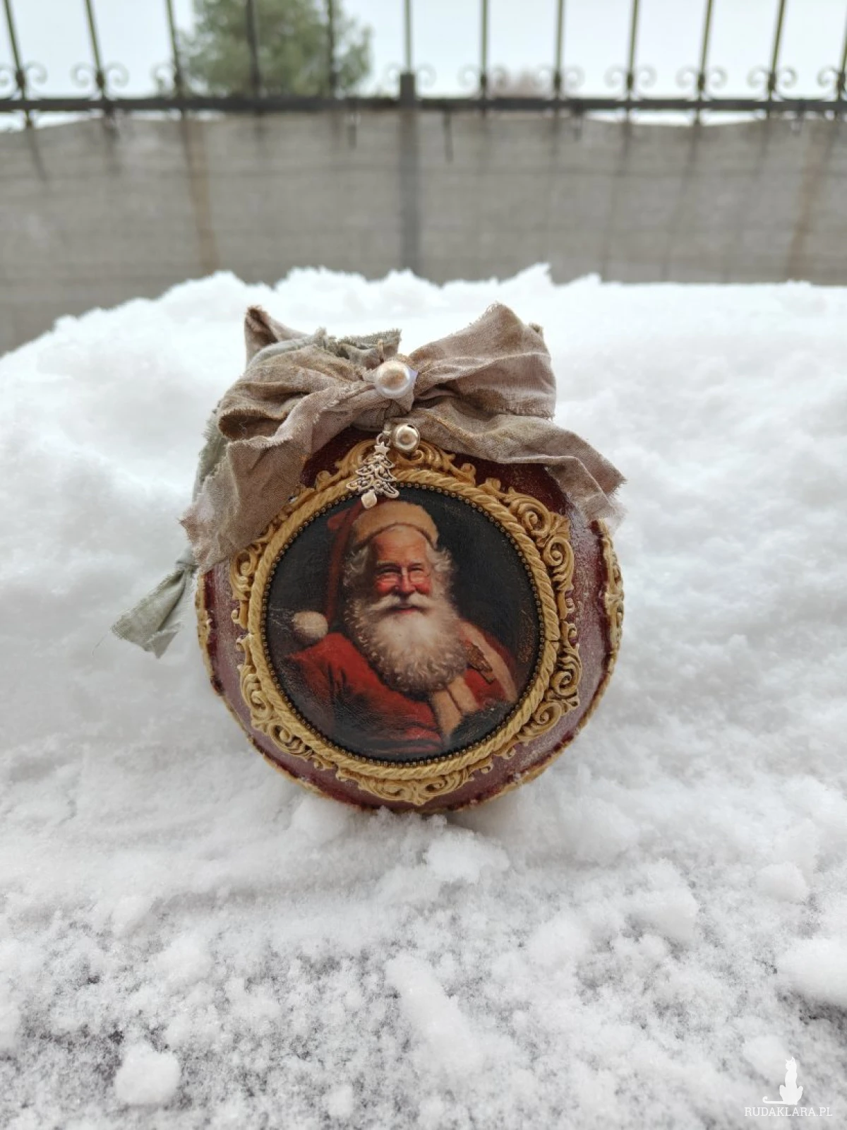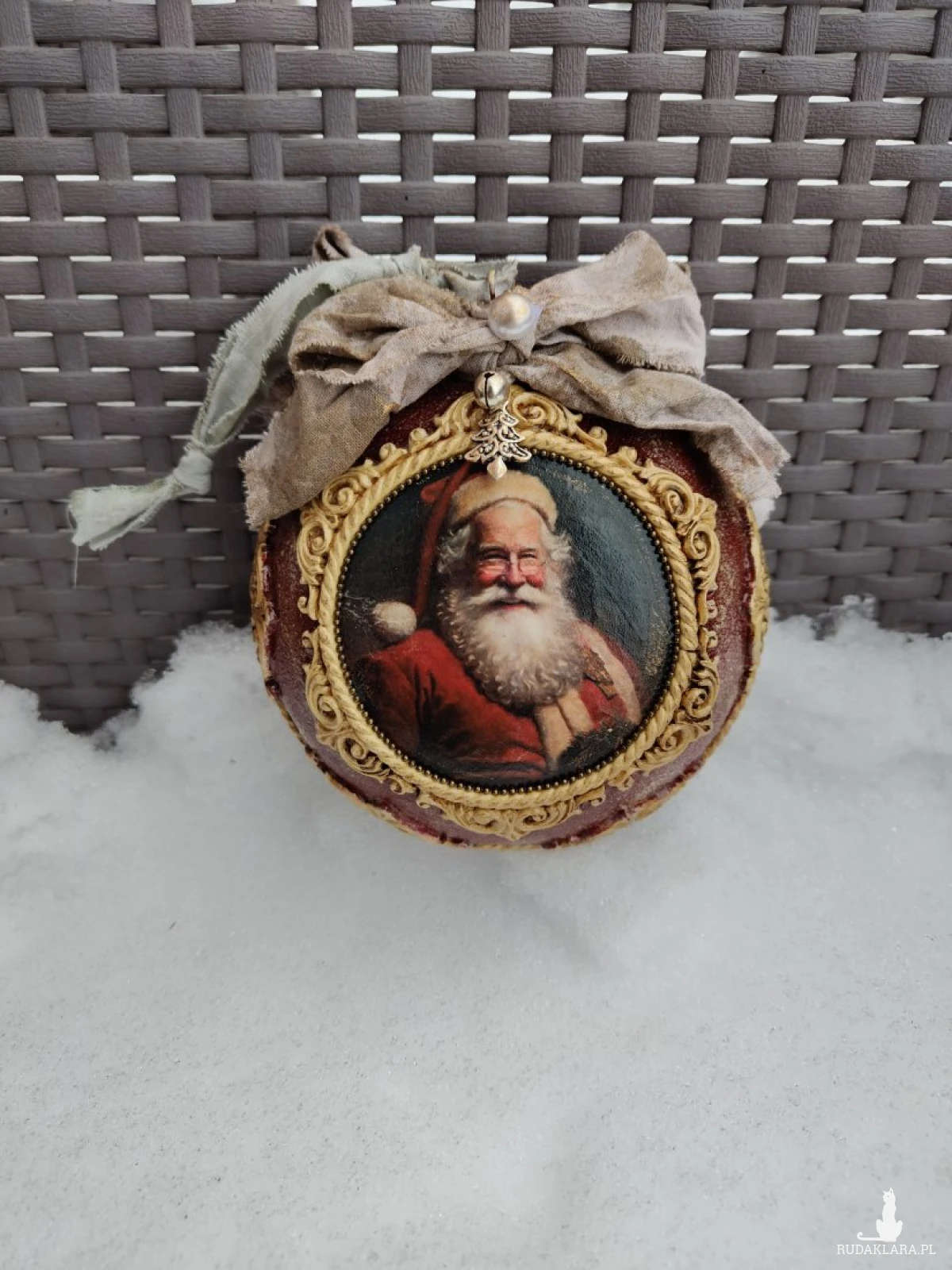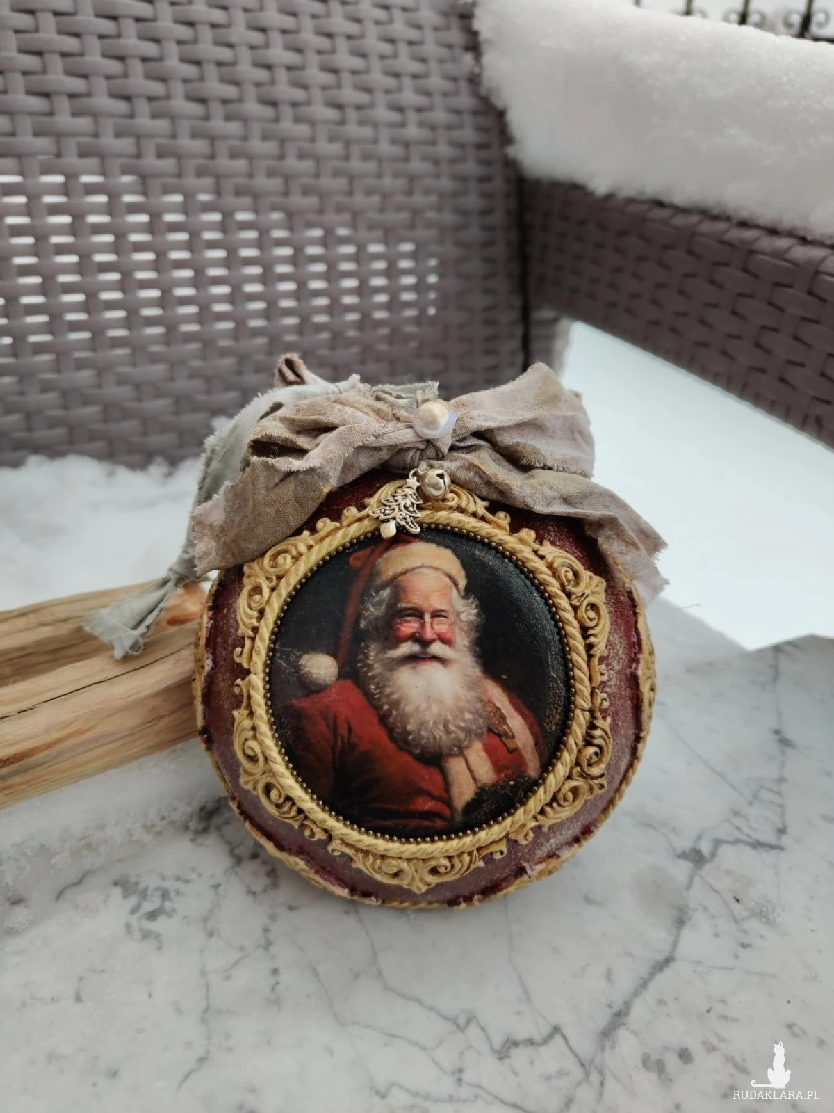 Ręcznie zdobiona bombka o klasycznym, vintage’owym charakterze, przedstawiająca uśmiechniętego Świętego Mikołaja w otoczeniu dekoracyjnej, złotej ramki. Całość utrzymana jest w ciepłych, tradycyjnych barwach świątecznych. Ozdobę wykończono dużą, stylową kokardą oraz subtelnymi metalowymi zawieszkami, co nadaje jej elegancki, rustykalny wygląd. Bombka idealnie sprawdzi się jako wyjątkowy akcent na choince, świątecznym stroiku lub jako prezent.